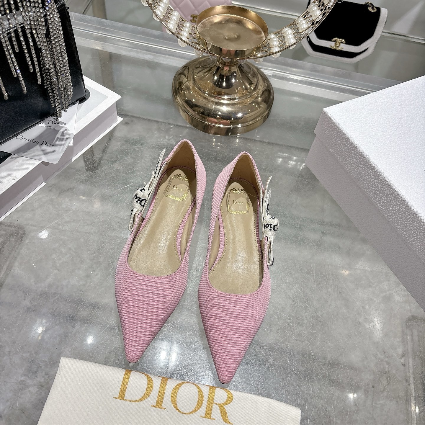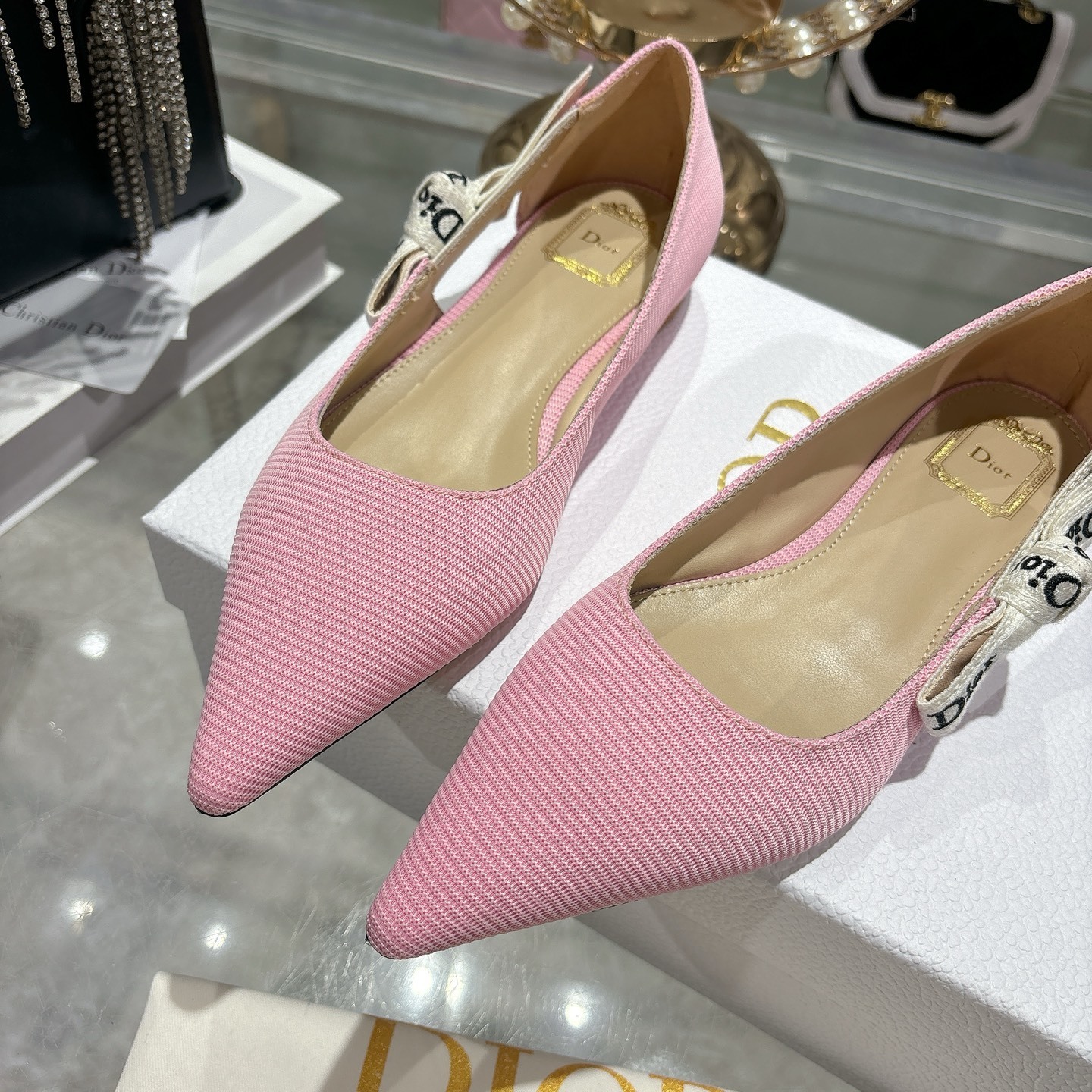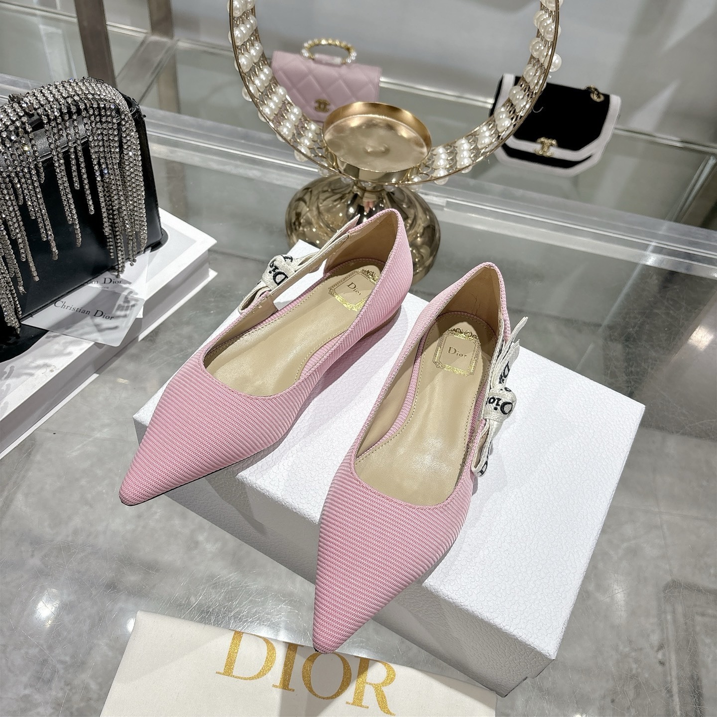 The Dior Pink Textured Pointed Ballet Flats embody delicate femininity with a refined and modern silhouette. Crafted from premium textured fabric in a soft blush pink tone, this elegant design is elevated by the iconic Dior embroidered ribbon bow, adding a signature touch of Parisian luxury.