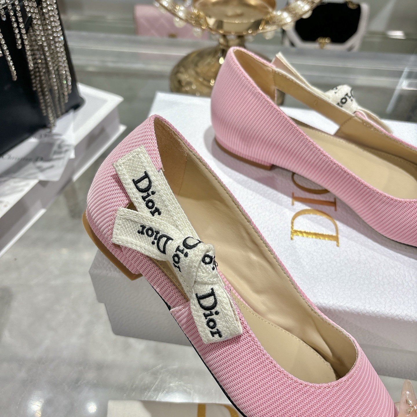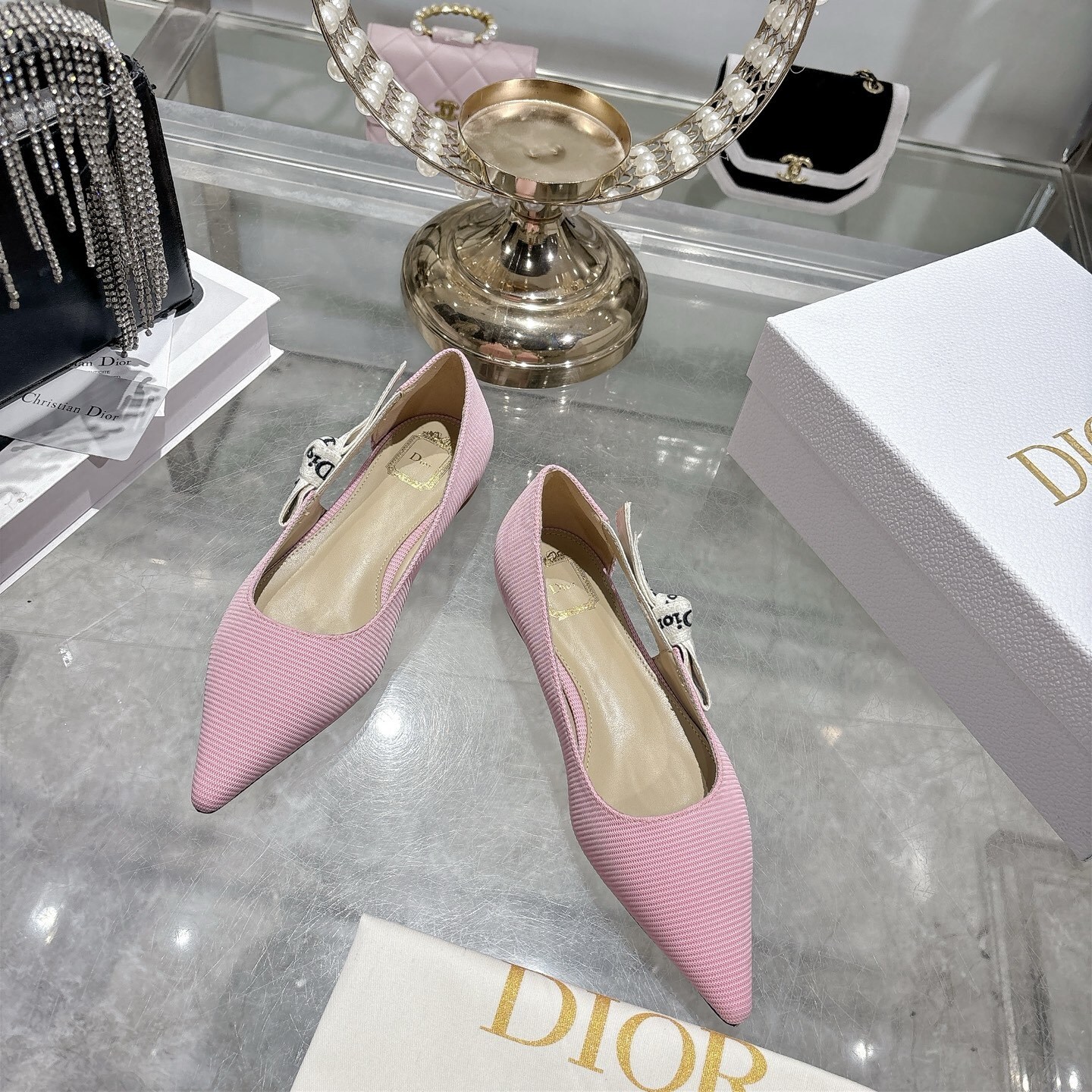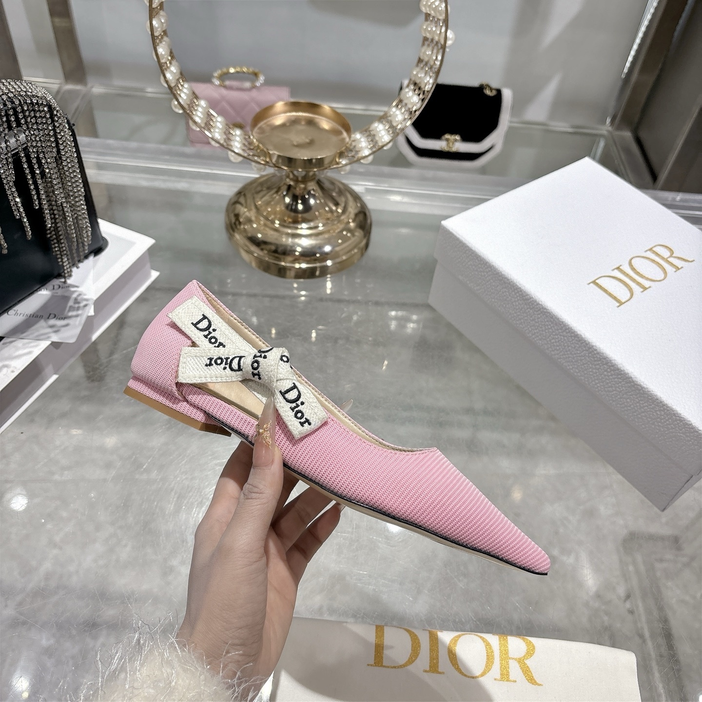 The Dior Pink Textured Pointed Ballet Flats embody delicate femininity with a refined and modern silhouette. Crafted from premium textured fabric in a soft blush pink tone, this elegant design is elevated by the iconic Dior embroidered ribbon bow, adding a signature touch of Parisian luxury.