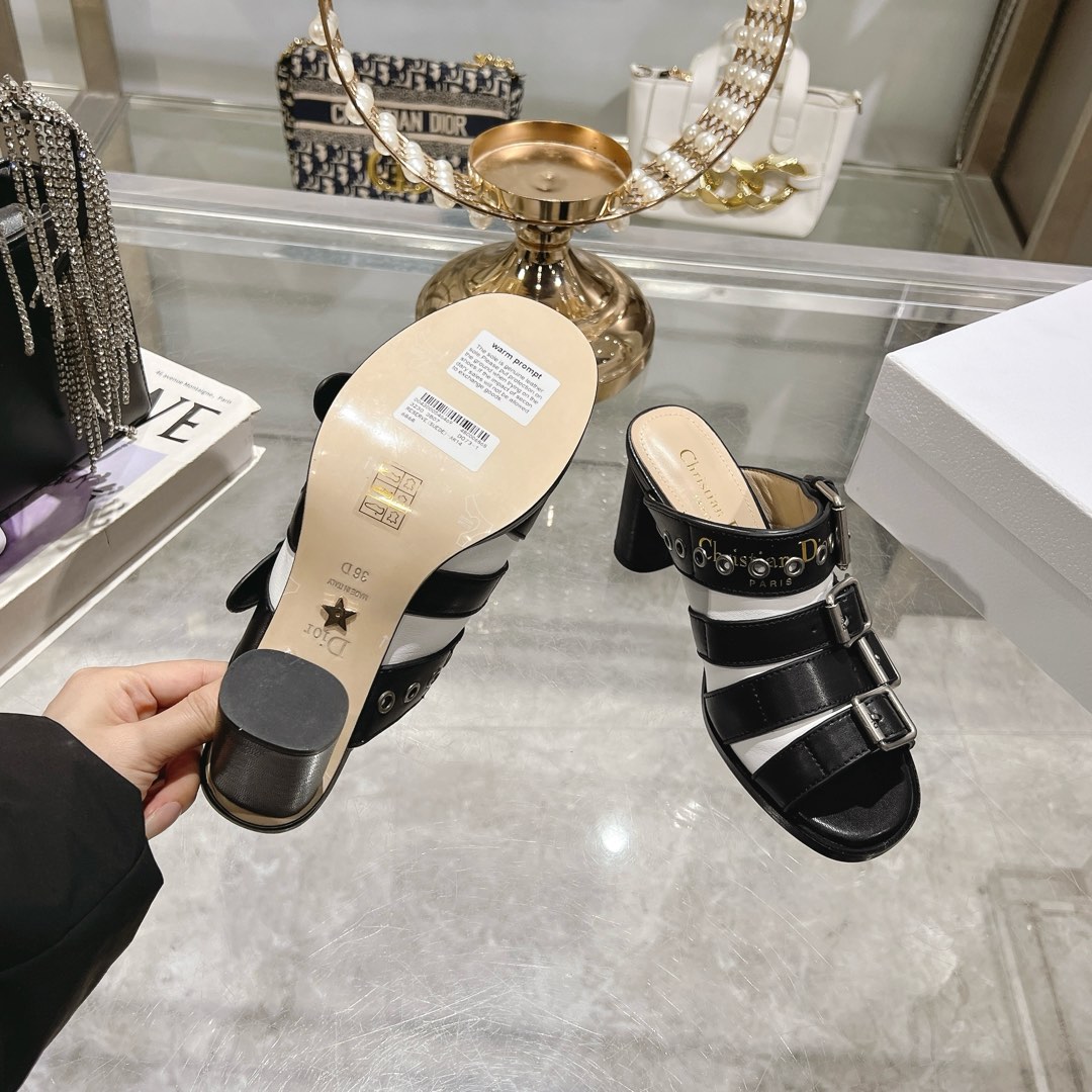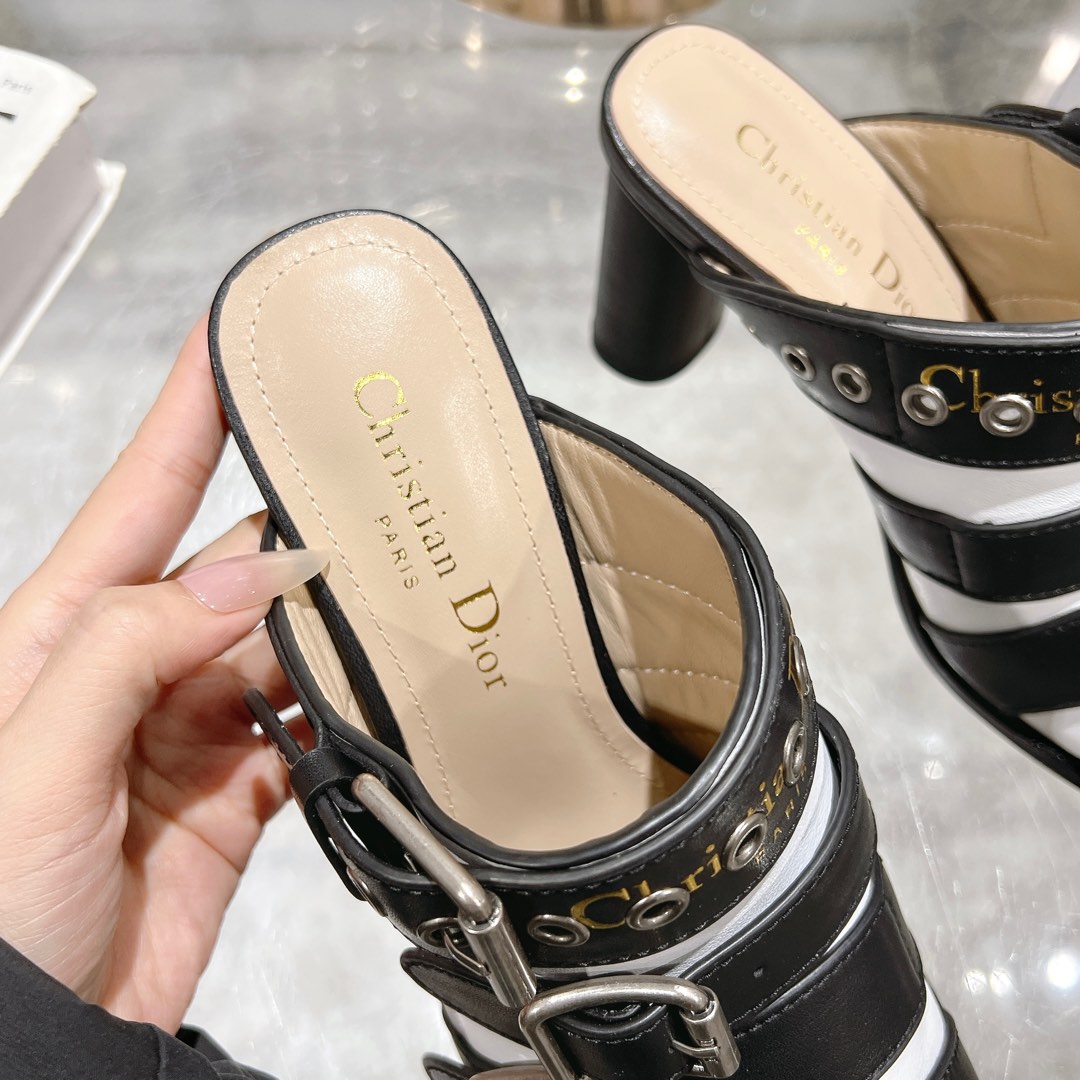 The Dior Punk Heeled Slide delivers bold, contemporary elegance for Cruise 2025. Crafted from luxurious black and white calfskin, this statement slide is accentuated by striking straps adorned with silver-finish metal buckles and a distinctive gold-tone Christian Dior Paris signature on the eyelet strap. Set on an 8-cm (3-inch) cylindrical heel, it effortlessly adds a couture-inspired edge to your seasonal wardrobe.