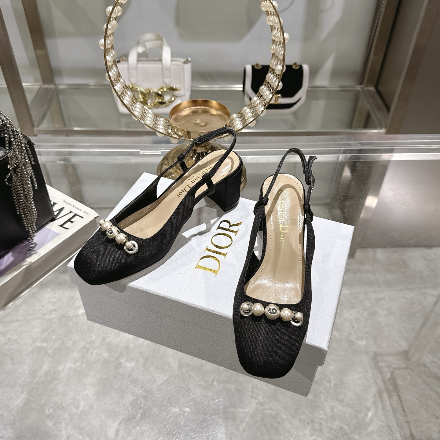 The standout feature is the front embellishment: an elegant row of mixed pearls and polished metal beads, two of which are engraved with the iconic CD (Christian Dior) logo, adding a luxurious signature touch. The slingback strap is adjustable for a secure fit, subtly enhancing the minimalist structure.