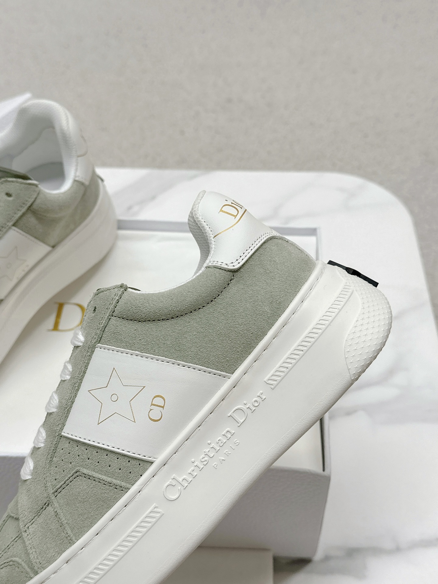 Soft sage suede panels contrast beautifully with smooth white calfskin in this understated yet stylish Dior Star Sneaker. The colorway channels organic tones, making it a versatile option for neutral and earthy wardrobes. On the side, a tonal white star patch and “CD” lettering nod to Dior’s heritage with minimalist flair. A chunky white rubber sole brings both support and a touch of streetwear edge.