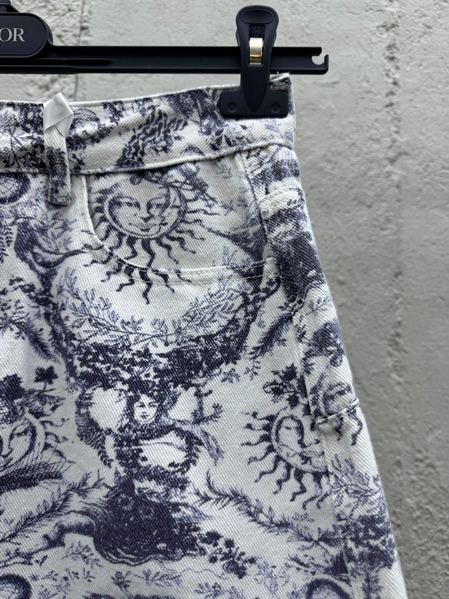 Radiate sunny vibes with this eye-catching white denim mini skirt featuring a unique navy blue sun print. The intricate celestial-inspired design adds a touch of artistic flair to this stylish piece. Crafted from comfortable denim fabric, this mini skirt is perfect for embracing the warmth of spring and summer days. Pair it with your favorite tops for a chic and playful look.