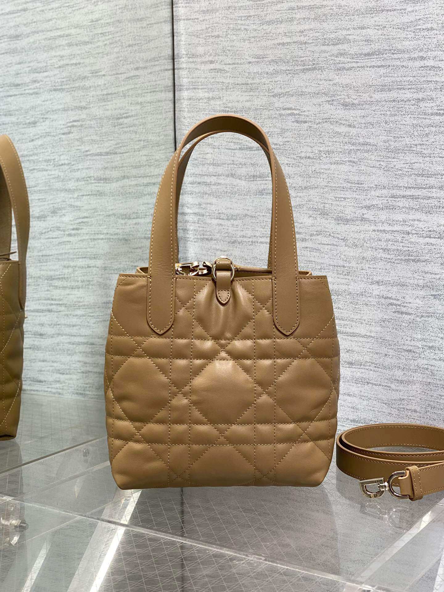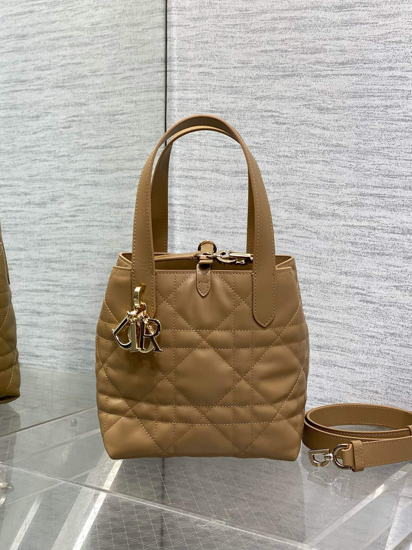 - Features: Cannage quilting, drawstring closure, dual top handles, detachable crossbody strap, gold-tone Dior charms