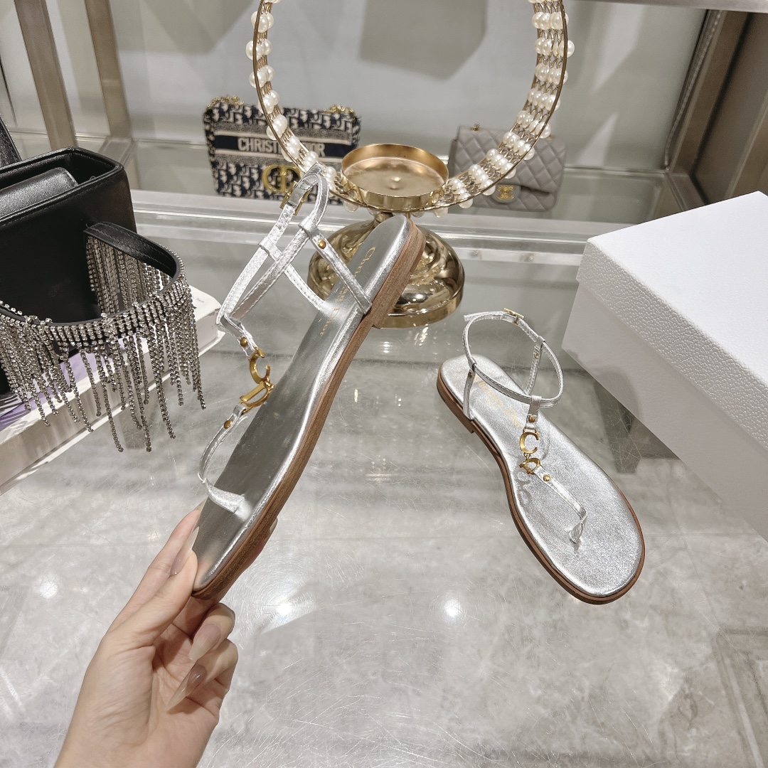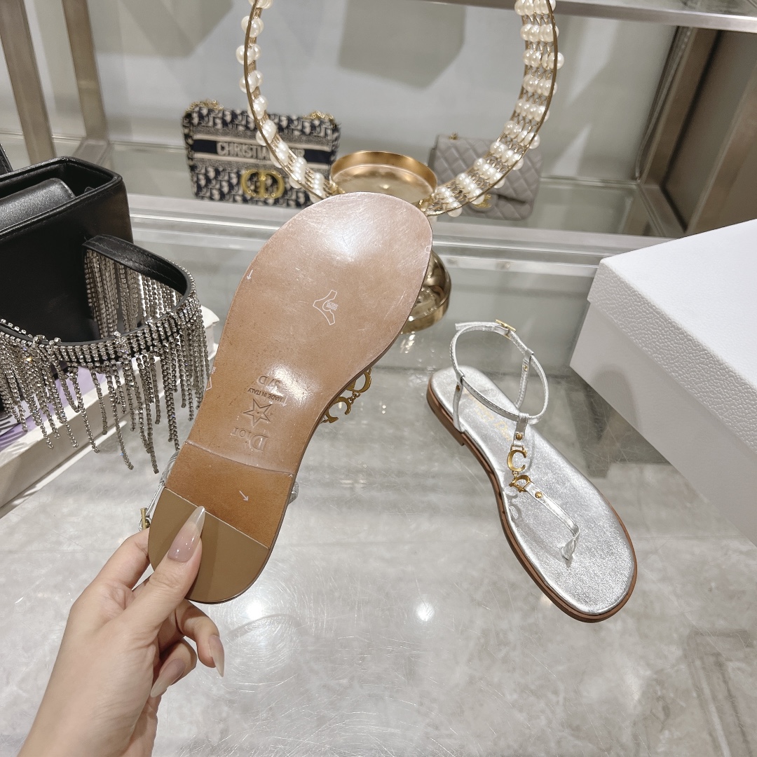 Shimmer with every step in the Dioriviera C’est Dior Thong Sandals in dazzling silver calfskin. Designed to add a radiant touch to your summer wardrobe, these sandals feature a sleek metallic finish, a minimalist flat sole, and a refined toe post for a barely-there feel. The gold-tone CD logo embellishment adds an extra layer of luxury, while the adjustable ankle strap ensures a flawless fit. Perfect for glamorous getaways and evening resort strolls.