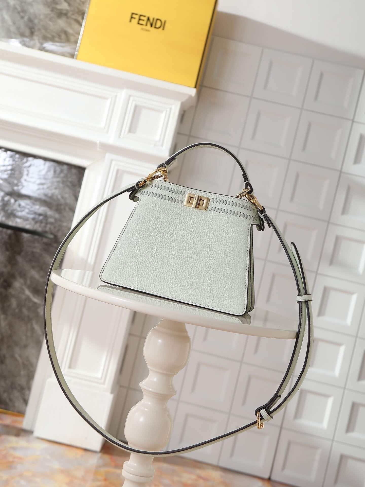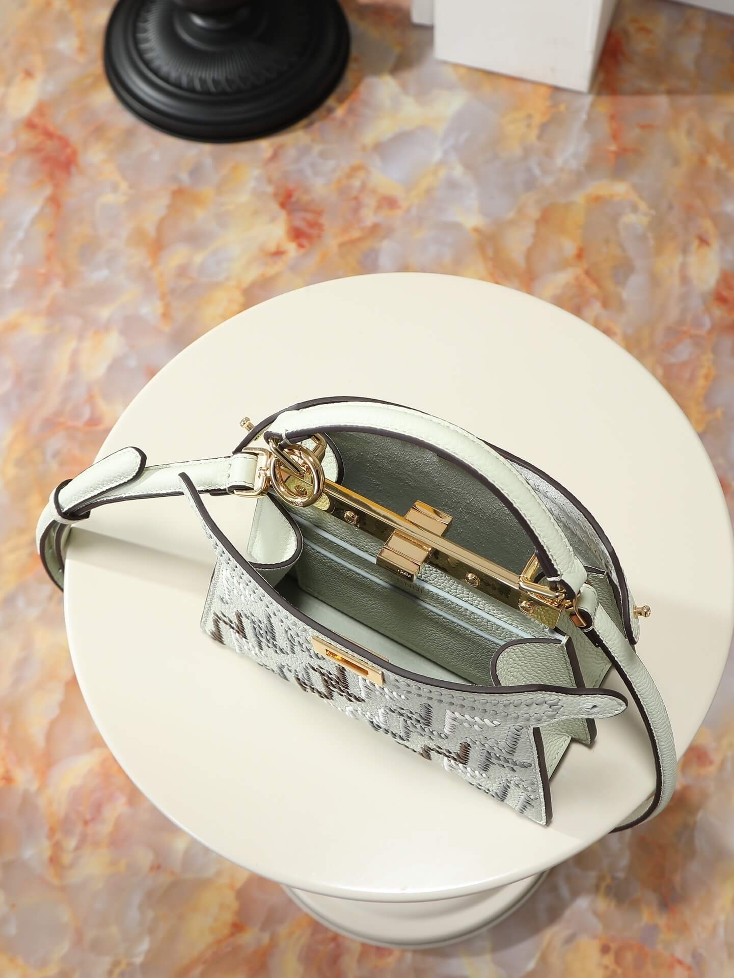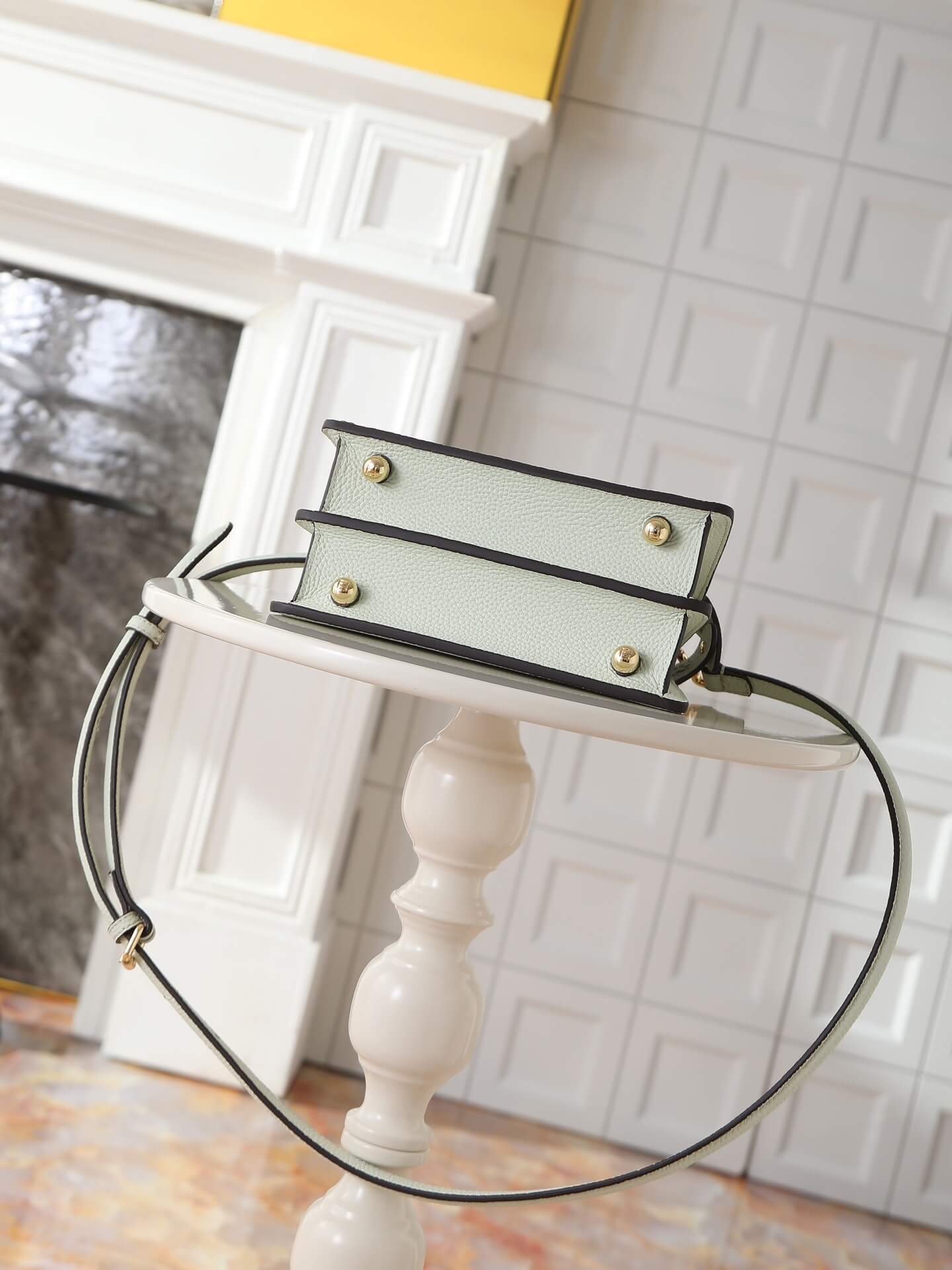 The Fendi Peekaboo ISeeU Small Mint Green Leather Bag with Interlace FF Motif and Top Handle is a stylish blend of contemporary elegance and signature Fendi craftsmanship. Designed with the recognizable Peekaboo silhouette, this compact handbag delivers a refined structure while maintaining a modern and fashionable aesthetic.