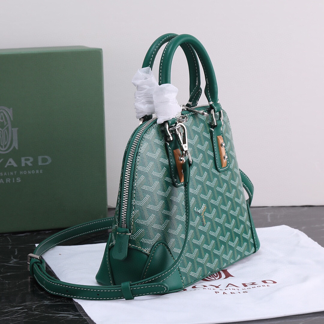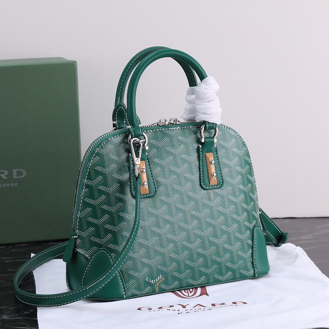 The Goyard Vendôme Mini Tote Bag in Green Goyardine Canvas embodies timeless Parisian sophistication with a modern edge. Inspired by the architectural beauty of Place Vendôme, this structured dome-shaped bag is crafted from the Maison’s iconic hand-painted Goyardine coated canvas, paired with smooth green leather trim and silver-tone hardware.