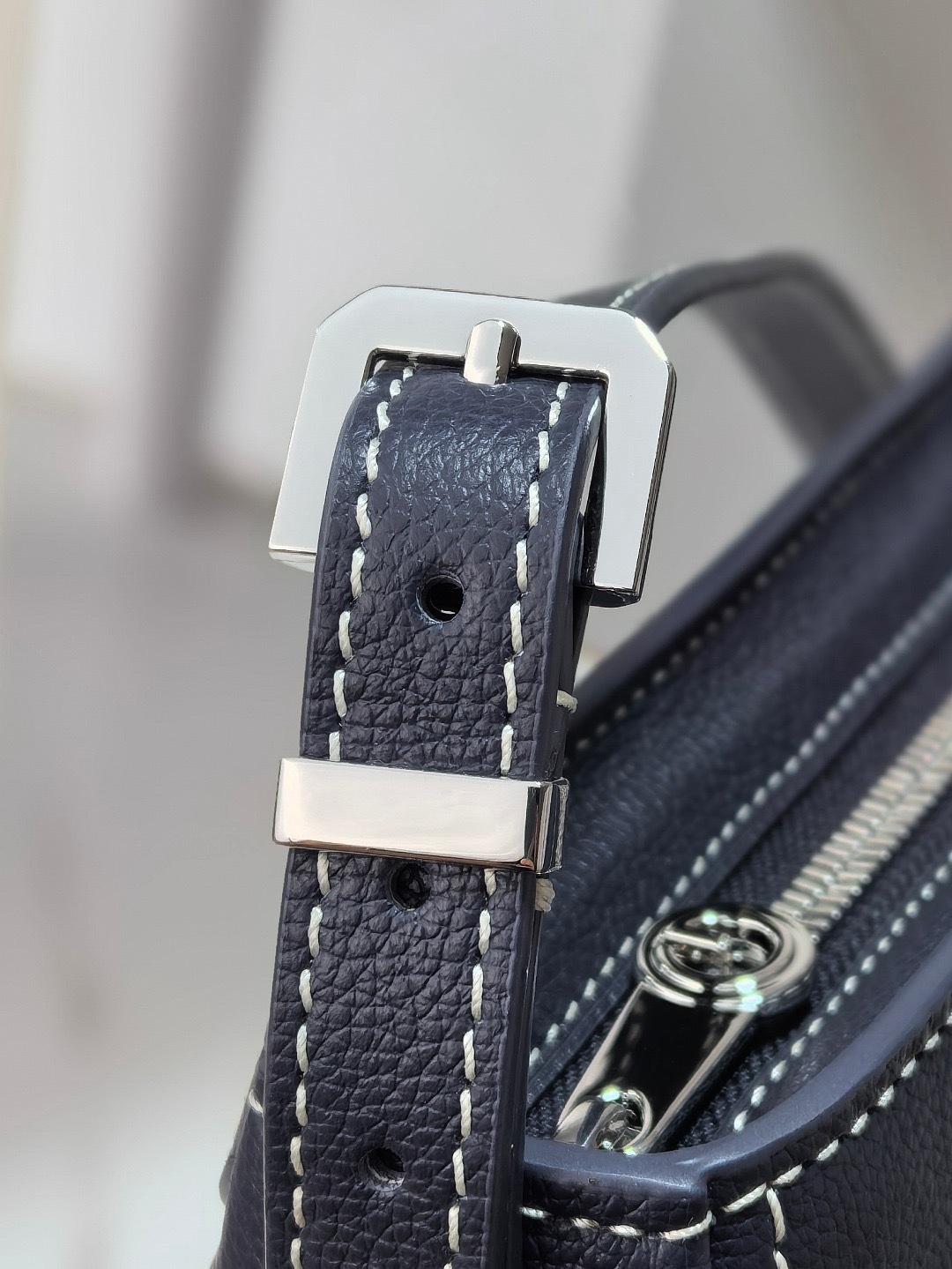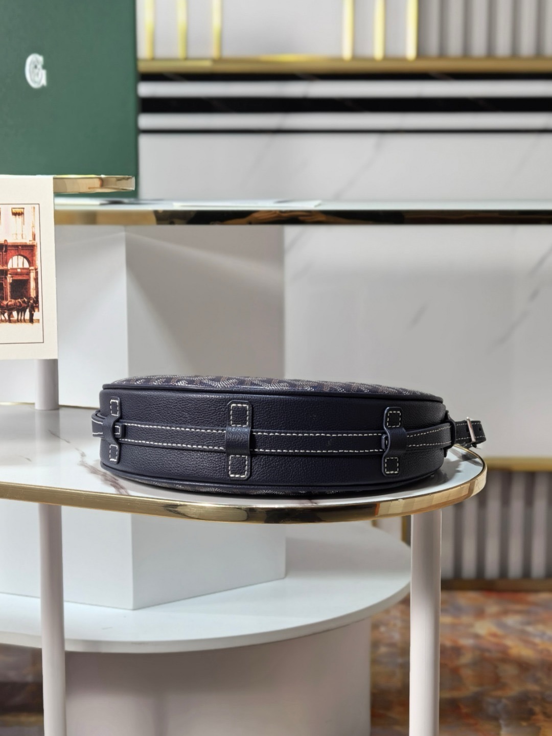 Its distinctive half-moon silhouette offers a chic, contemporary twist, while the top zipper closure ensures your essentials stay secure. The bright yellow fabric interior adds a signature Goyard touch, offering a striking contrast to the sleek black exterior. The adjustable leather strap allows for comfortable crossbody or shoulder wear, making it perfect for both day and evening outings.