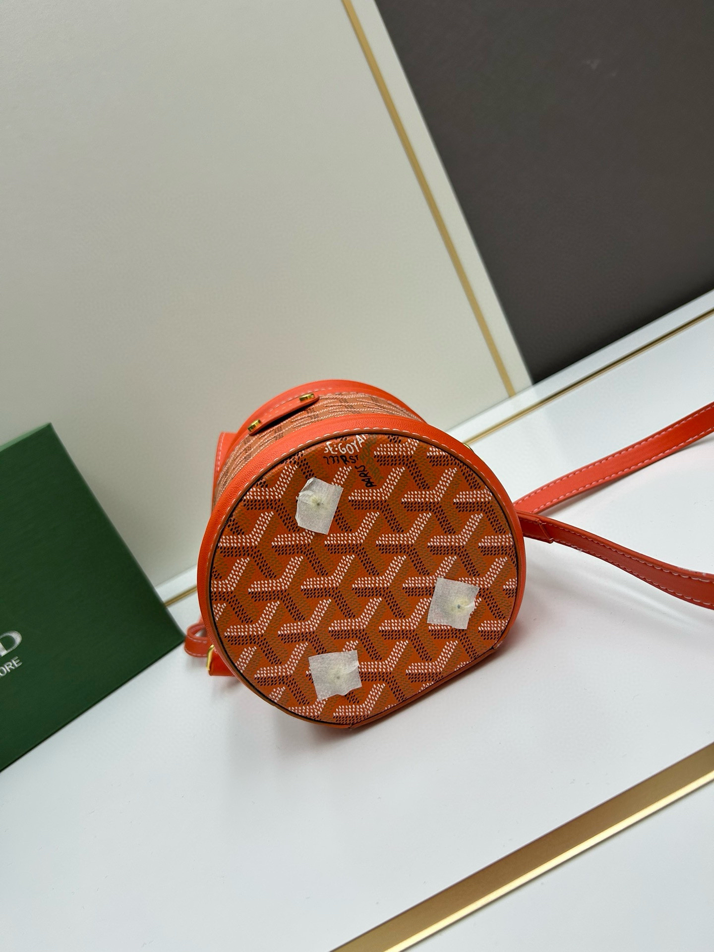 Its compact cylindrical silhouette features a zip-around closure that opens to a bright yellow interior — a hallmark of Goyard craftsmanship. Designed with both a top handle and a detachable, adjustable strap, it can be styled as a chic top-handle bag or a convenient crossbody.
