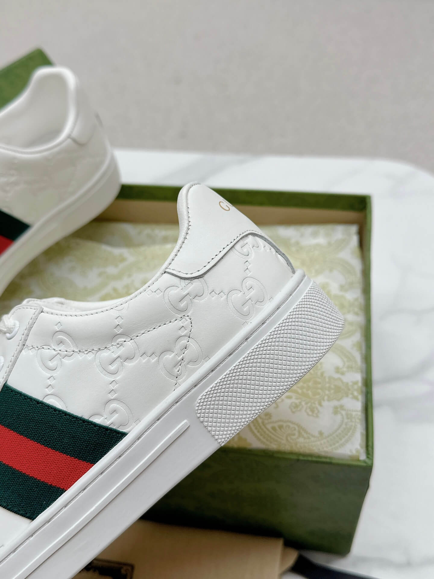 Indulge in the perfect mix of chic and sporty with these sleek white sneakers, made for the woman who loves a touch of refinement in her everyday style. The embossed GG pattern subtly catches the light, while the classic web stripe brings a timeless edge that makes every outfit feel effortlessly put together. Whether paired with casual denim or a playful dress, these sneakers are the perfect go-to for stepping out with confidence and charm.
