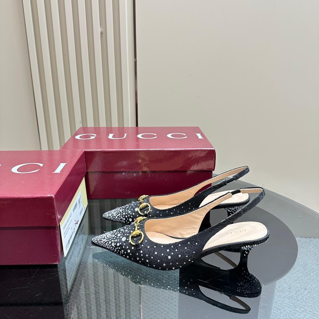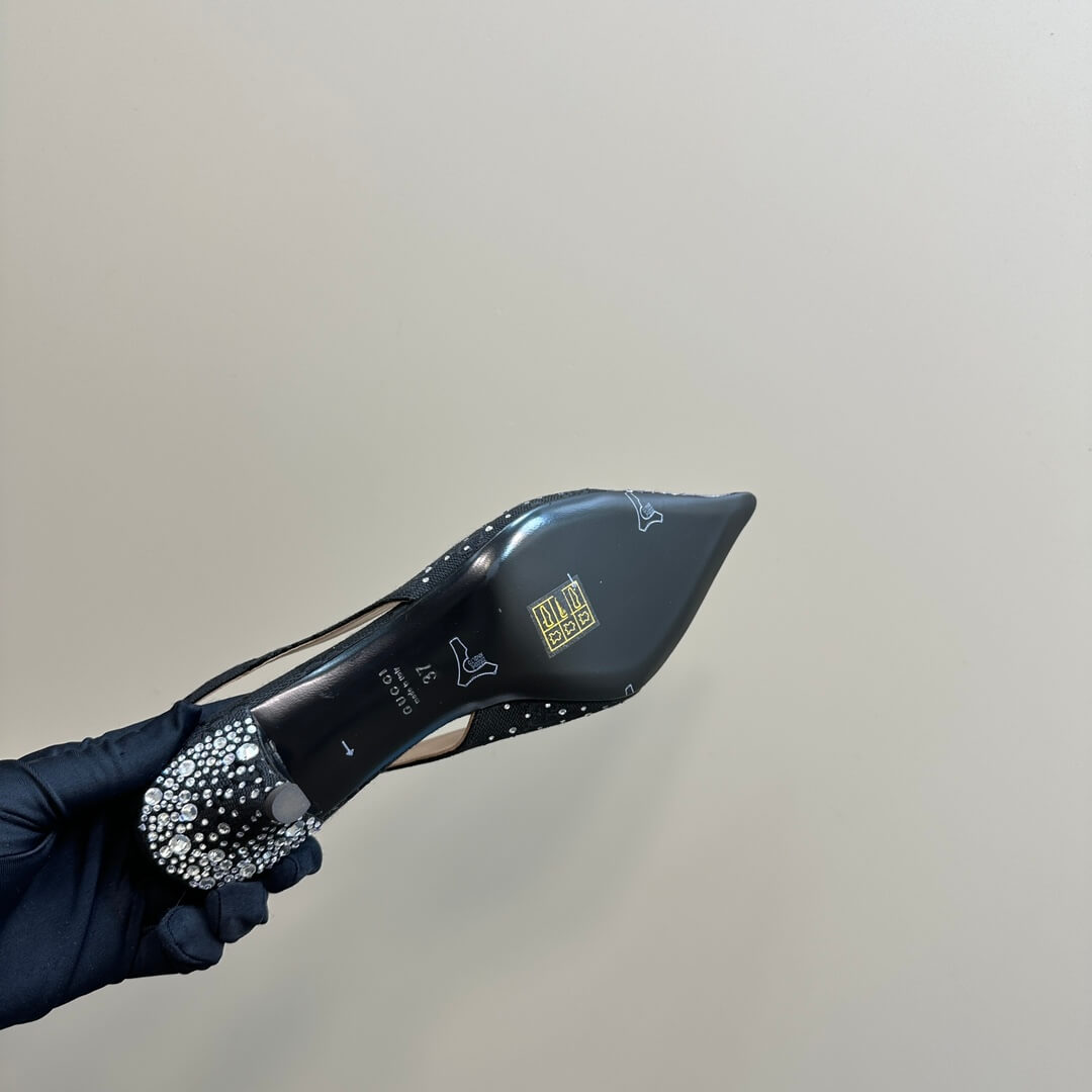 Dazzle with every step in these stunning Gucci black crystal-embellished slingback kitten heels. Designed for those who appreciate timeless elegance with a touch of glamour, these heels feature a sleek pointed toe, Gucci’s signature gold-tone Horsebit detail, and a dazzling crystal gradient that cascades across the toe box and heel. The comfortable kitten heel ensures effortless sophistication, perfect for evening soirées or elevating your daytime look. Shimmer, shine, and make a statement in true luxury.