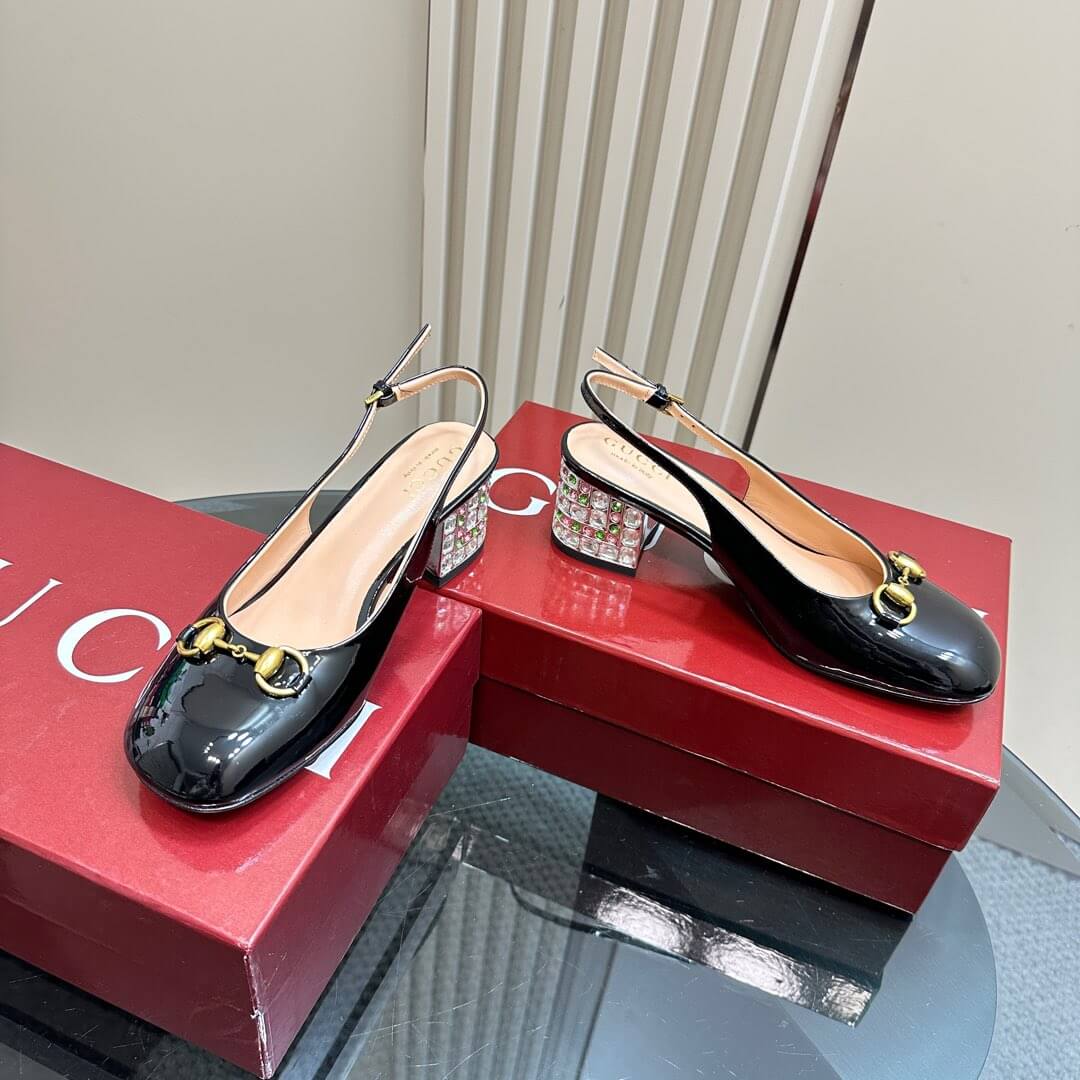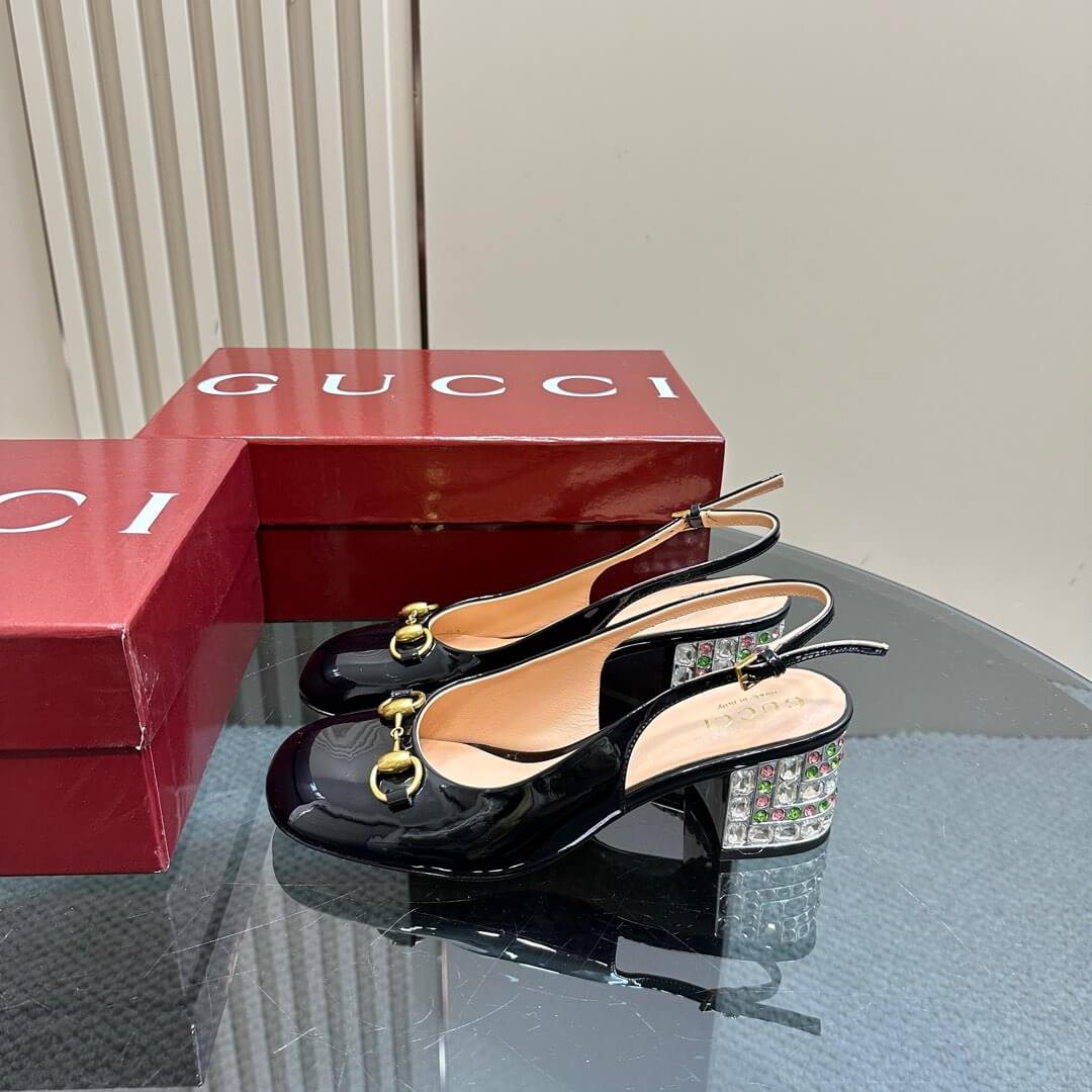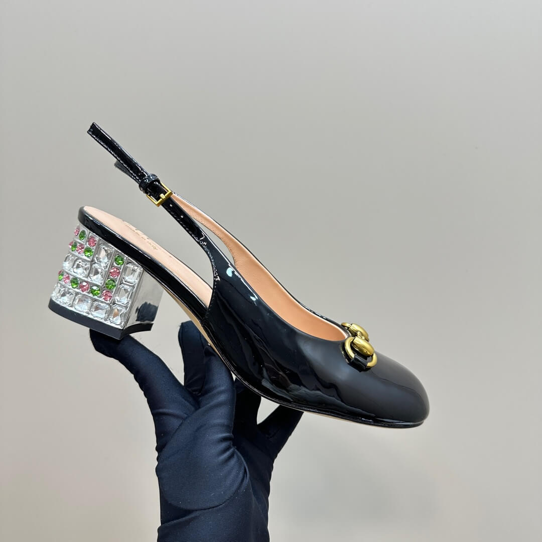 Shimmer with every step in these Black Patent Leather Horsebit Slingback Pumps, where timeless elegance meets a dazzling statement. Crafted from sleek patent leather, these pumps feature the iconic Gucci Horsebit detail, exuding luxury at every glance. The standout feature? A bold block heel adorned with sparkling multicolored crystals, adding a glamorous twist to a classic silhouette. The adjustable slingback strap ensures a perfect fit, making them the ideal choice for special occasions or a chic evening look.