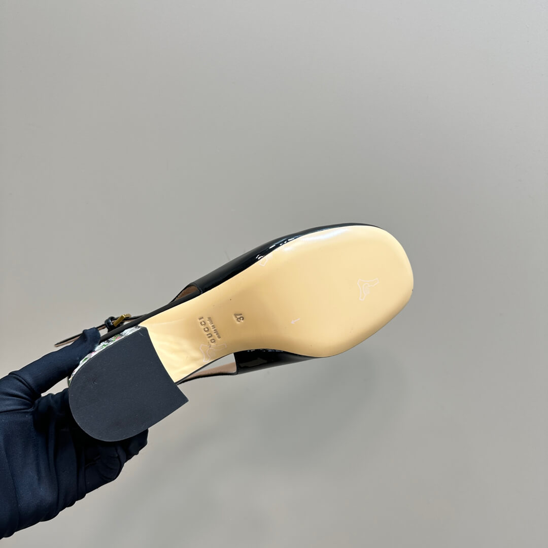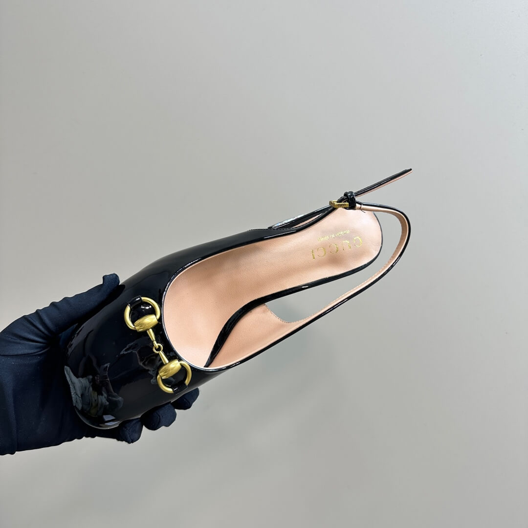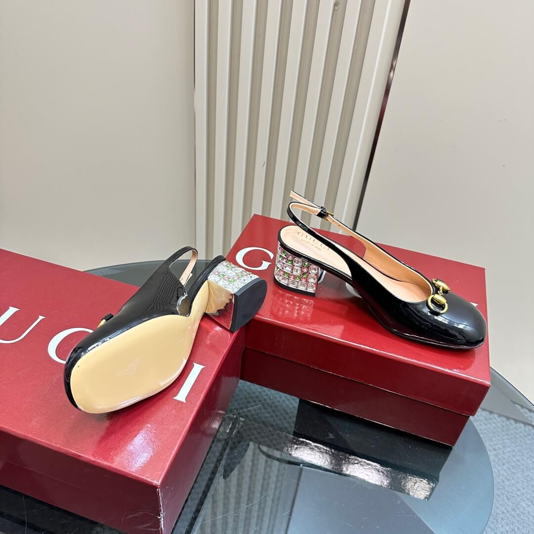 Shimmer with every step in these Black Patent Leather Horsebit Slingback Pumps, where timeless elegance meets a dazzling statement. Crafted from sleek patent leather, these pumps feature the iconic Gucci Horsebit detail, exuding luxury at every glance. The standout feature? A bold block heel adorned with sparkling multicolored crystals, adding a glamorous twist to a classic silhouette. The adjustable slingback strap ensures a perfect fit, making them the ideal choice for special occasions or a chic evening look.