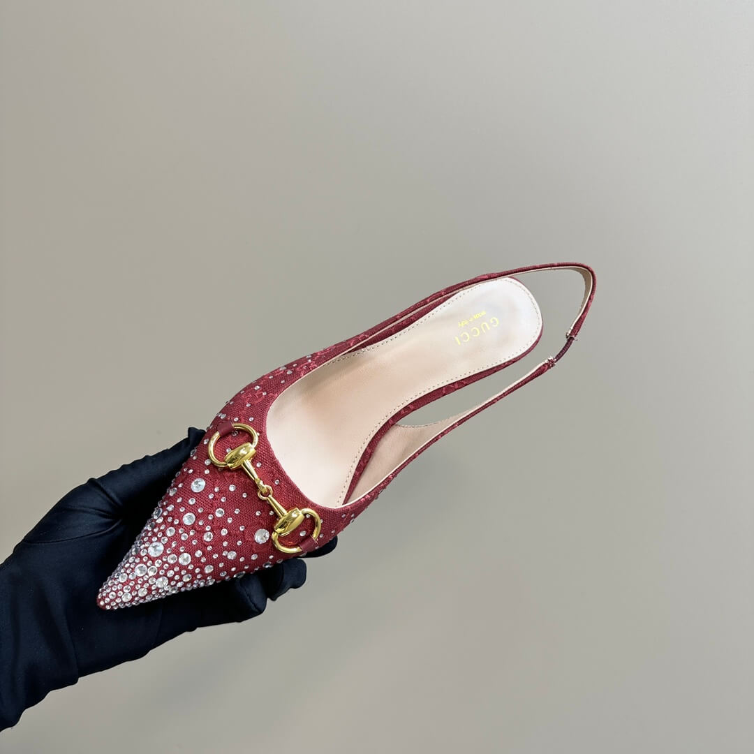 Own the spotlight with these Gucci-inspired burgundy kitten heels, where timeless elegance meets modern allure. Designed with the signature GG monogram canvas, sparkling crystal embellishments, and the iconic Horsebit detail, these heels redefine sophistication. The pointed toe and slingback design create a sleek silhouette, while the low kitten heel adds comfort without compromising on style. Whether it’s a night out or a power move in the office, these heels are your perfect companion.
