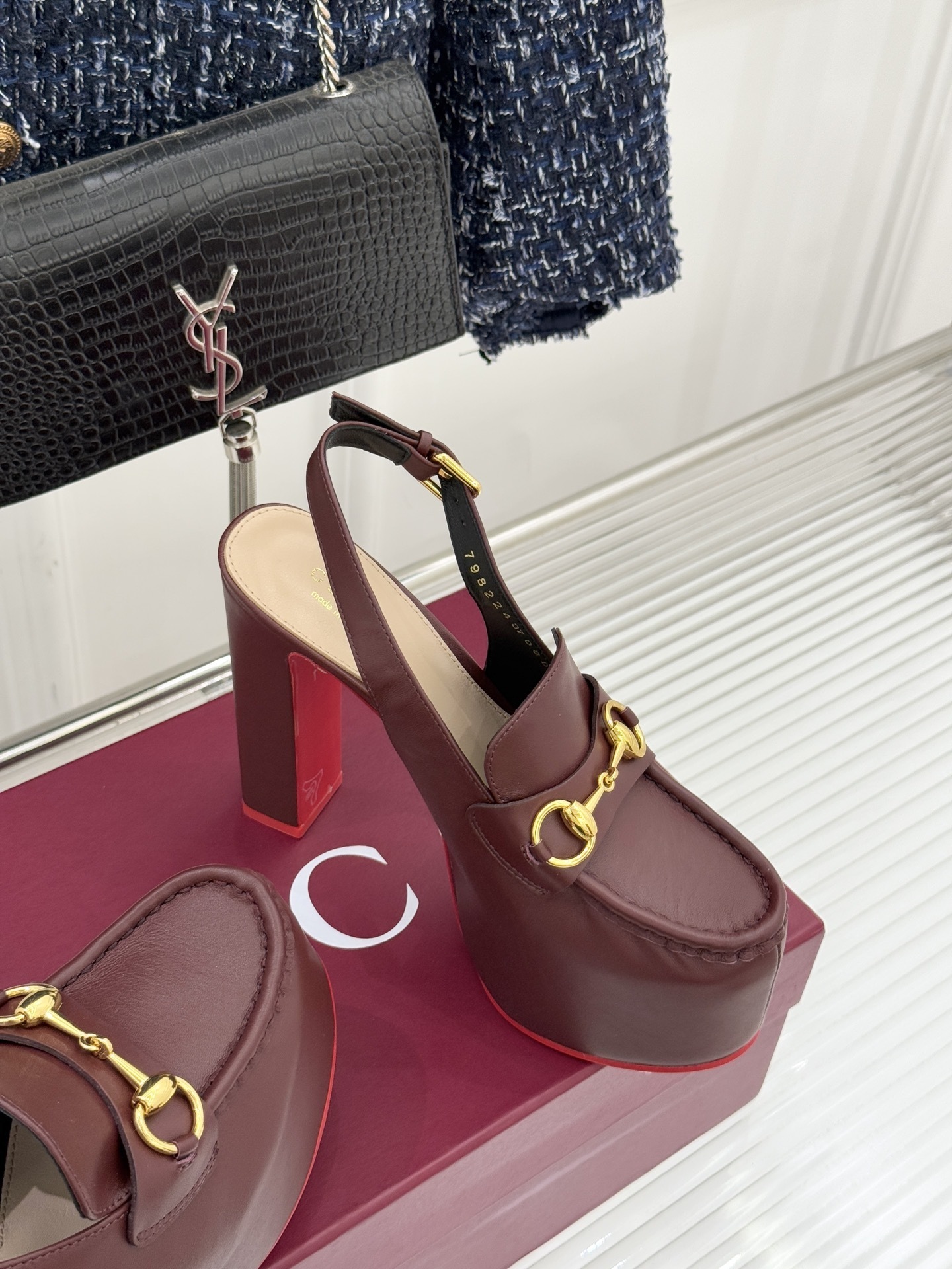 Features: Iconic Horsebit hardware, loafer-style upper, slingback strap with adjustable buckle, bold platform sole