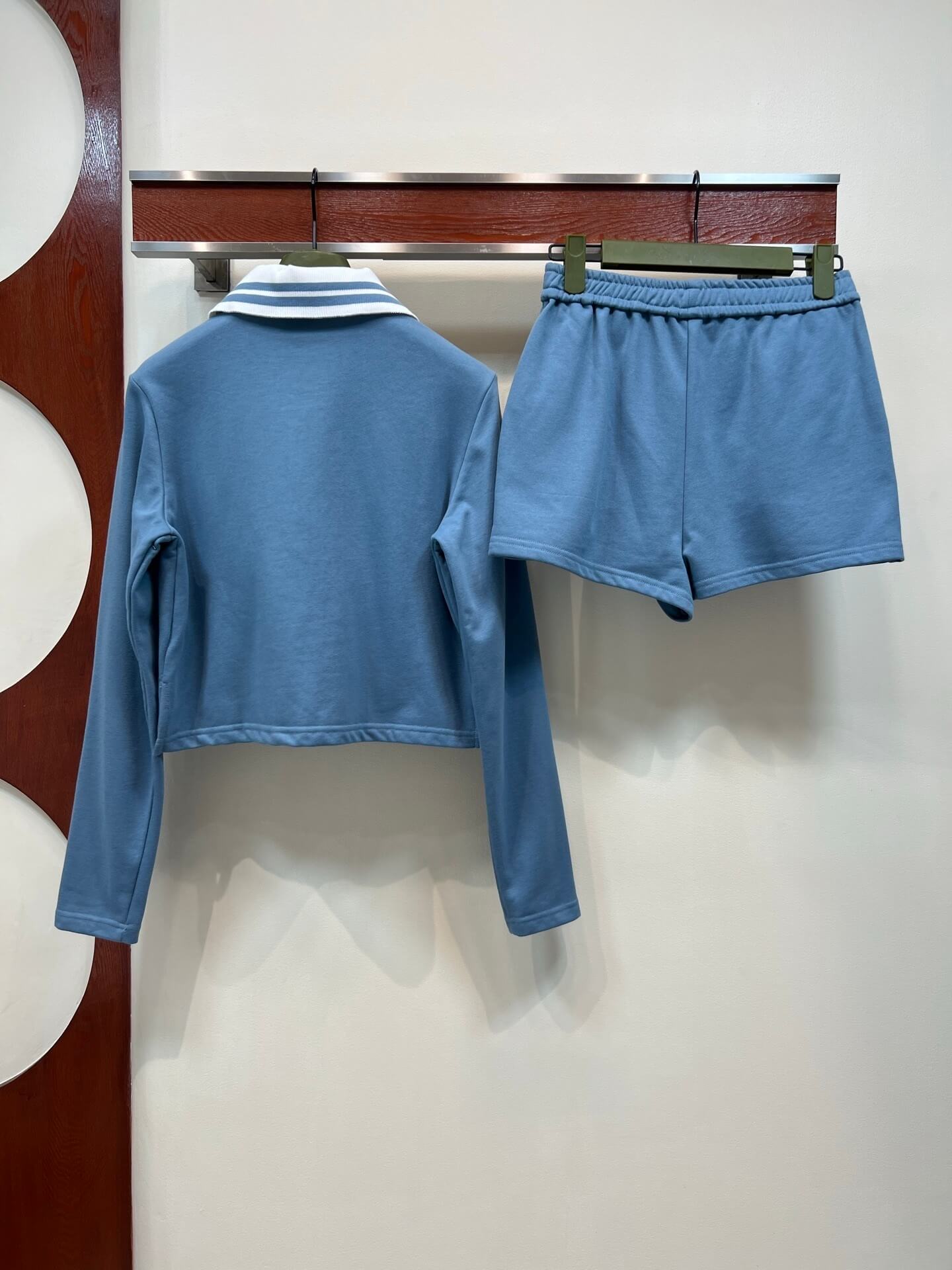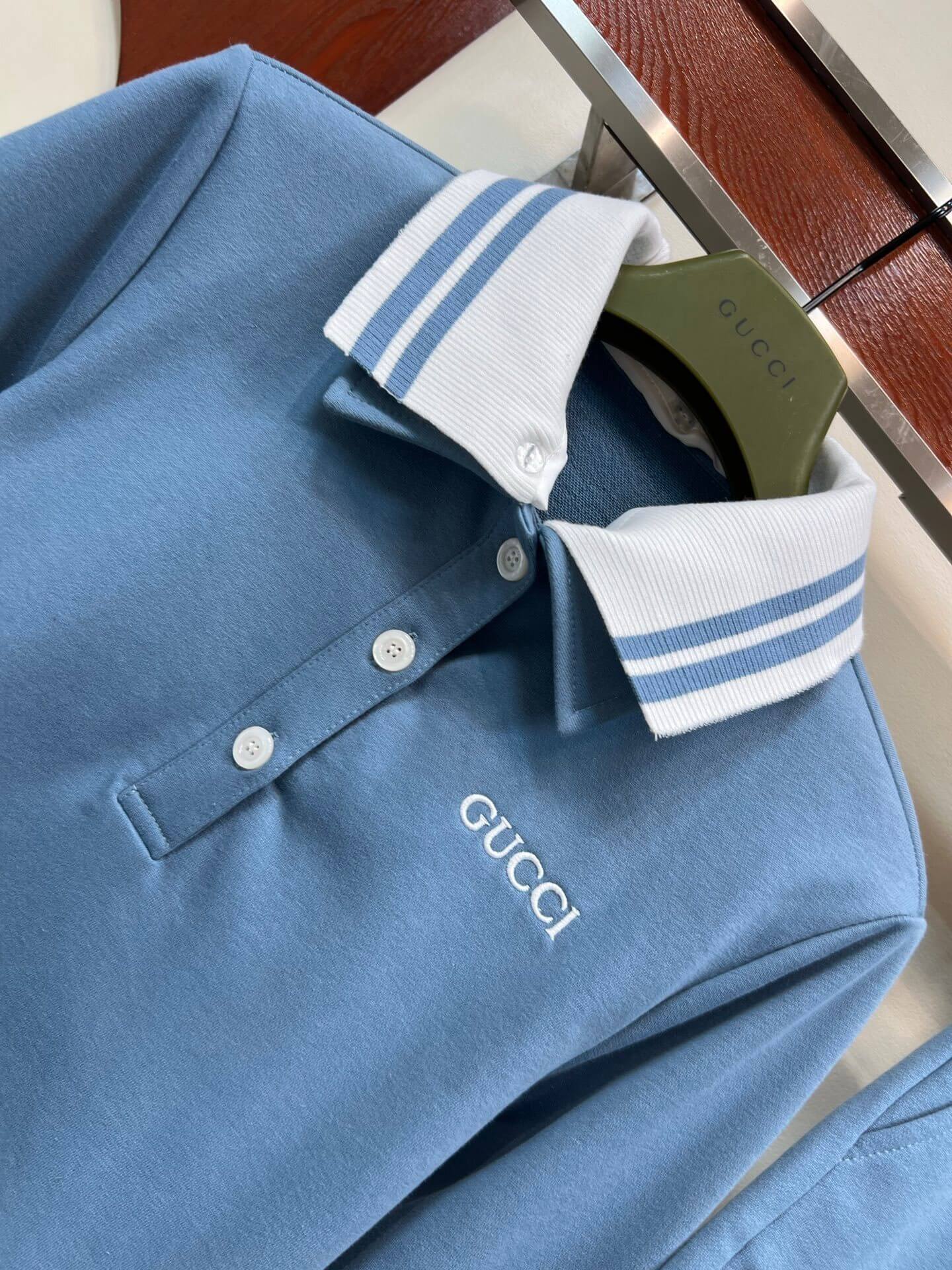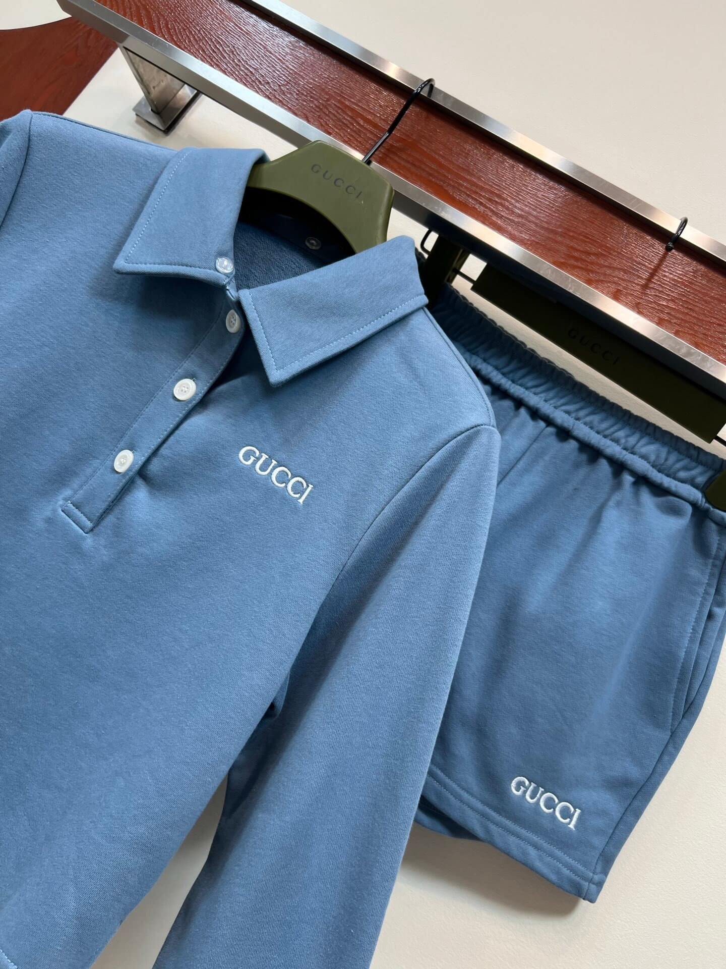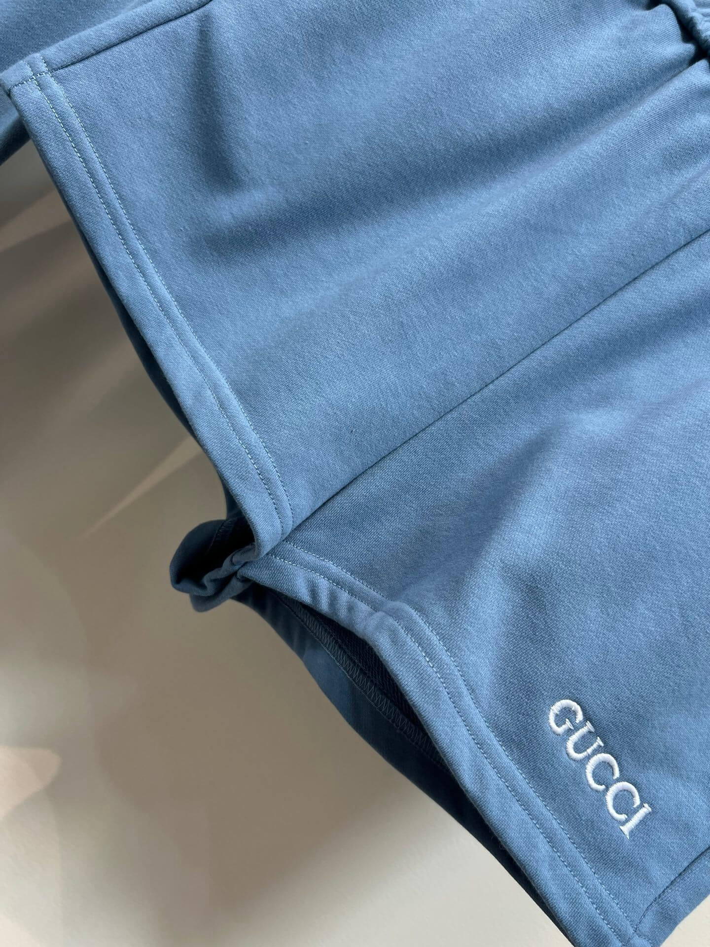 Designed for women who love refined comfort, the Gucci Crop Polo and Short Set – Powder Blue pairs a crisp cropped polo with perfectly tailored shorts for a coordinated look that feels both relaxed and elevated. The soft powder-blue hue exudes calm sophistication, while the contrasting white collar and subtle logo embroidery add a touch of classic heritage charm. Whether worn for leisurely afternoons, casual outings, or modern athleisure styling, this set embodies the perfect balance between playful ease and signature-inspired refinement.