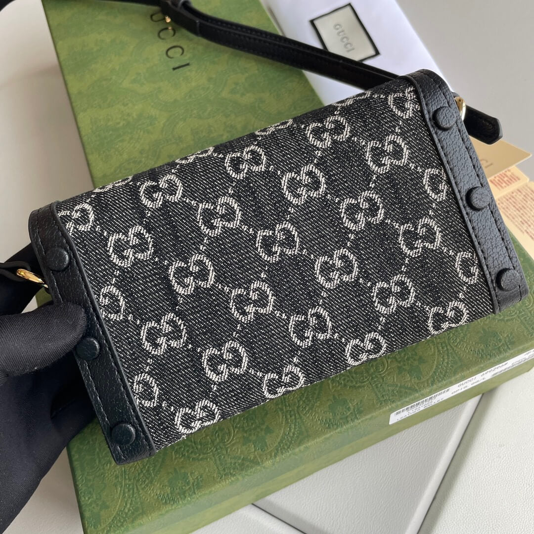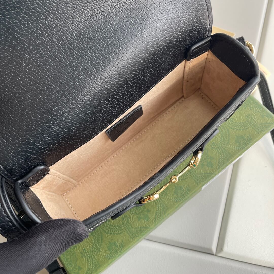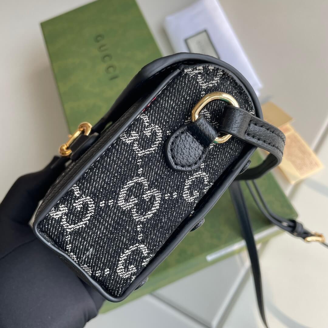 This sleek and stylish mini shoulder bag features the iconic GG Supreme canvas in a classic black colorway. The signature horsebit hardware, a symbol of Gucci’s equestrian heritage, adds a touch of timeless elegance.