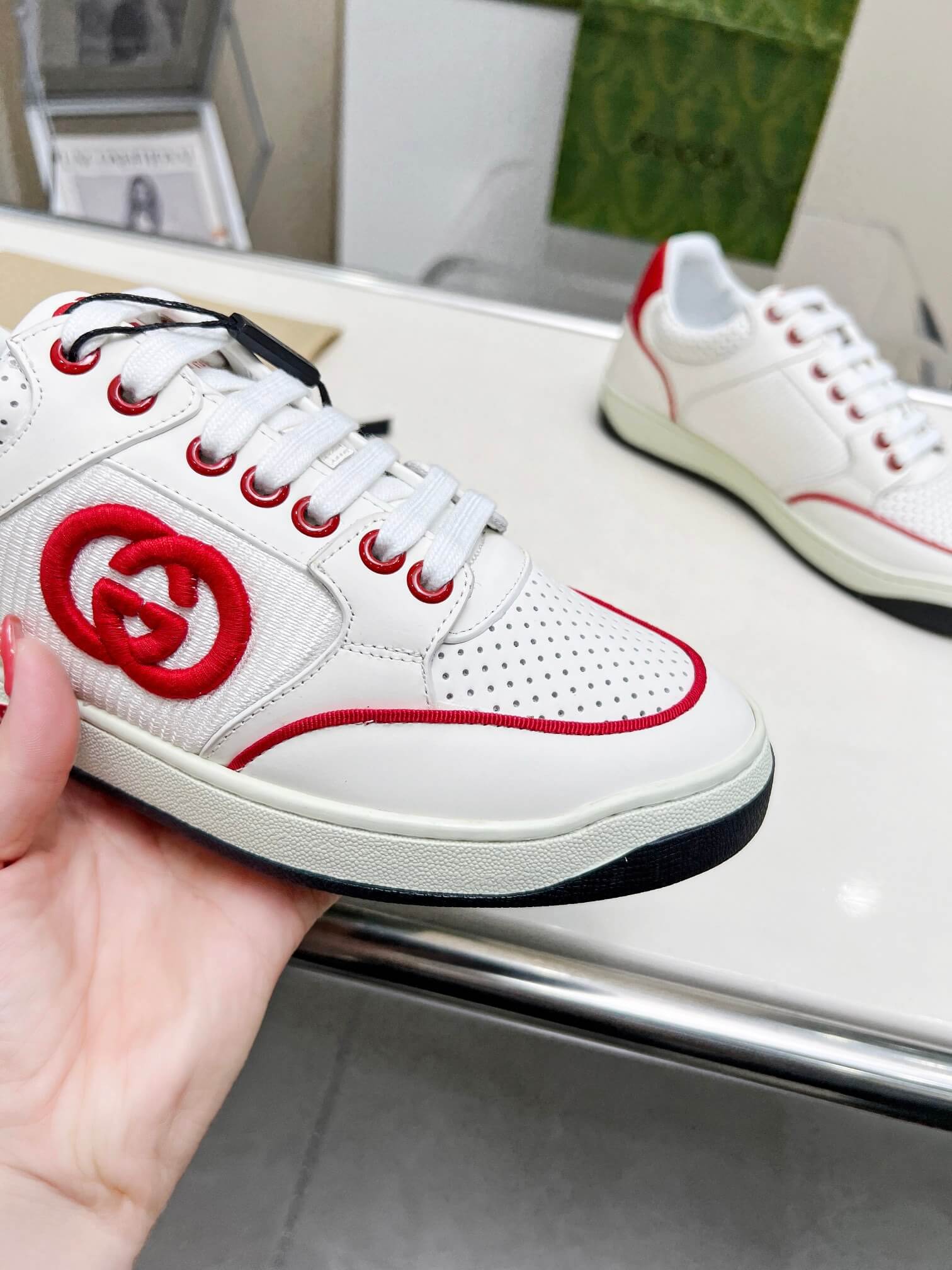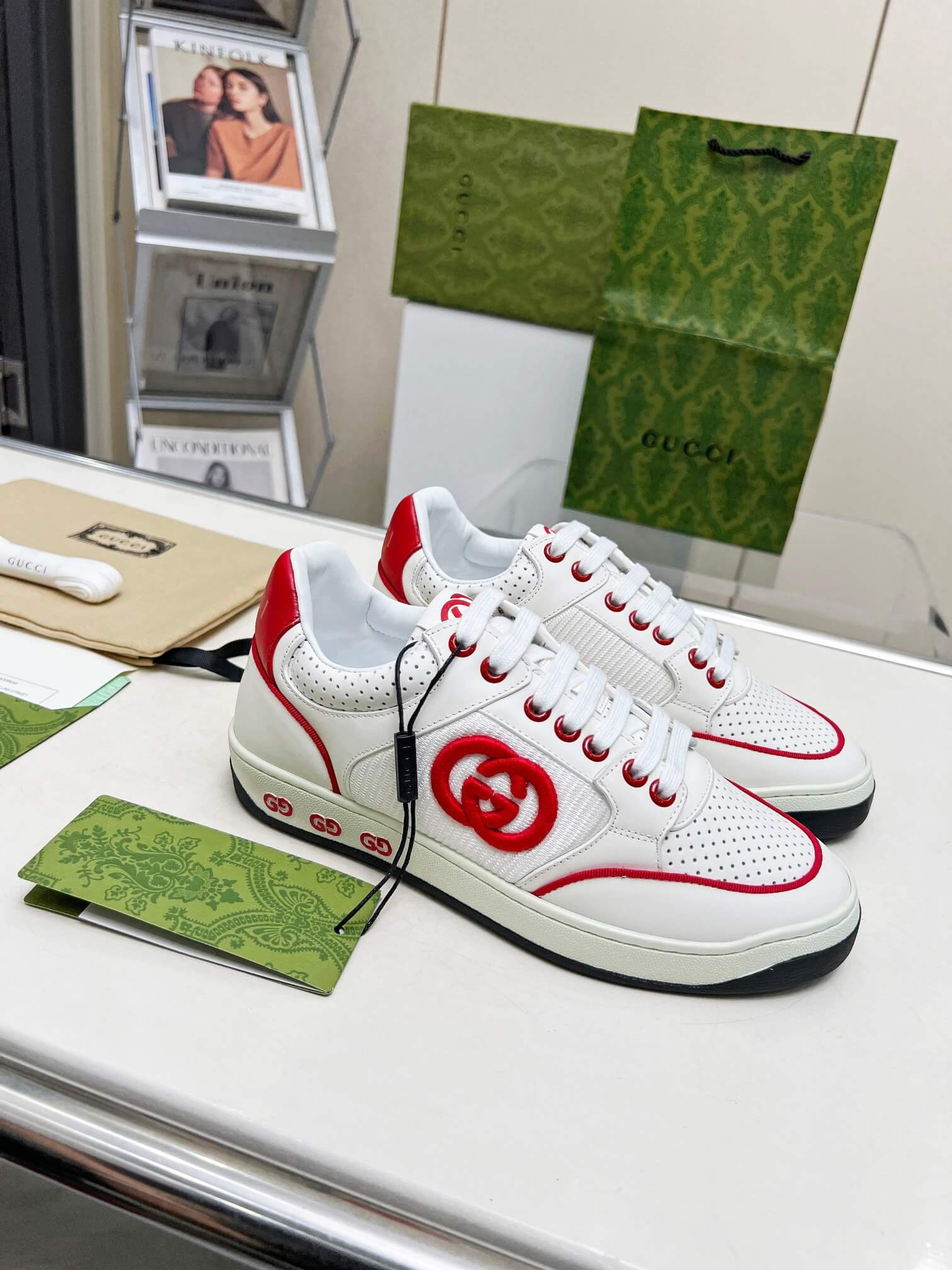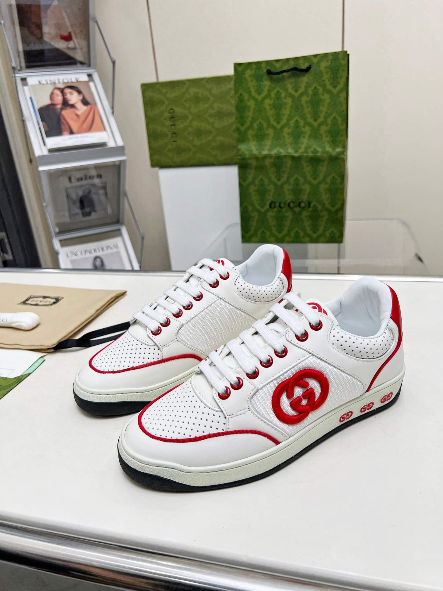 Turn heads with every step in these white and red leather Interlocking G sneakers, crafted for the woman who thrives in the spotlight. The crisp white leather base is brought to life with vivid red accents, framing the bold Interlocking G emblem for an effortlessly powerful statement. With perforated details for breathability and signature GG branding along the sole, this pair is the ultimate fusion of sport and luxury. Whether dressed up or down, these sneakers ensure that your style remains as fearless as you are.