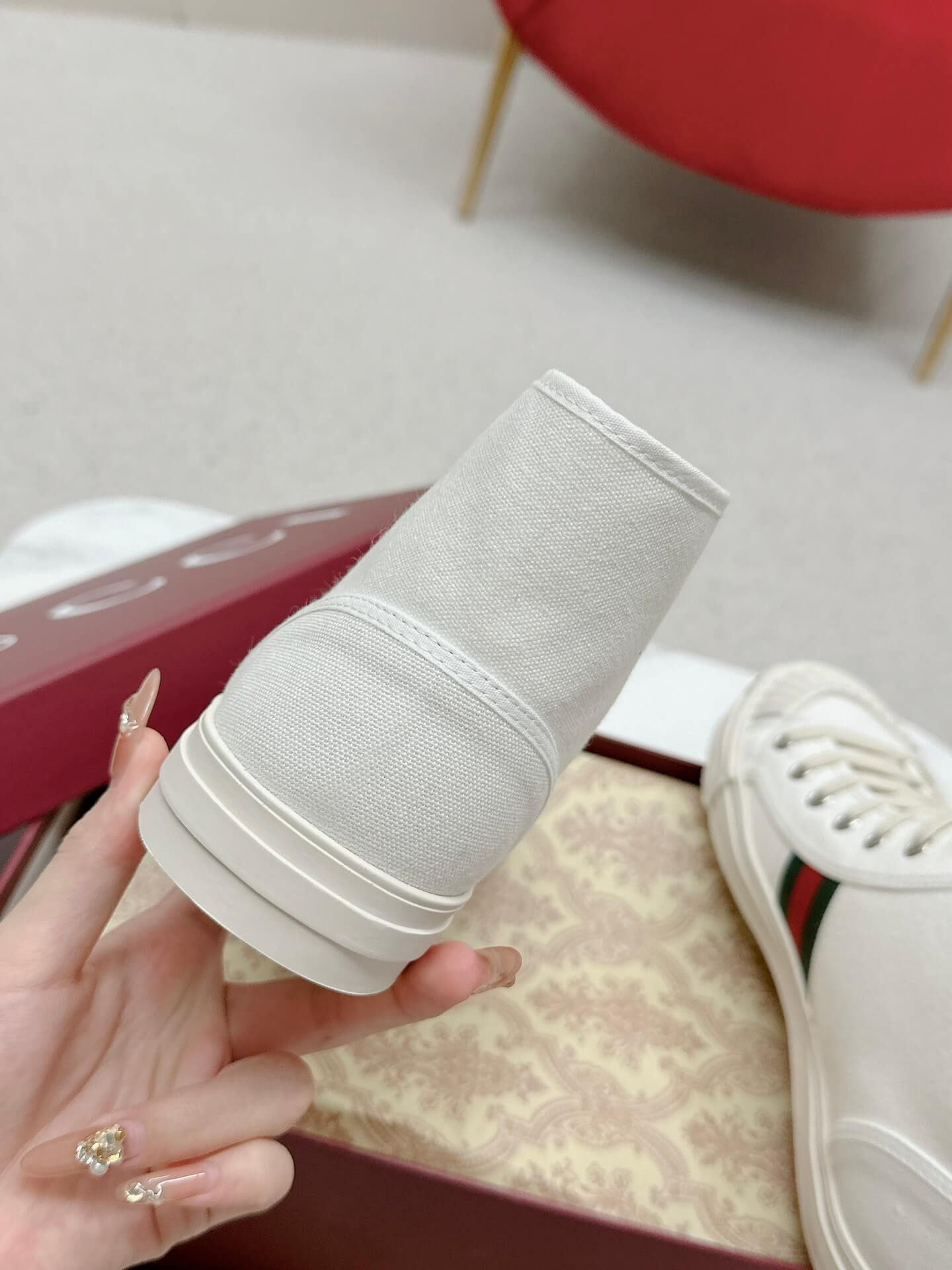 Classic meets contemporary in a high-top designed for effortless charm.” The Gucci Julio White Canvas High-Top Trainer blends a fresh, minimalist aesthetic with iconic detailing. Its crisp white canvas upper is complemented by the signature Web stripe, adding a refined contrast to the sporty silhouette. A sturdy rubber toe cap embossed with Gucci lettering enhances the design, while the lace-up closure ensures a secure and stylish fit. Whether paired with casual denim or a playful dress, this sneaker brings an easygoing yet polished edge to any wardrobe.