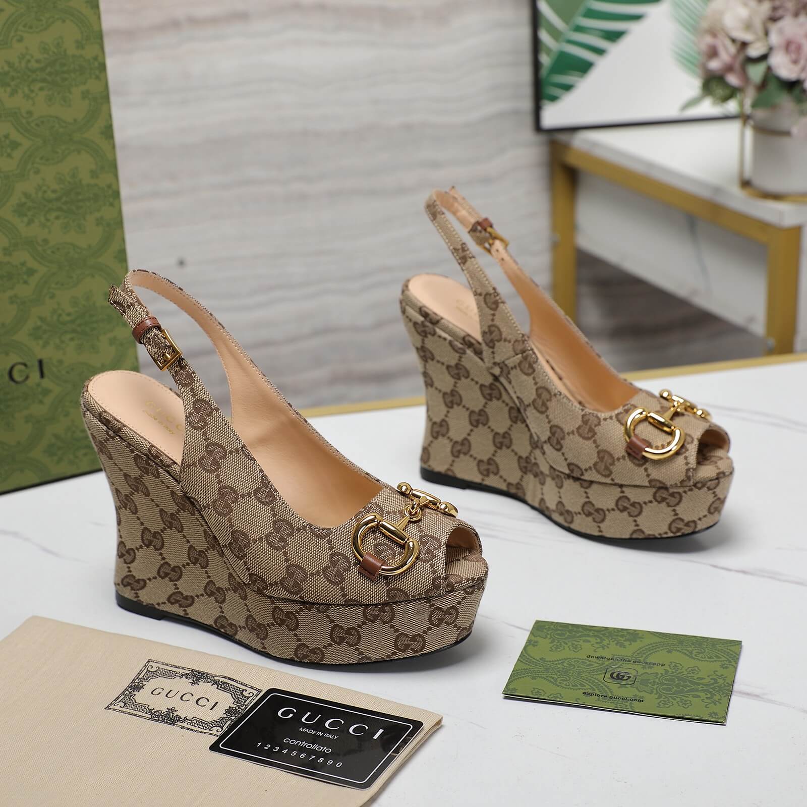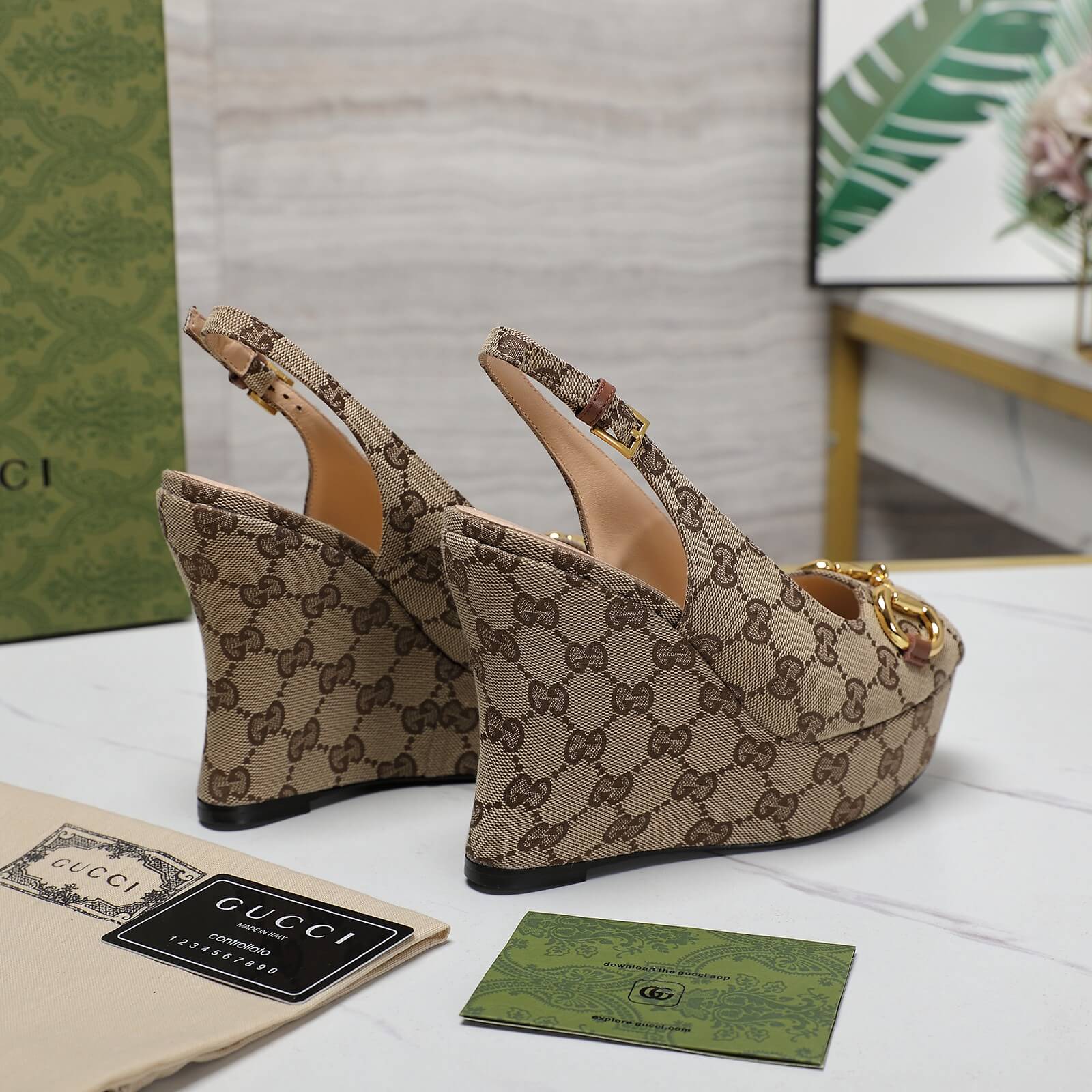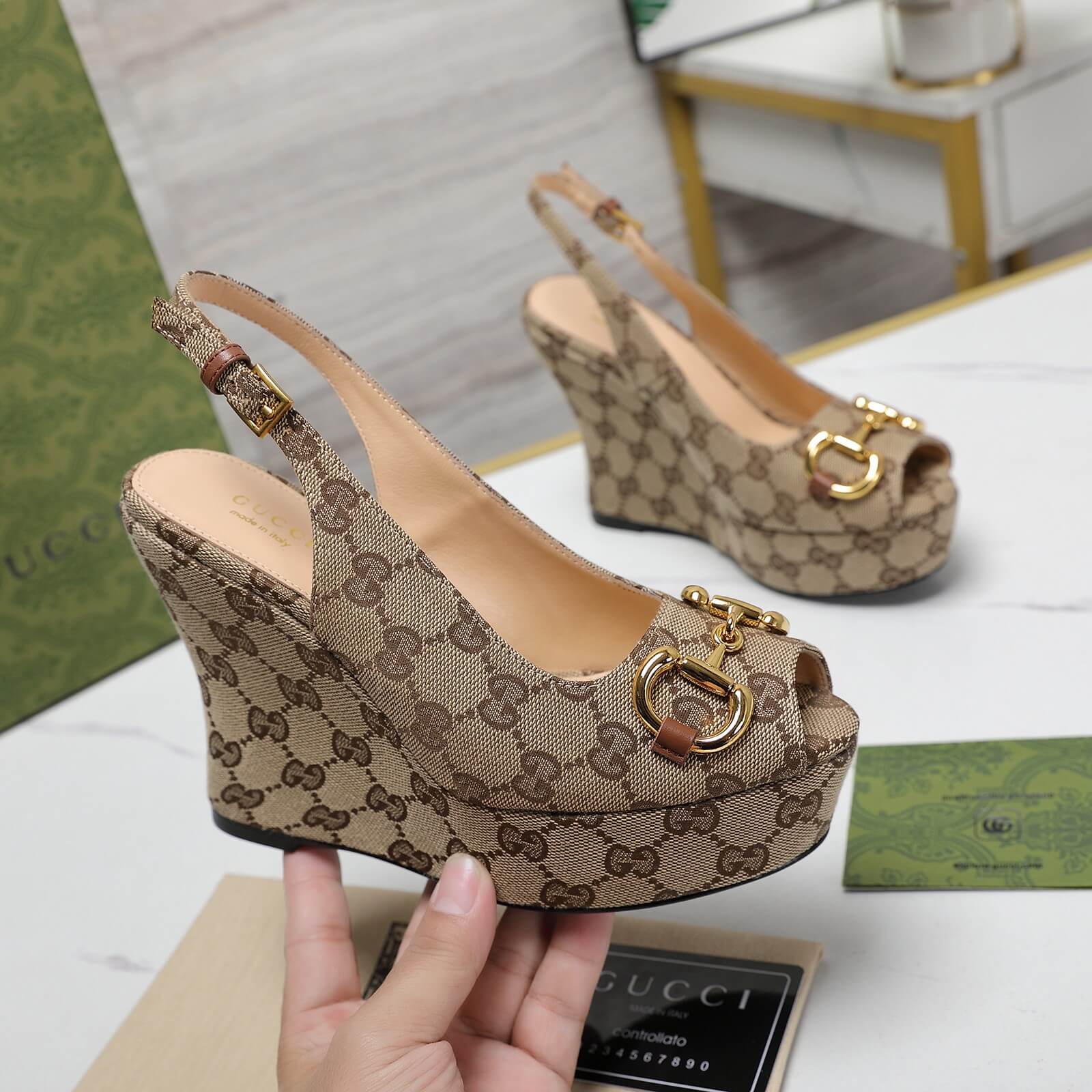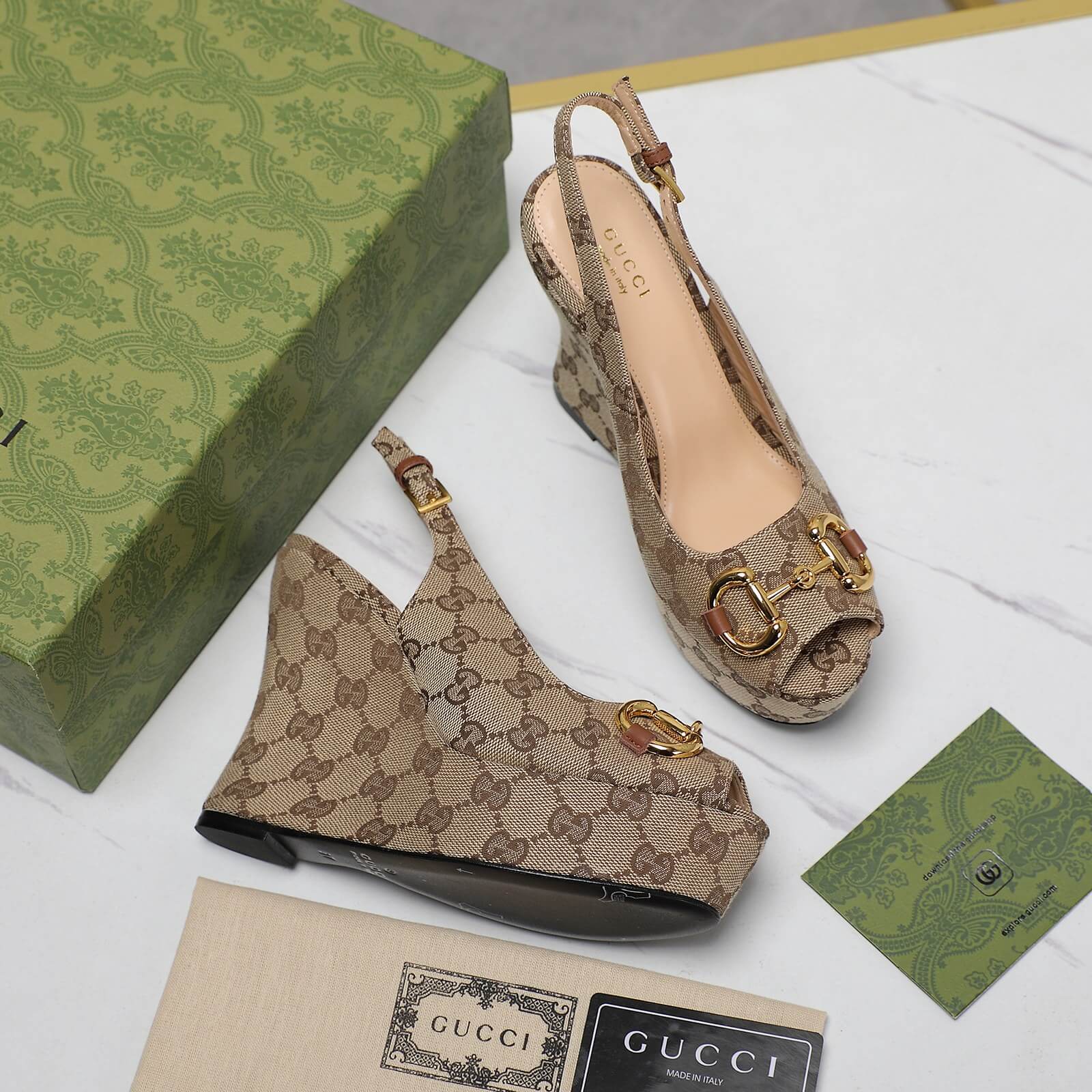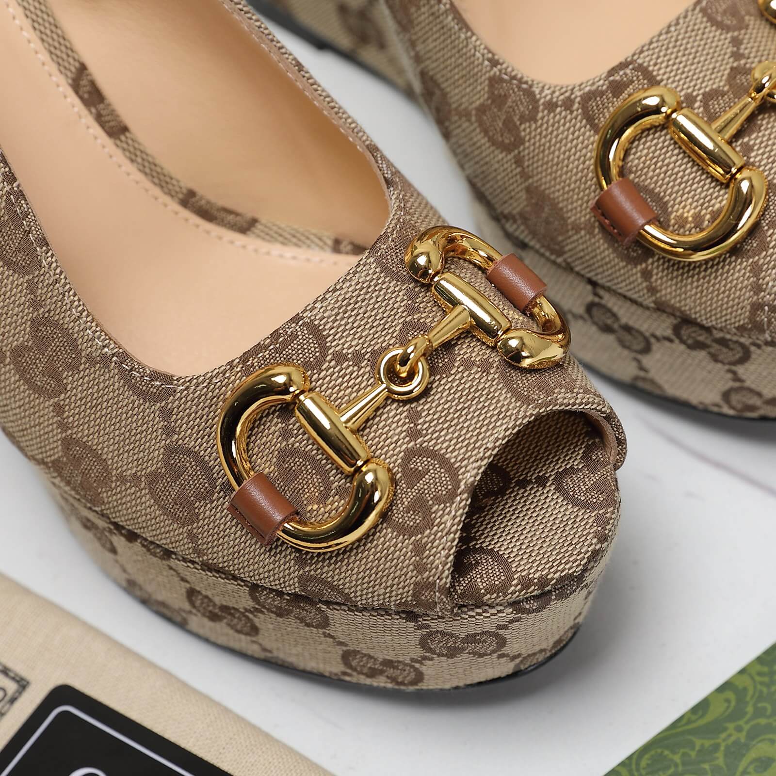 Command attention with every stride in these Gucci Metallic Chenille Jacquard Knit Peep-Toe Wedges. Designed for the bold, these platform sandals feature the iconic GG monogram in rich brown chenille jacquard, complemented by the signature Horsebit hardware in gleaming gold. The towering wedge heel and peep-toe design exude confidence, while the adjustable ankle strap ensures a secure fit. Perfect for elevating any outfit, these wedges blend heritage luxury with modern glamour.