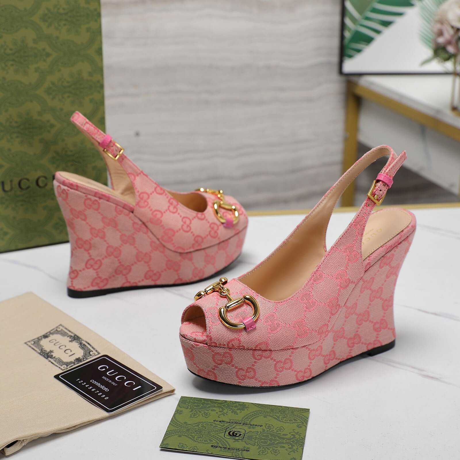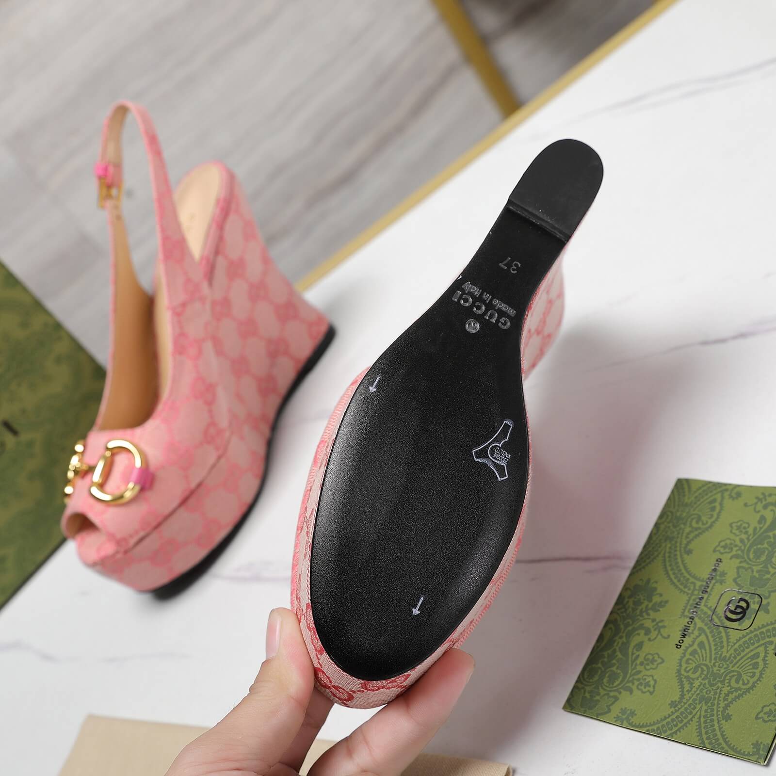 Redefine elegance with these Gucci Metallic Chenille Jacquard Knit Peep-Toe Platform Wedges in a striking pink hue. Designed with a statement GG monogram jacquard fabric, these wedge sandals bring a blend of vintage-inspired aesthetics and contemporary luxury. The gold-tone horsebit detailing at the front enhances their signature appeal, while the peep-toe design and slingback ankle strap provide a refined yet bold look. Set on a high-platform wedge, these heels offer height without compromising comfort, making them the perfect pair to elevate any outfit.