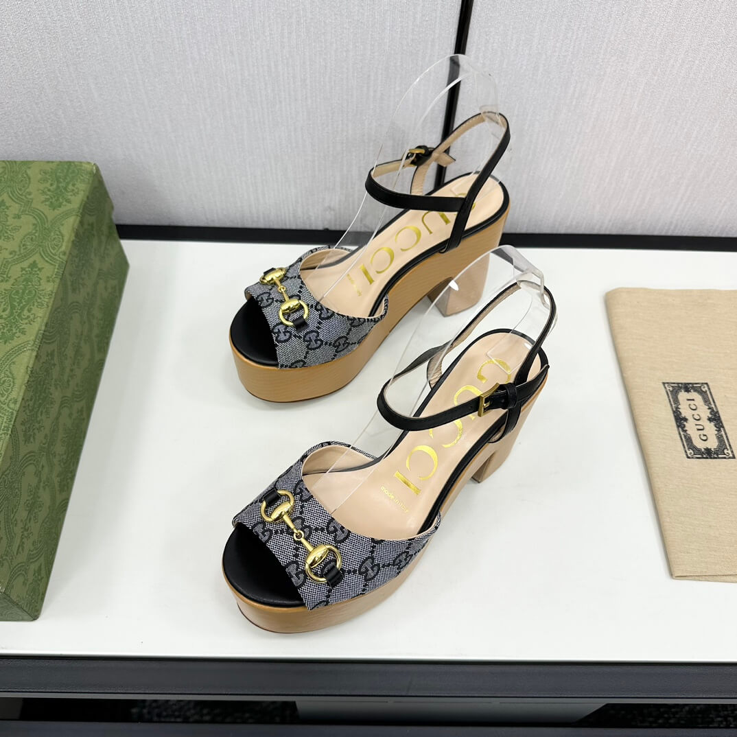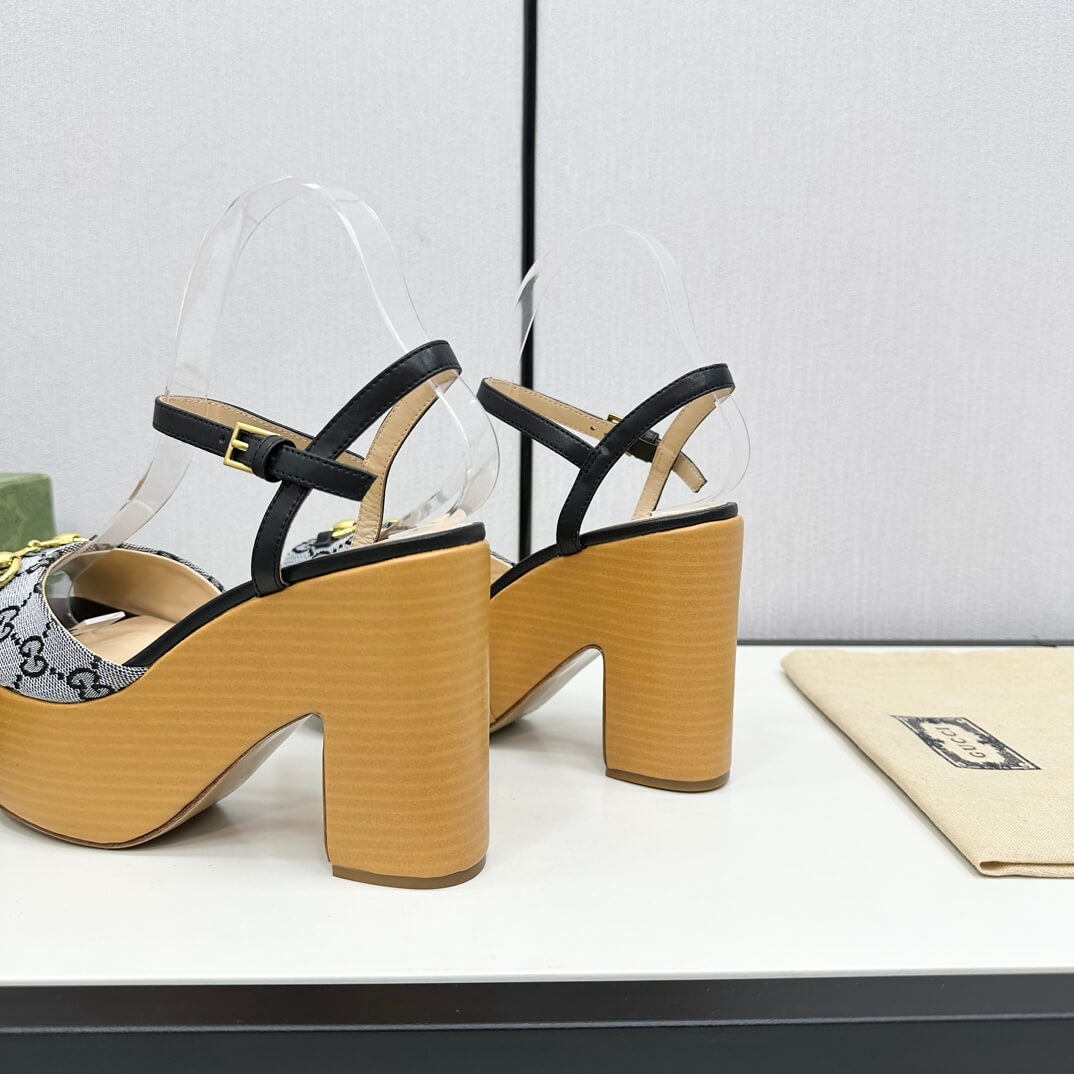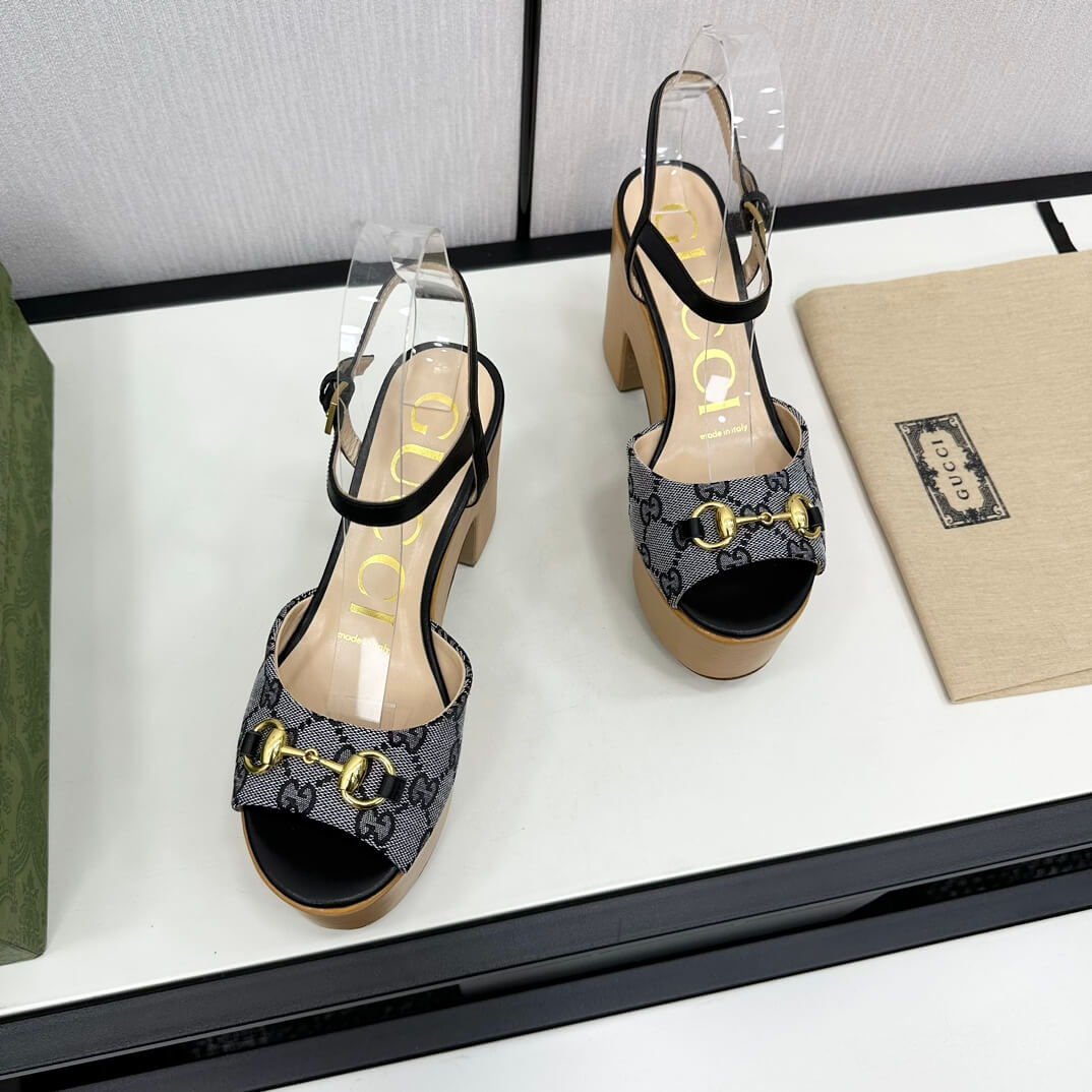 Define your style with these Plateau Metallic Peep-Toe Platform Wedge Sandals, crafted with a chenille jacquard-knit heel in an elegant black and grey combination. The gold-tone horsebit detail adds a signature designer touch, while the chunky platform wedge provides a bold, modern silhouette. Designed with a secure ankle plaque strap, these high-heeled sandals offer both comfort and statement-making appeal, perfect for any occasion.