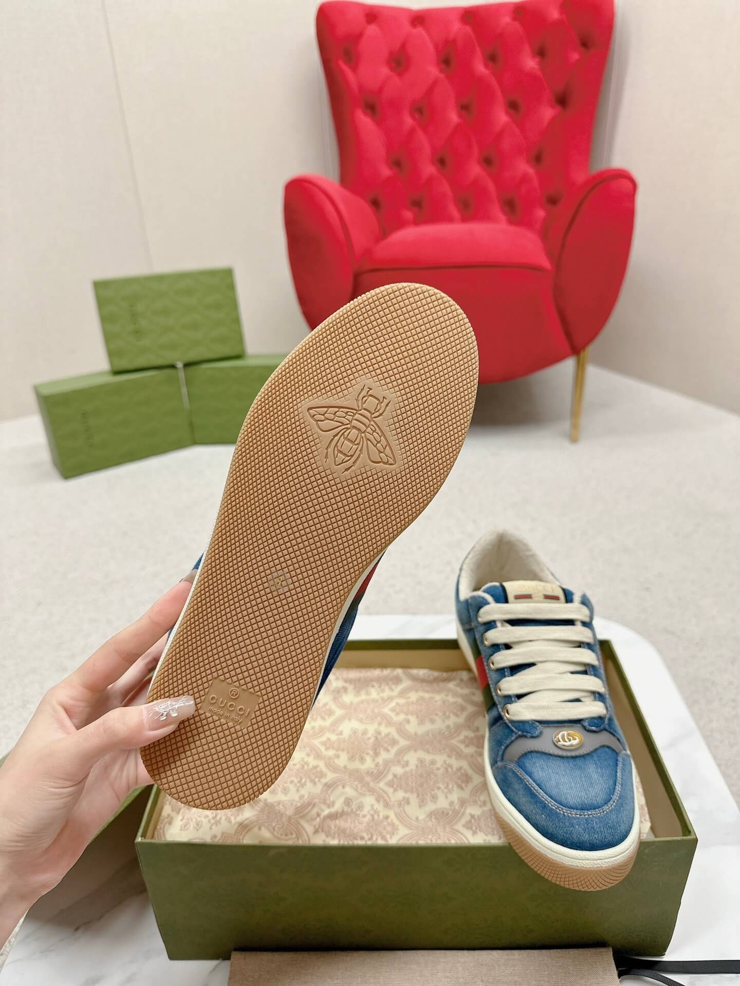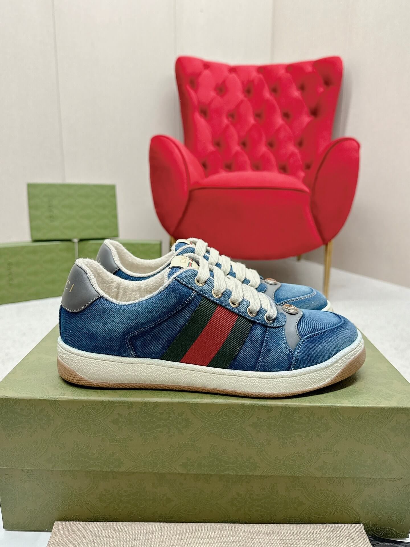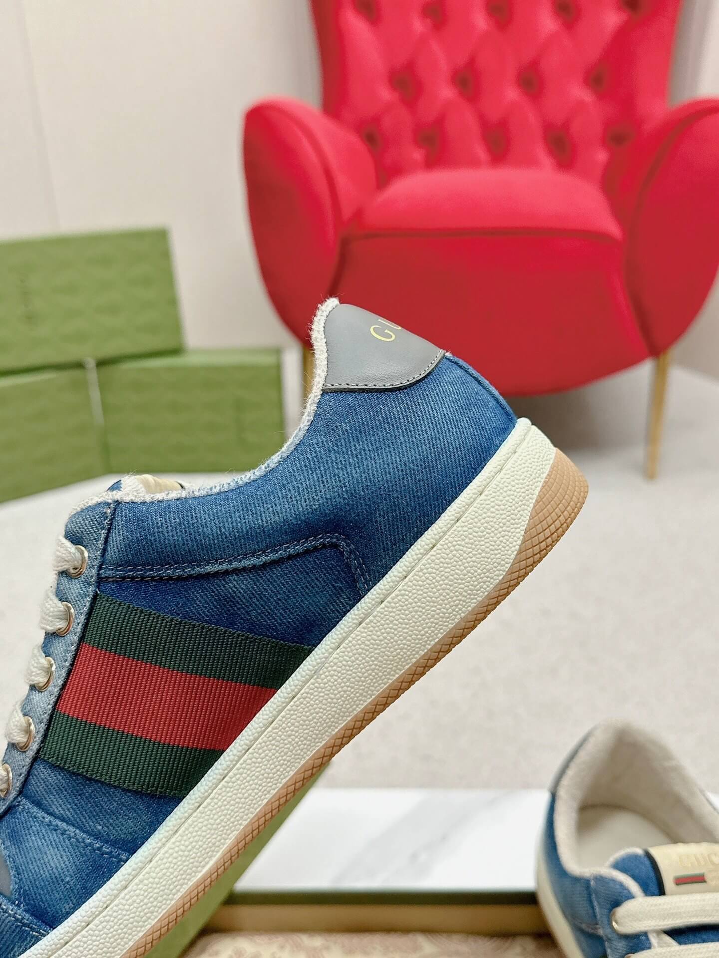 Elevate your casual style with a touch of vintage denim charm, redefined in these effortlessly cool sneakers. The Gucci Screener Blue Denim Sneakers bring a retro edge to your wardrobe with their distressed denim upper, signature Web stripe, and luxe gold-tone GG emblem. A blend of casual chic and high-end craftsmanship, these sneakers feature a soft, lived-in feel with leather accents, a lace-up front, and a gum rubber sole for all-day comfort. Whether paired with jeans or a flowy dress, they deliver the perfect balance of laid-back elegance and bold fashion appeal.
