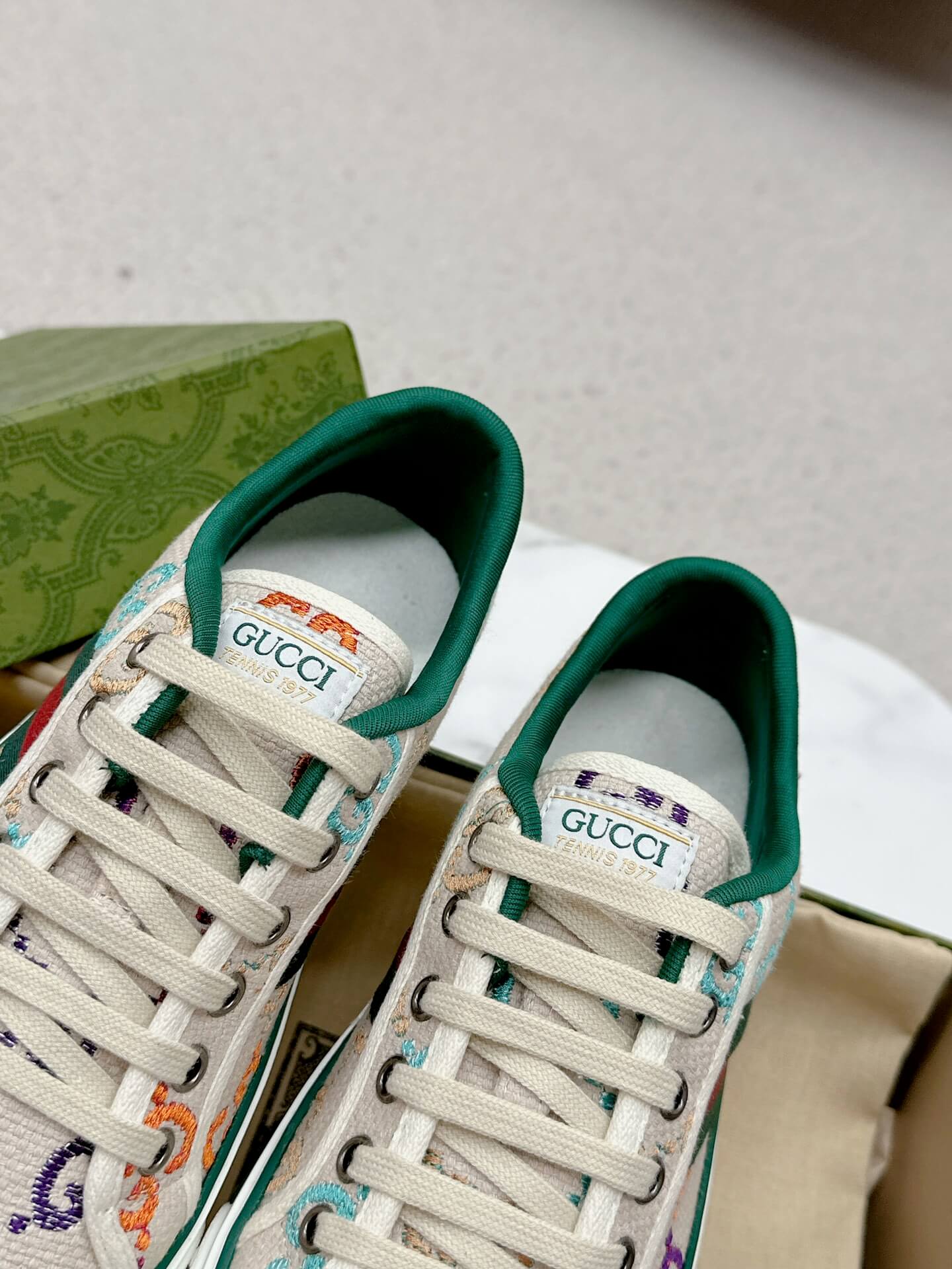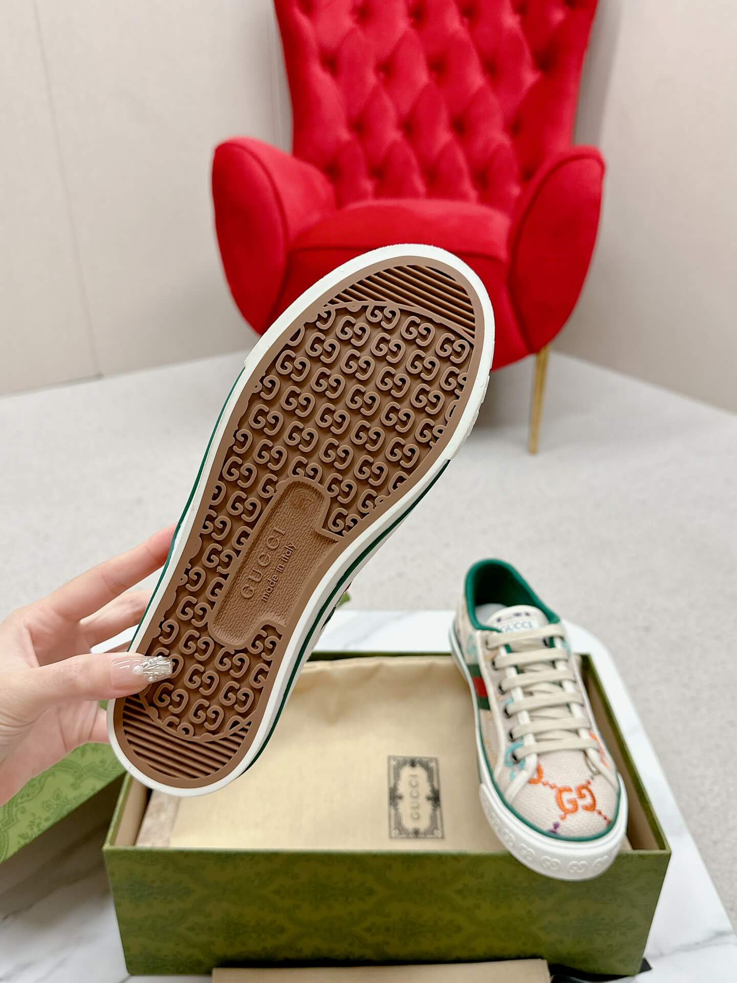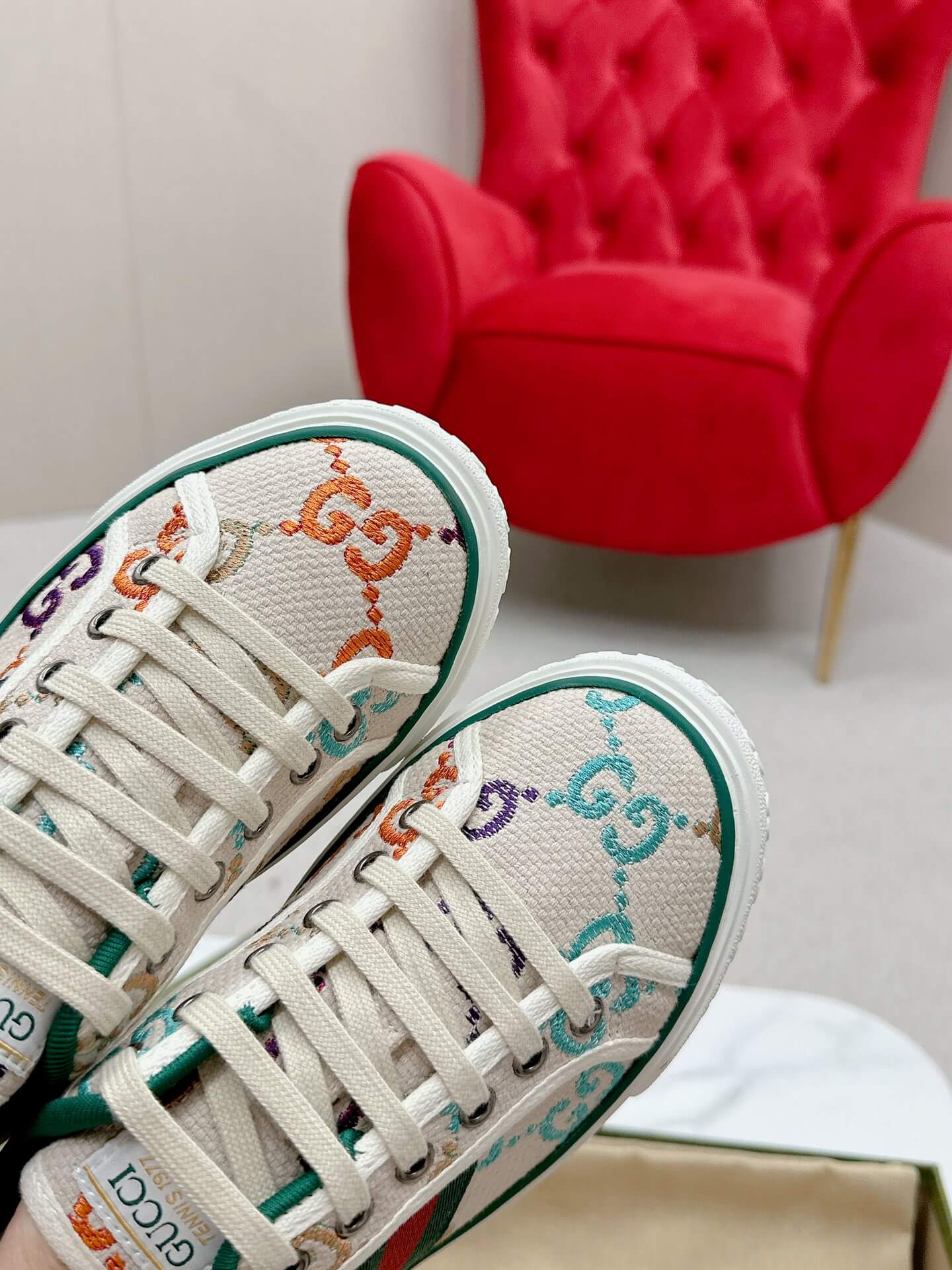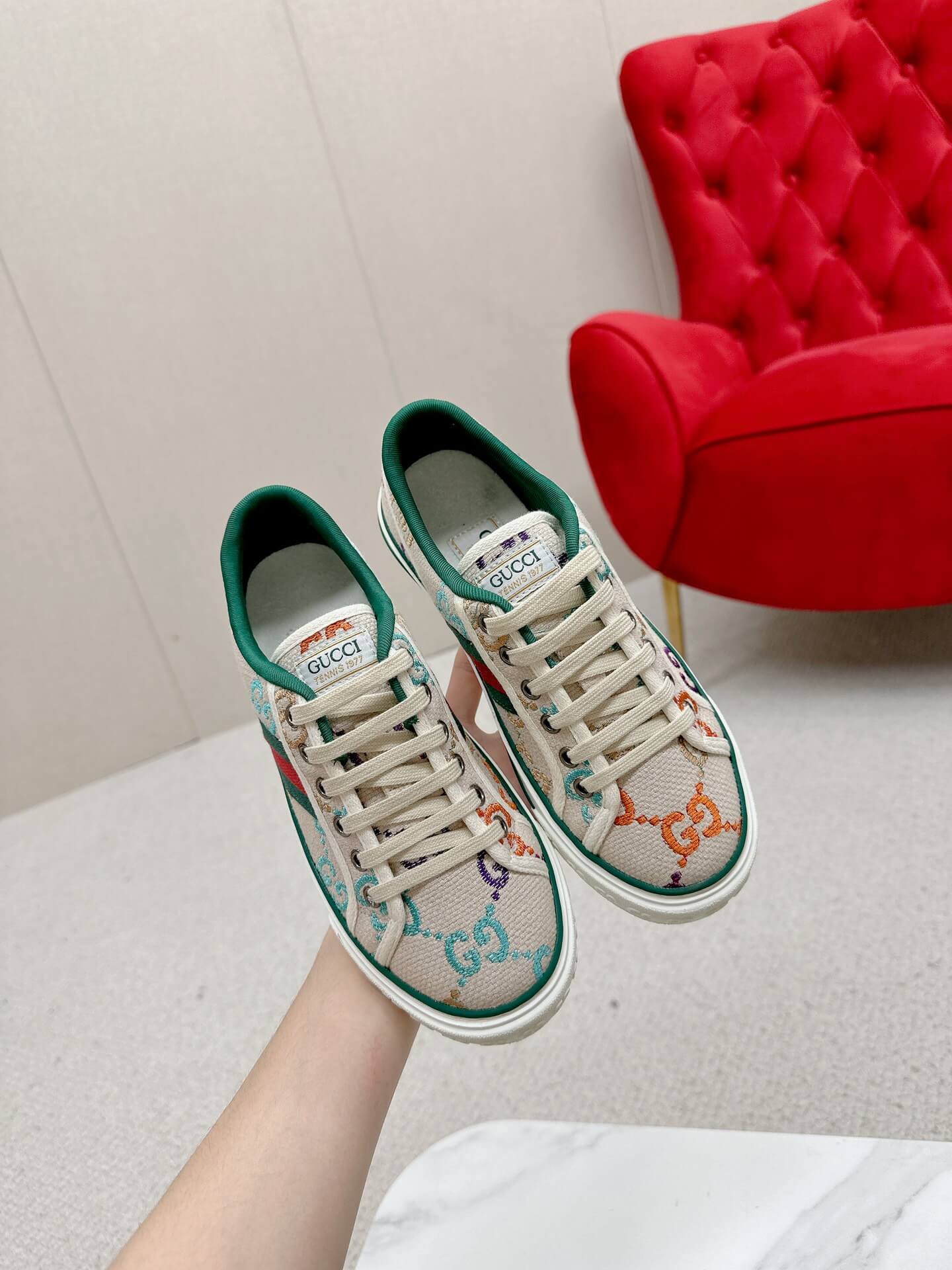 The perfect fusion of playfulness and sophistication, these beige canvas sneakers bring a fresh, uplifting charm to your wardrobe. The oversized multicolored GG print adds a bold yet elegant statement, while the iconic Web stripe grounds the look in timeless luxury. Designed for the woman who moves with confidence and embraces color, these sneakers make every outfit feel effortlessly put together. Whether it’s a casual day out or a stylish errand run, expect to feel chic, carefree, and undeniably stylish.