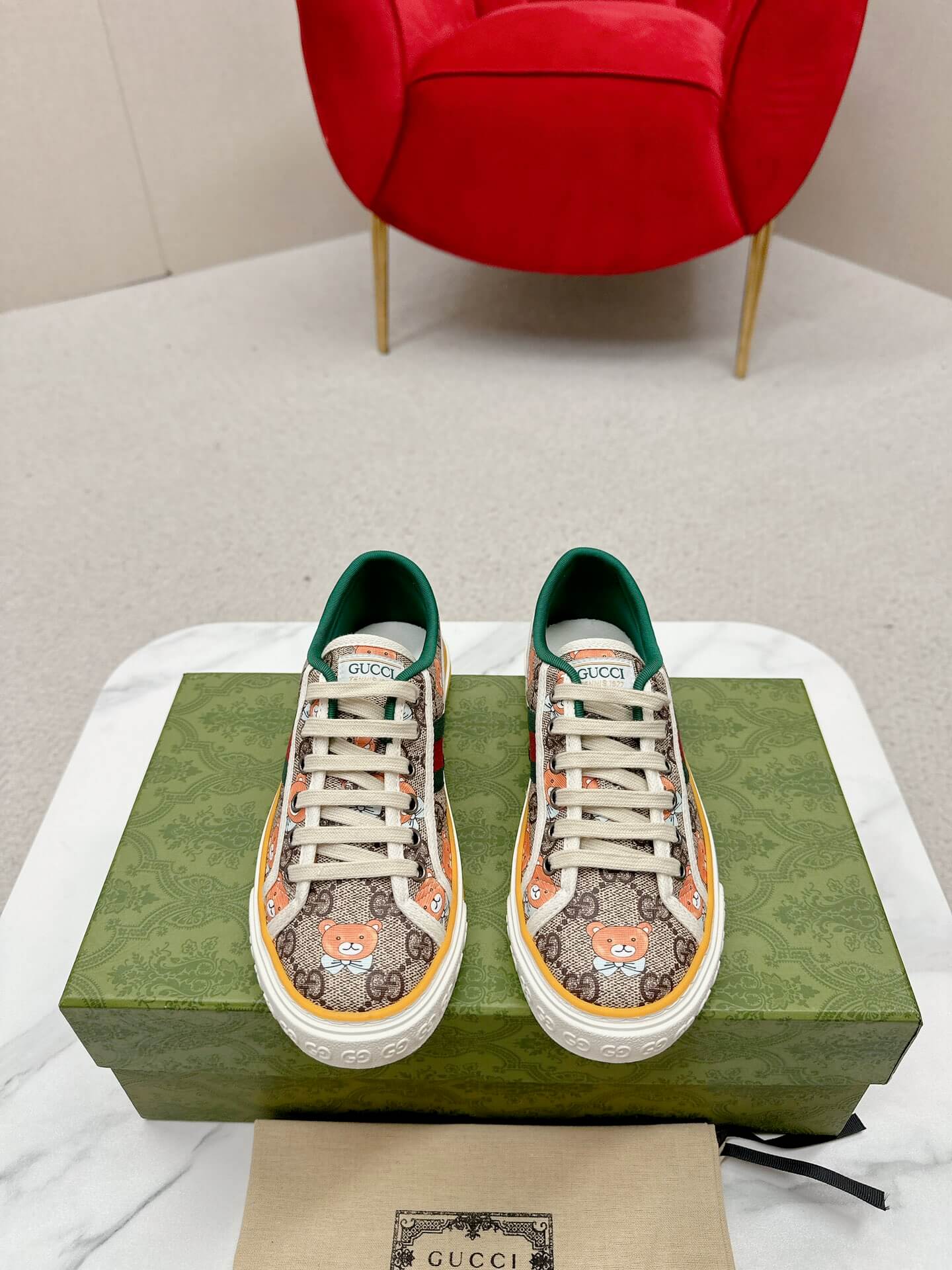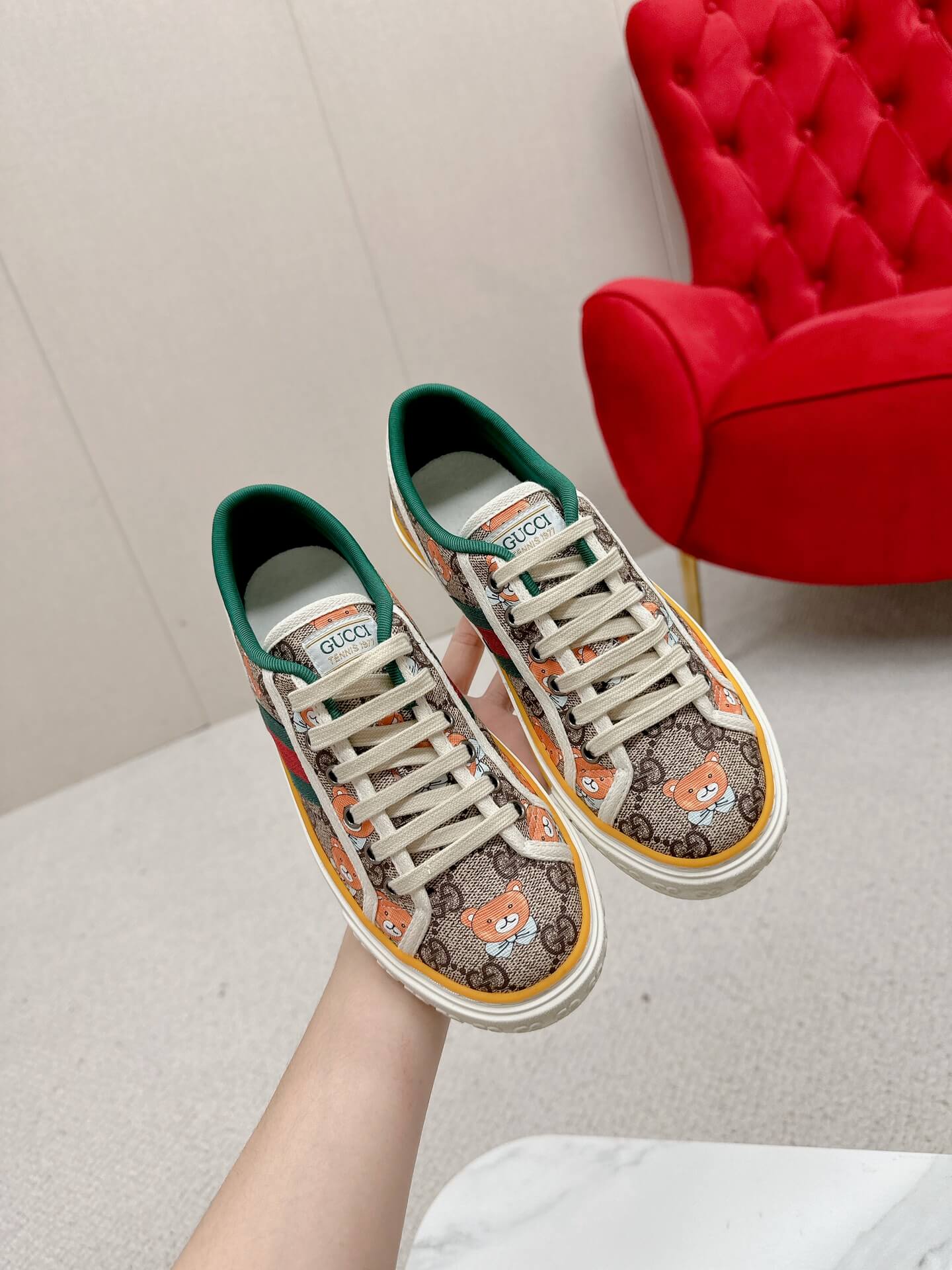 Playful charm meets classic luxury in these Gucci Tennis 1977 sneakers. Featuring an endearing teddy bear cartoon print on the GG Supreme canvas, this pair adds a fun, whimsical touch to your everyday style. The signature green and red Web stripe enhances the heritage appeal, while the vintage-inspired yellow piping frames the silhouette beautifully. With soft cotton laces and a textured rubber sole embossed with interlocking G details, these sneakers are the perfect balance of comfort and standout fashion. Whether you’re running errands or elevating your casual wear, these playful kicks make every step feel effortlessly chic.