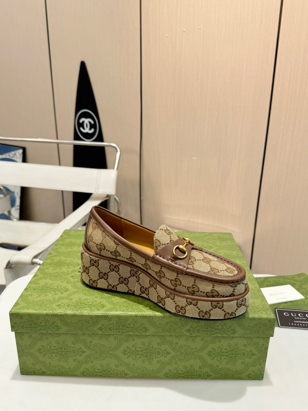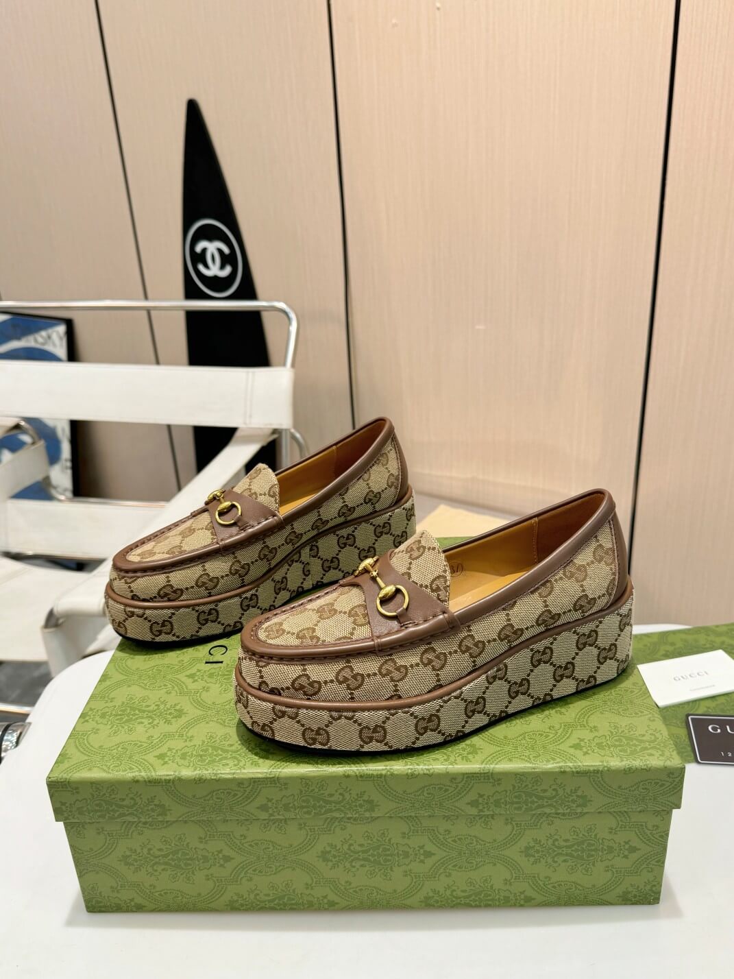 Some shoes whisper elegance—these command attention. Wrapped in the timeless GG monogram canvas, these wedge Horsebit loafers bring an irresistible mix of vintage charm and modern confidence. The warm beige and ebony tones, contrasted with rich brown leather trims, create an effortless and iconic look. The signature gold-tone Horsebit hardware adds the right touch of luxury, ensuring every step exudes confidence, style, and undeniable presence.