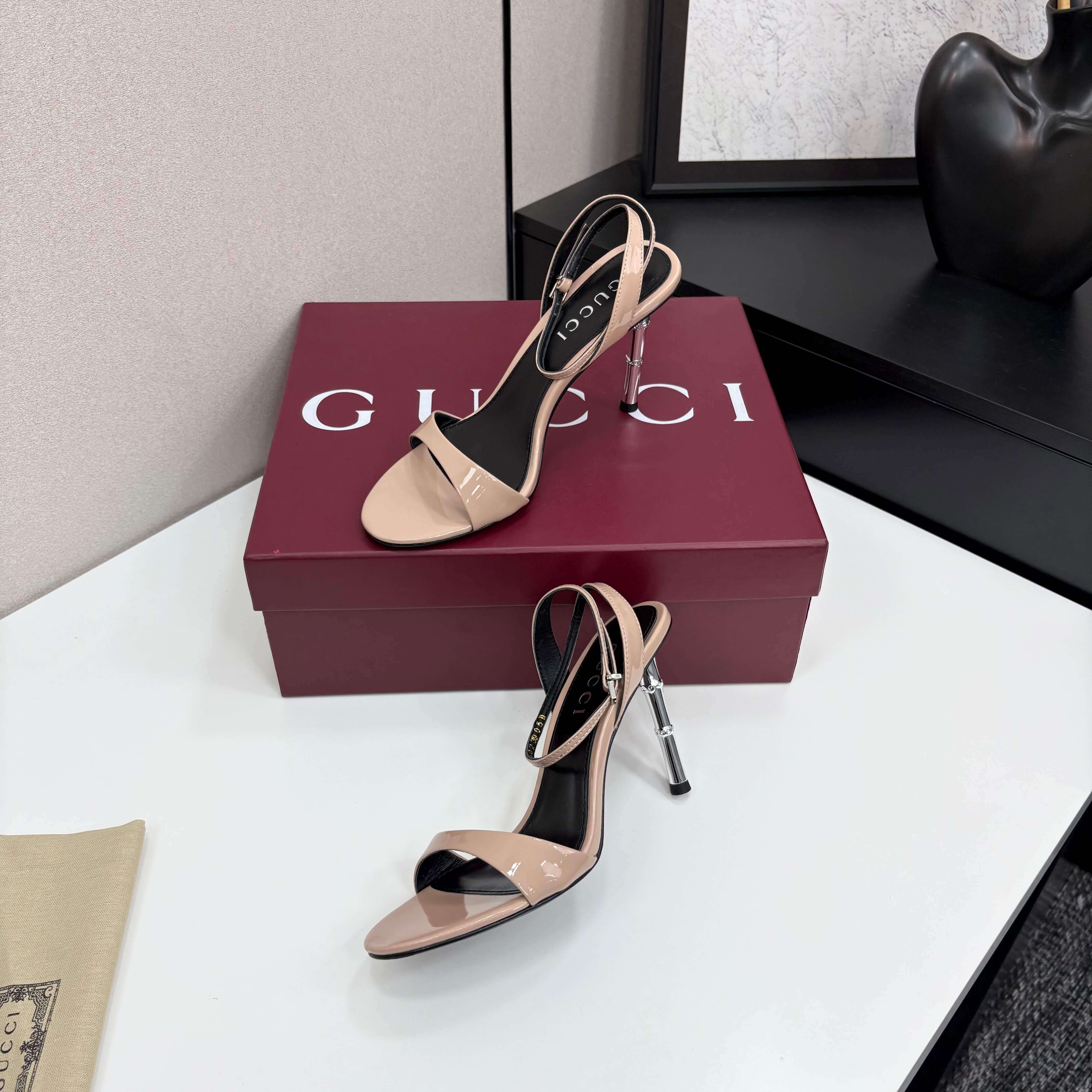 Embrace versatile sophistication with the elegant Gucci Women’s Beige Open-Toe Slingback Sandals. These chic sandals feature a timeless beige finish, likely in a lustrous patent leather, offering a leg-lengthening effect and seamless integration into any wardrobe. The chic open square-toe design provides a modern aesthetic, while a comfortable wide strap gracefully crosses the vamp. An elegant slingback strap ensures a secure and refined fit around the ankle. A distinctive silver-toned bamboo-effect stiletto heel provides an iconic and unique design element, blending natural inspiration with luxurious craftsmanship and offering a subtle contrast to the sophisticated beige upper. Perfect for professional settings, formal events, or any occasion where refined style and understated luxury are desired .