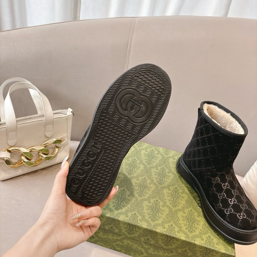 Step into a realm of refined texture and unwavering style with every stride. These Gucci Women’s Black GG Suede Boots in deep black are your invitation to walk with confident elegance and sophisticated comfort. The iconic Gucci GG pattern, beautifully embossed on rich black suede, whispers of understated luxury and tactile richness. Lined with plush shearling, they envelop your feet in cozy warmth, making them as comfortable as they are undeniably chic. More than just boots, they are a statement of timeless allure and refined individuality, promising to elevate your every look with a touch of enigmatic glamour and confident sophistication, whether you’re navigating city streets or embracing cozy evenings.