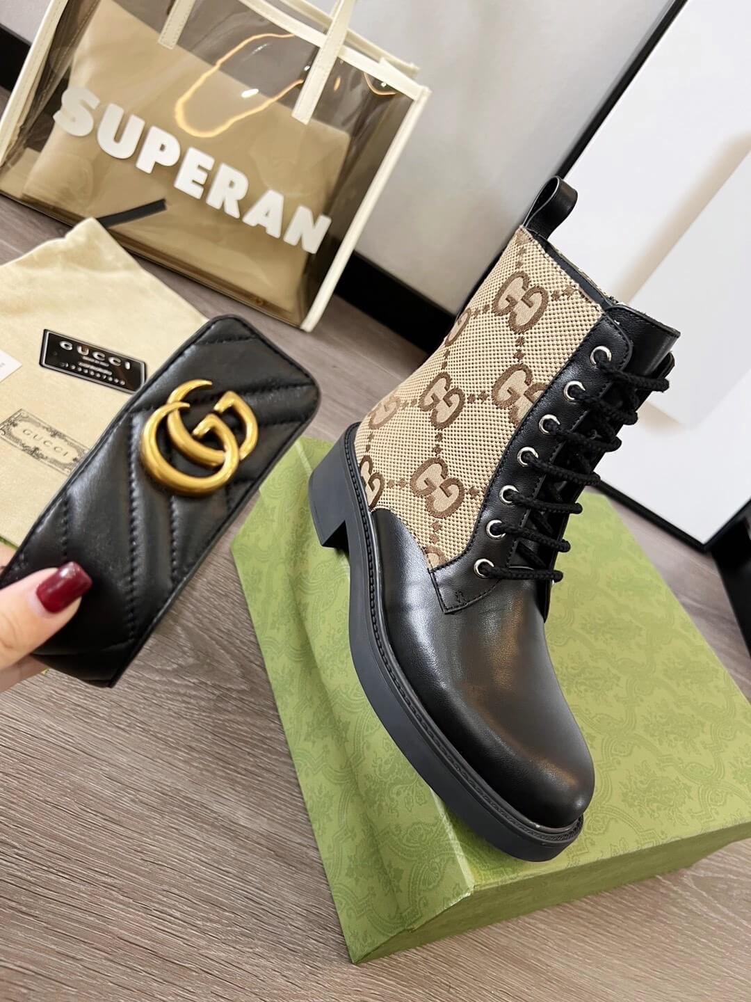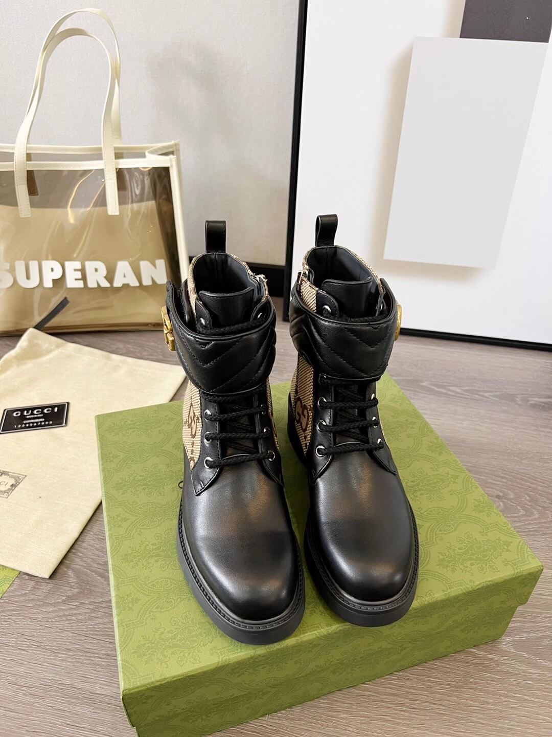 These Gucci lace-up boots blend the iconic GG canvas with smooth black leather for the woman who embraces heritage and modern edge. The fusion of textures creates an effortlessly chic contrast, while the quilted ankle strap adorned with the signature Gucci Double-G emblem adds a touch of refined opulence. Feminine yet fierce, these boots promise an unforgettable look—because so are you.