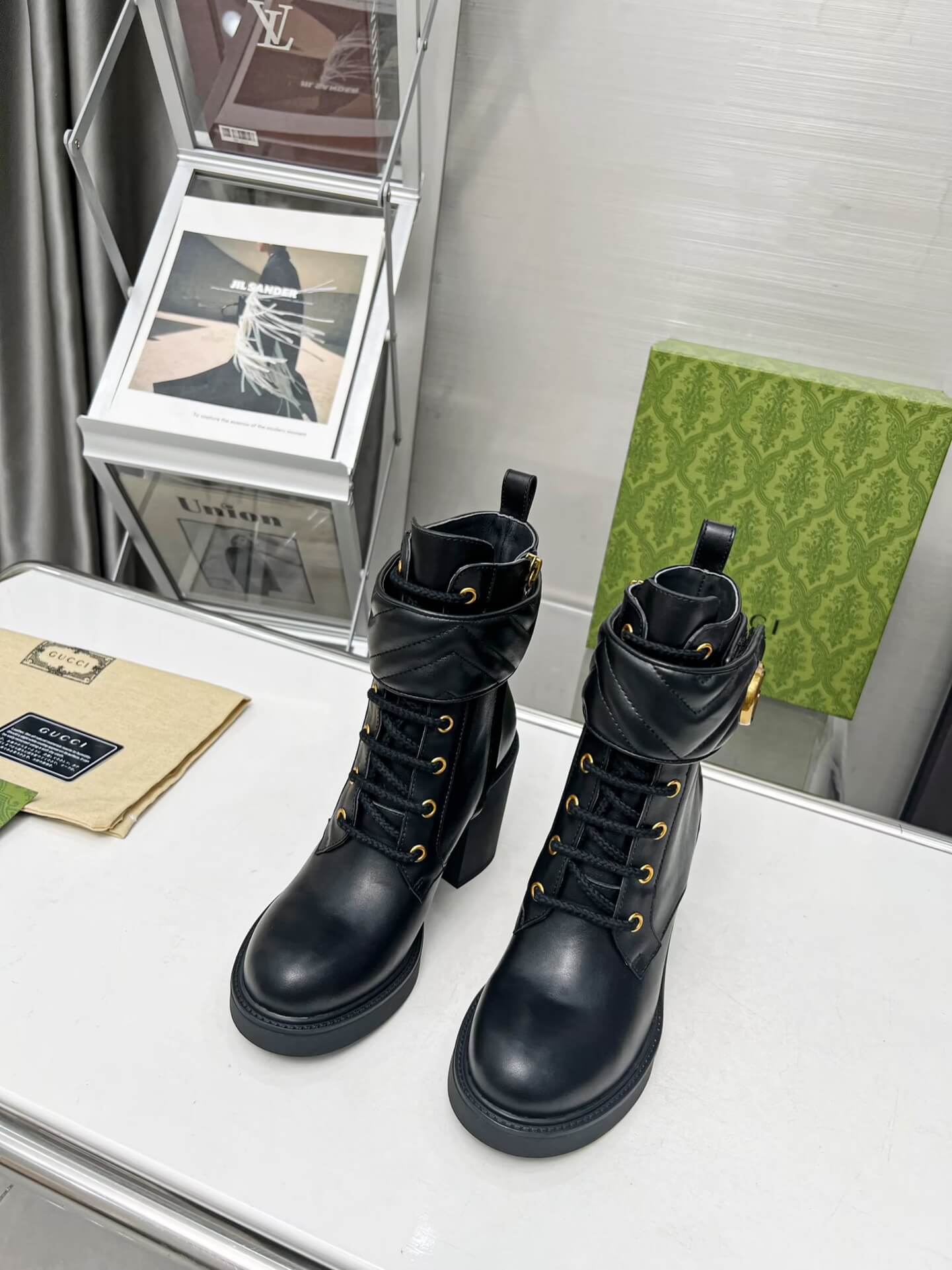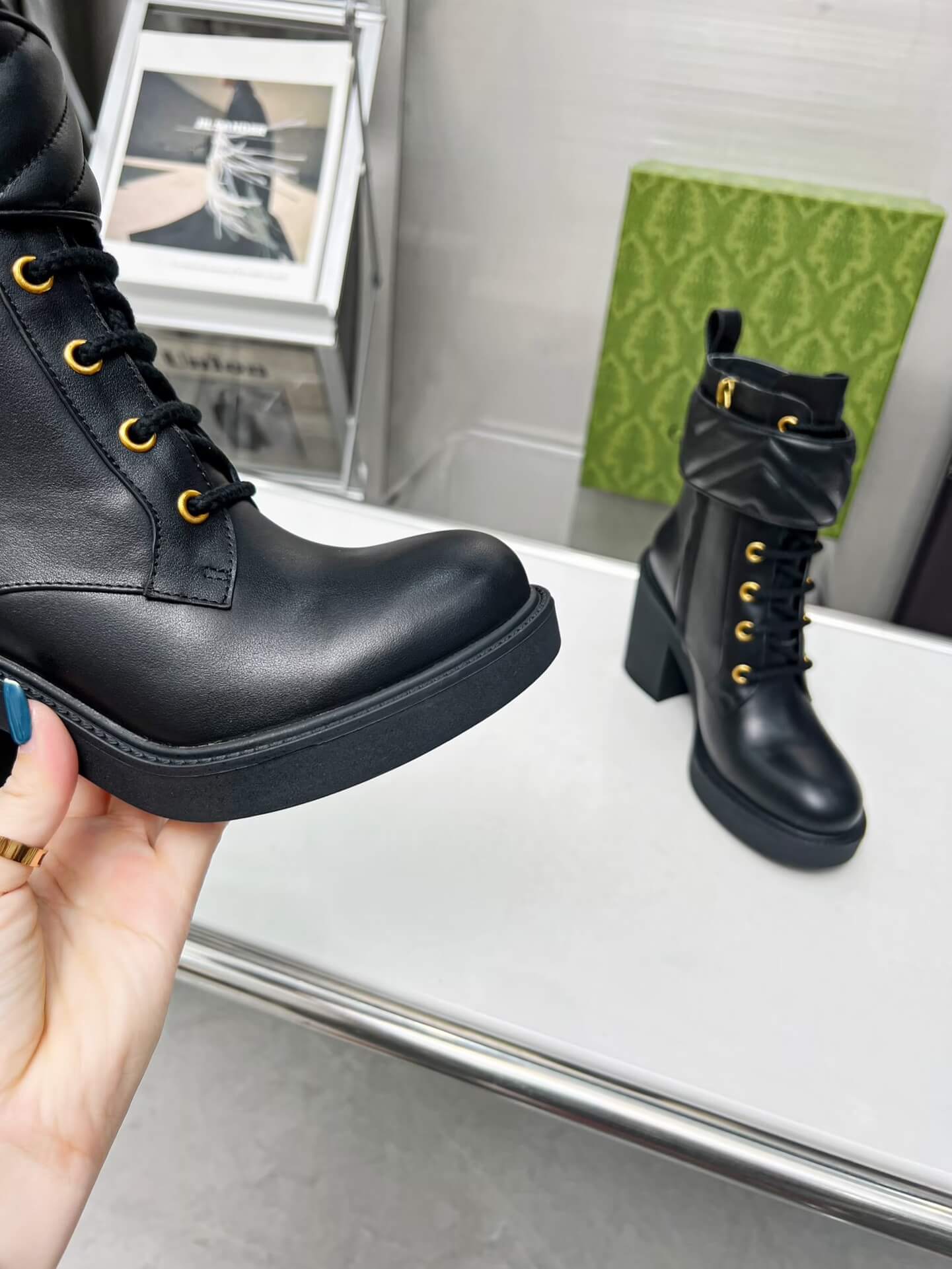 Command attention with every step in these Gucci Women’s Double-G Black Leather Mid-Heel Lace-Up Boots—where luxury meets rebellion. Crafted from sleek black leather, they boast a bold chunky heel, quilted ankle detailing, and the iconic gold-tone Double-G plaque for a signature touch. The lace-up front adds a rugged edge, while the polished silhouette keeps it chic. A perfect blend of power and poise, designed for the woman who owns every room she walks into.