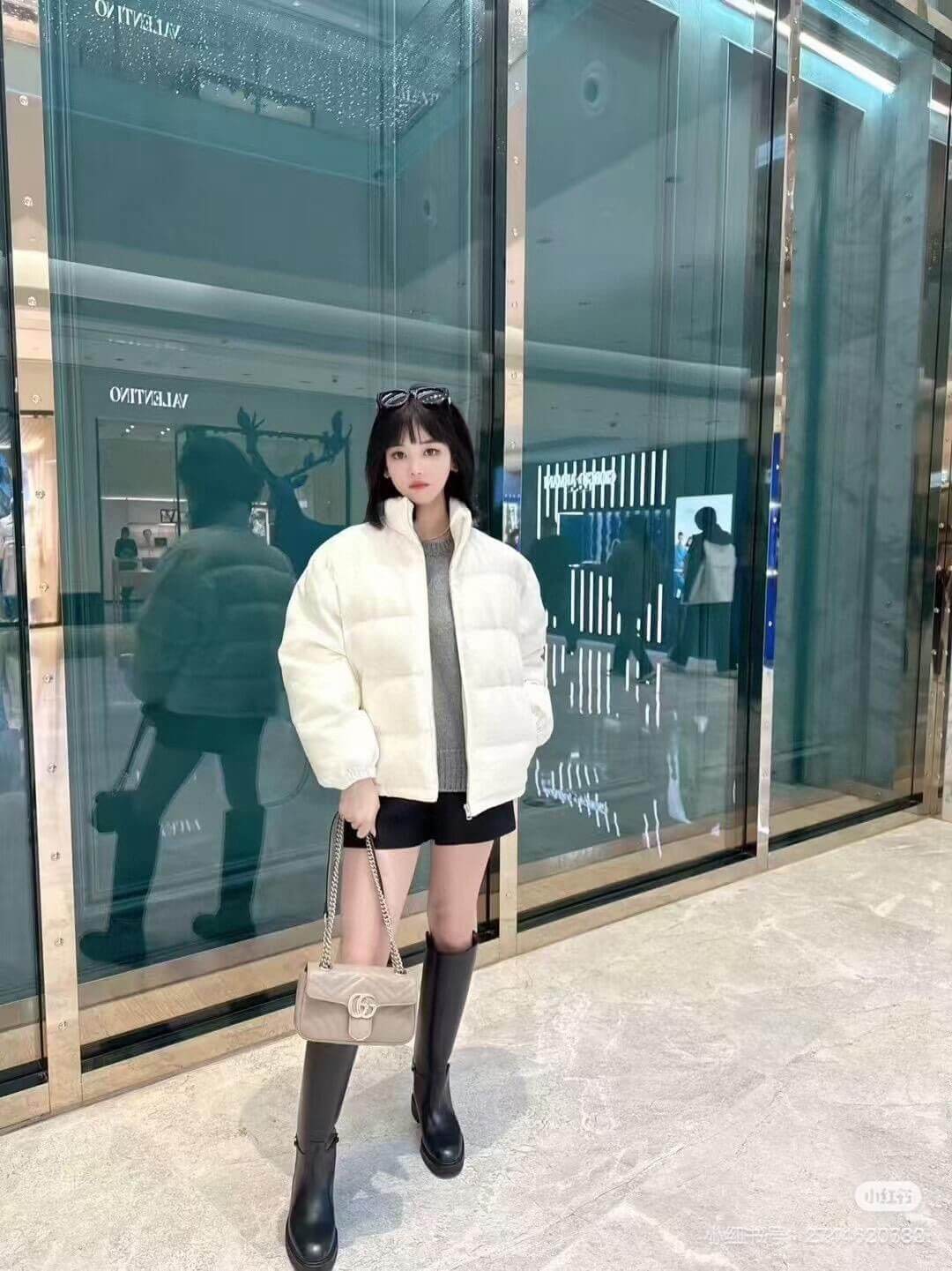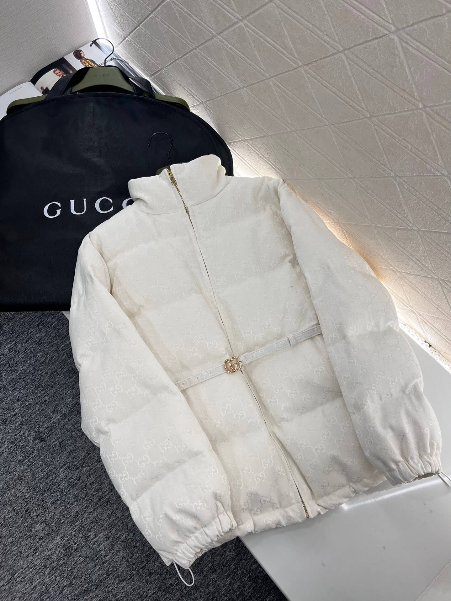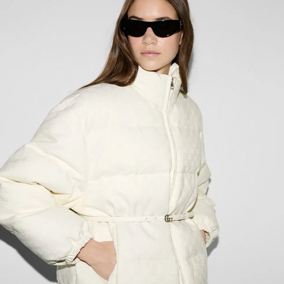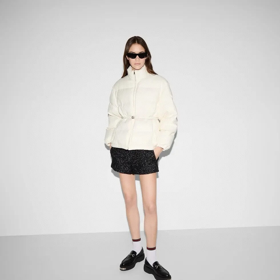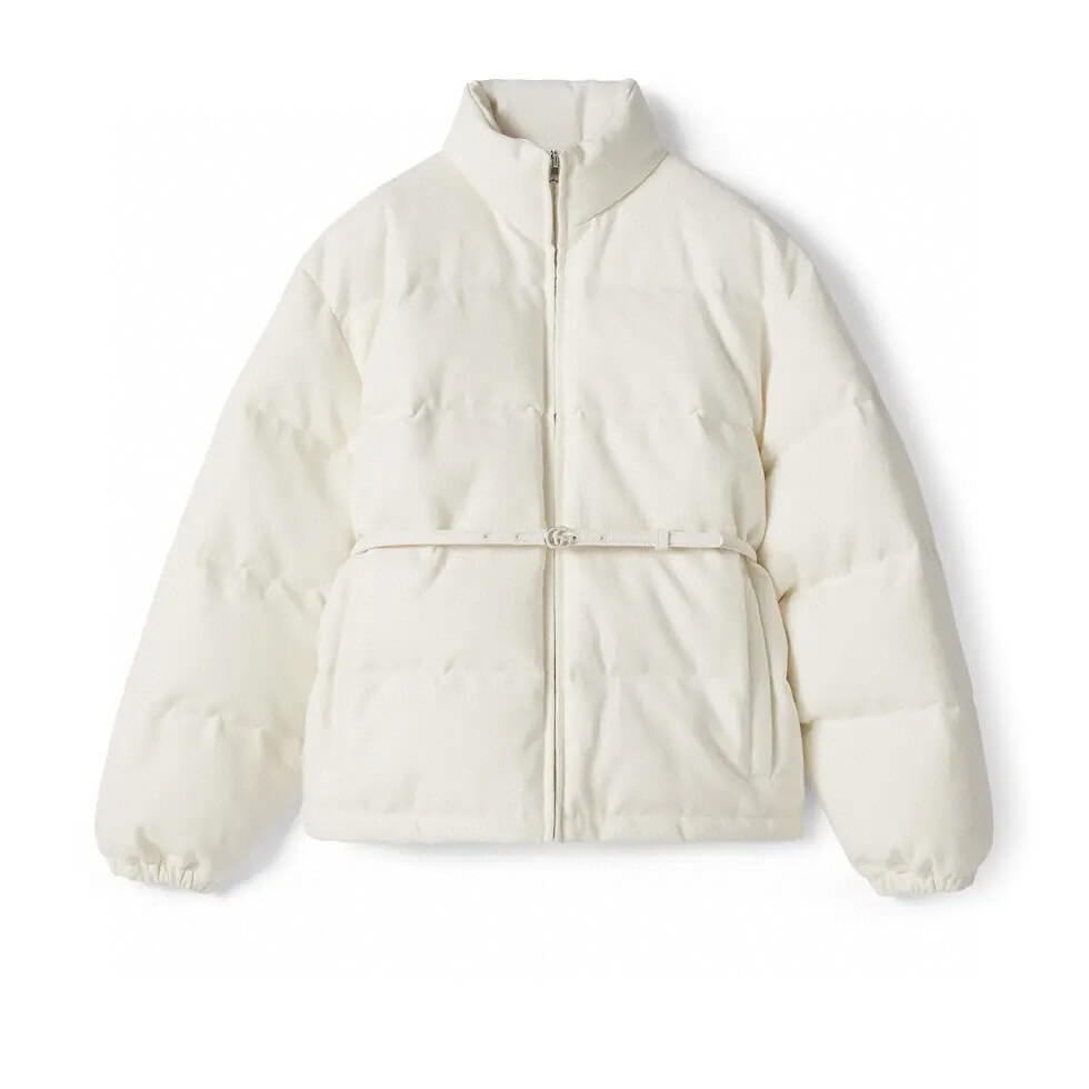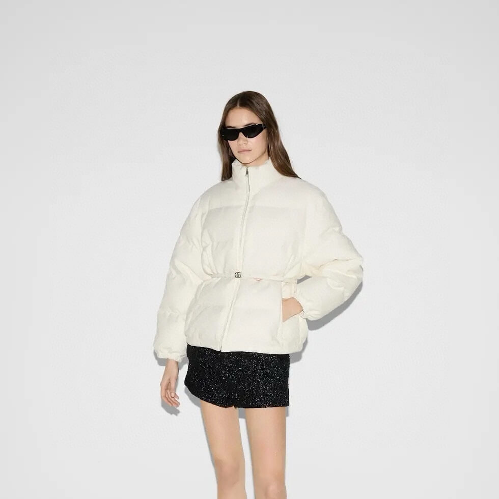 This luxurious jacket offers a perfect blend of warmth and sophistication, featuring the iconic GG canvas pattern in a crisp white hue. Its versatile design is enhanced with a detachable leather belt, allowing you to customize your fit while staying cozy during the colder months. A timeless piece that effortlessly elevates your outerwear collection, this bomber jacket is both stylish and functional.