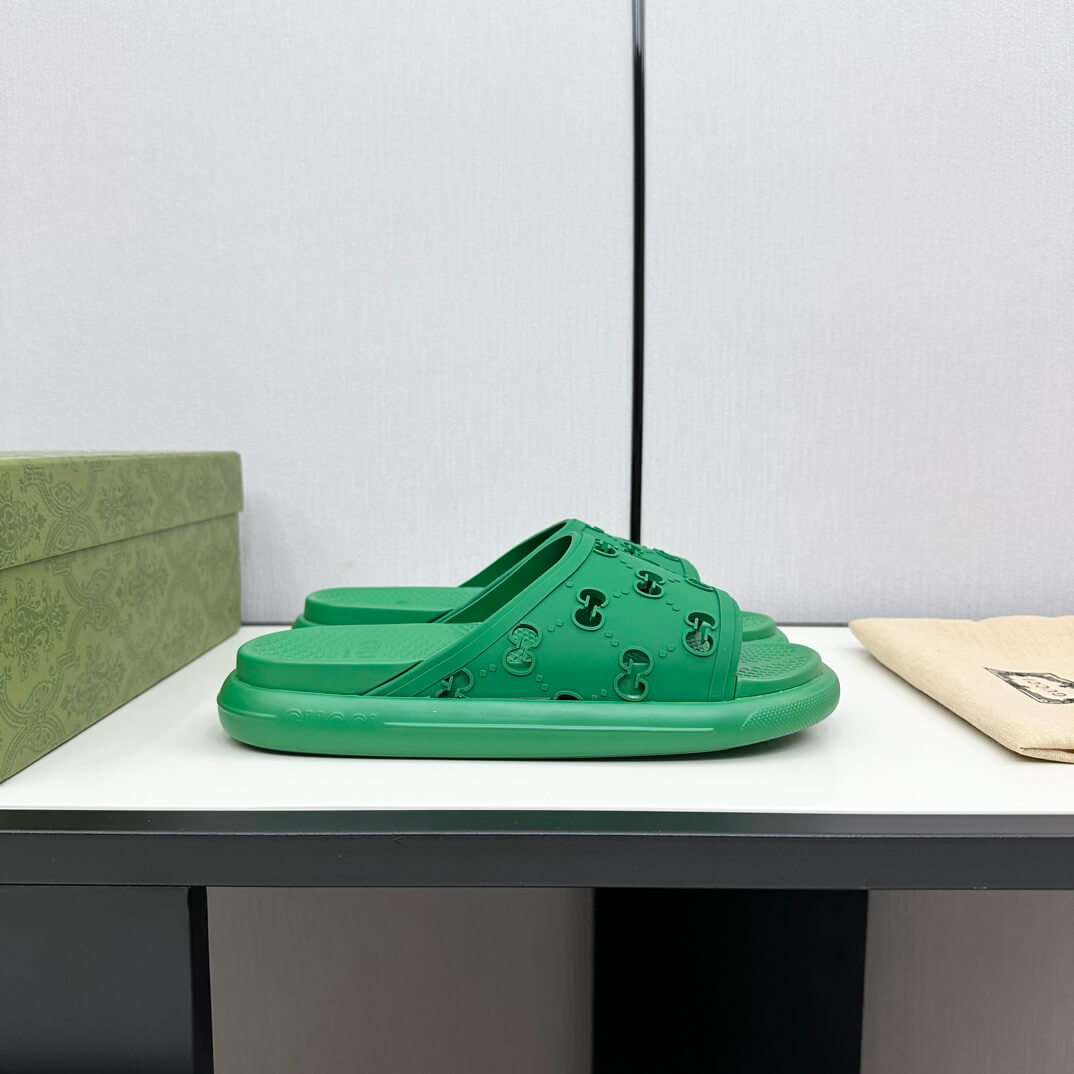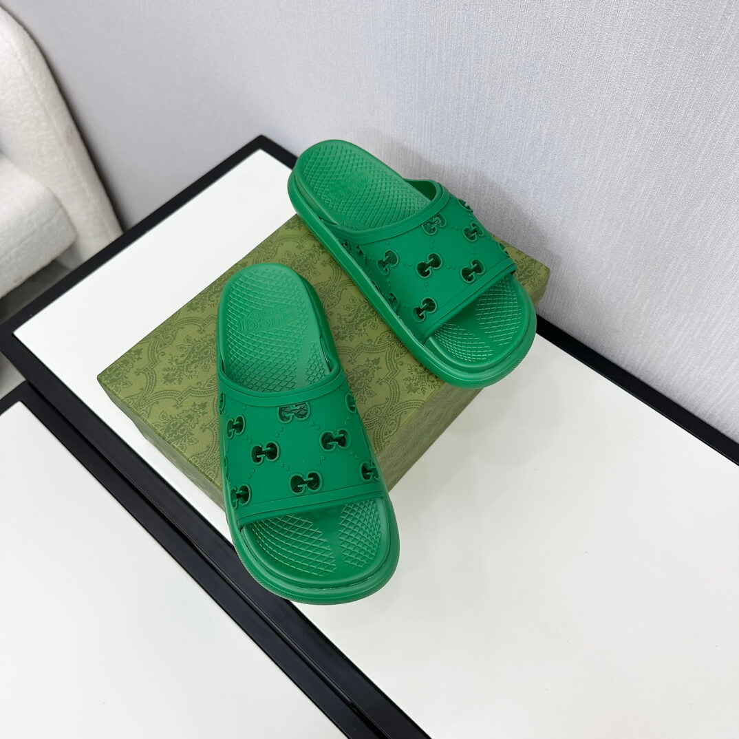 Vibrant and effortlessly stylish, these green cutout GG rubber slides are a bold take on casual luxury. The iconic GG motif is reimagined in a perforated design, adding texture and depth to this modern silhouette. Crafted from lightweight rubber, they offer cushioned support for easy, everyday wear. Whether you’re strolling the city streets or embracing vacation vibes, these slides bring a fresh, playful edge to your look.