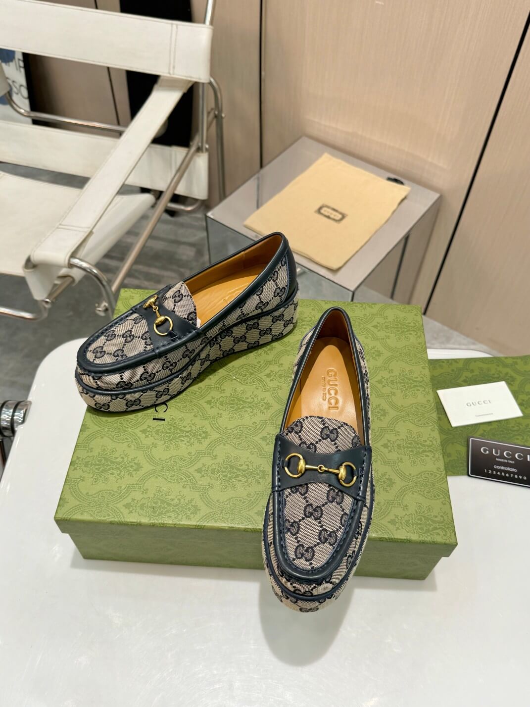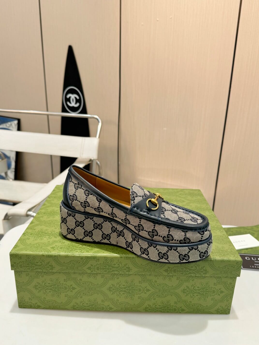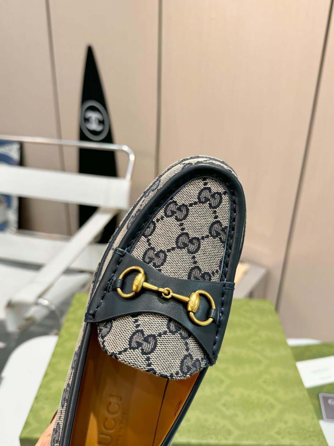 Not just a shoe—a statement. These grey GG canvas wedge loafers are designed for the woman who knows her power and isn’t afraid to show it. The deep grey monogram canvas, elegantly contrasted with dark leather trims, creates a refined yet daring aesthetic. The signature gold-tone Horsebit hardware nods to timeless sophistication, while the platform wedge sole gives you that extra height and confidence to stride into any room as you own it.