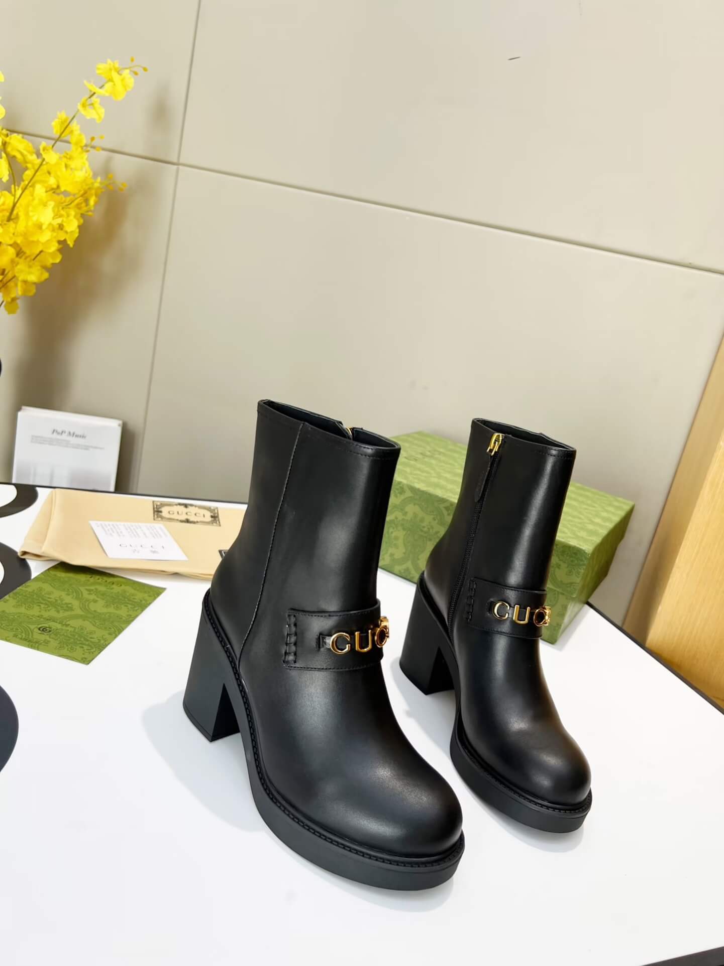 With a vision of bold elegance, these Gucci ankle boots are designed for the woman who confidently moves. Wrapped in luxurious black leather, they exude a refined allure, while the gleaming gold-tone Gucci logo adds a touch of iconic prestige. The sturdy block heel offers both height and stability, making them as comfortable as they are striking. A side zip closure ensures effortless wear, making these boots the perfect statement piece for any occasion.