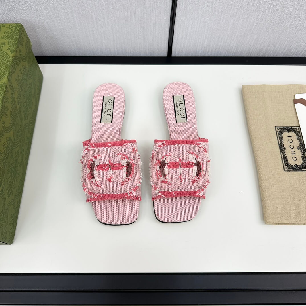 Embrace effortless charm with these pink denim Interlocking G slide sandals, designed for the woman who loves a touch of romance in her style. The frayed denim texture gives them a relaxed yet polished feel, while the monochrome Interlocking G emblem adds a signature statement of luxury. Perfect for sun-soaked days, weekend brunches, or a casual stroll in style, these sandals effortlessly elevate any outfit with a soft yet striking appeal.