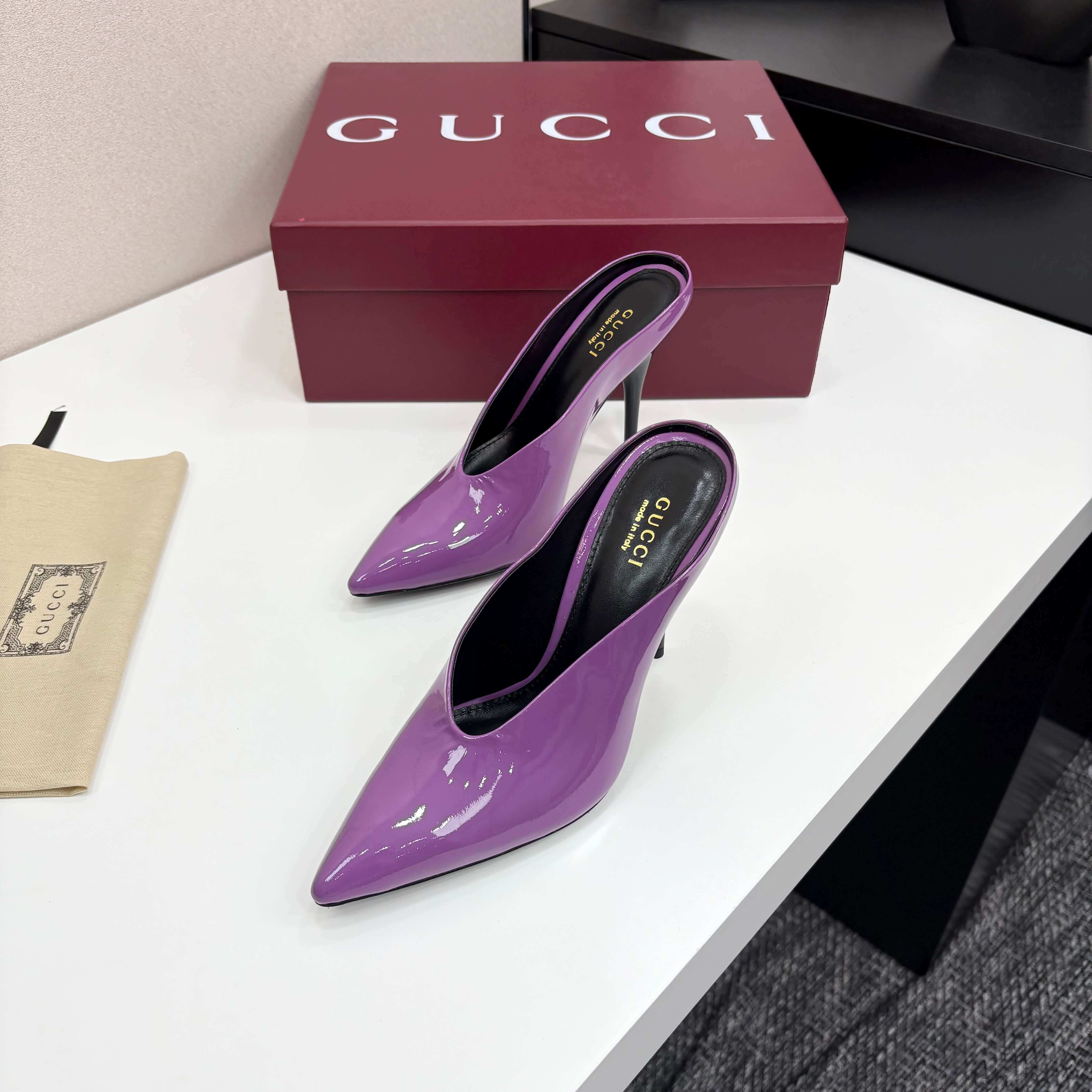 Make a captivating and chic statement with the Gucci Women’s Purple Shiny. These alluring pumps are crafted from a rich, vibrant purple shiny patent leather, offering a lustrous finish that beautifully catches the light with every movement. The sleek pointed toe design creates an elongating effect, while the slender stiletto heel provides an elegant lift, perfect for exuding confidence and high-fashion allure. With their striking color and polished silhouette, these pumps are an ideal choice for adding a bold splash of individuality to evening wear, special events, or contemporary fashion ensembles.