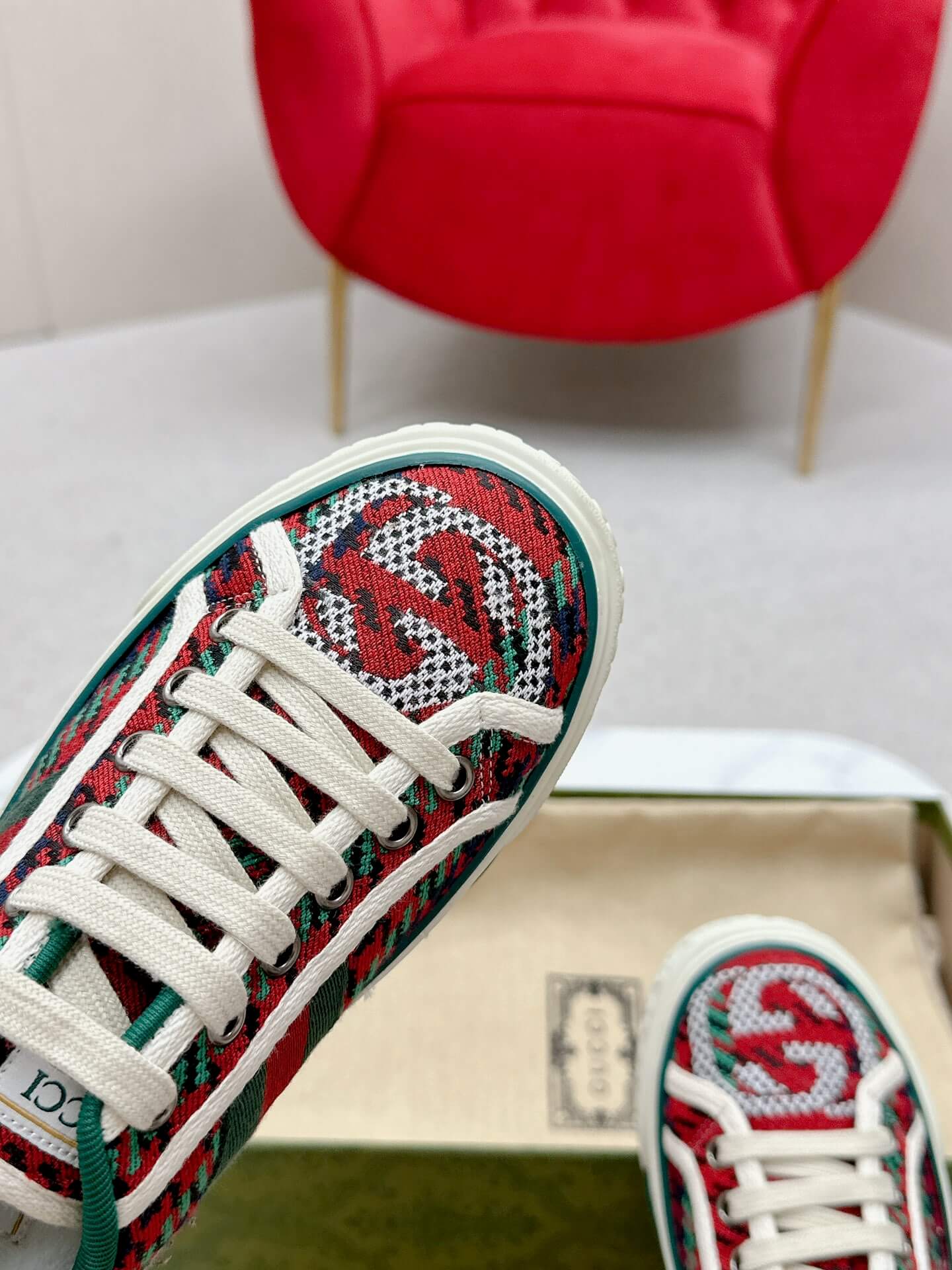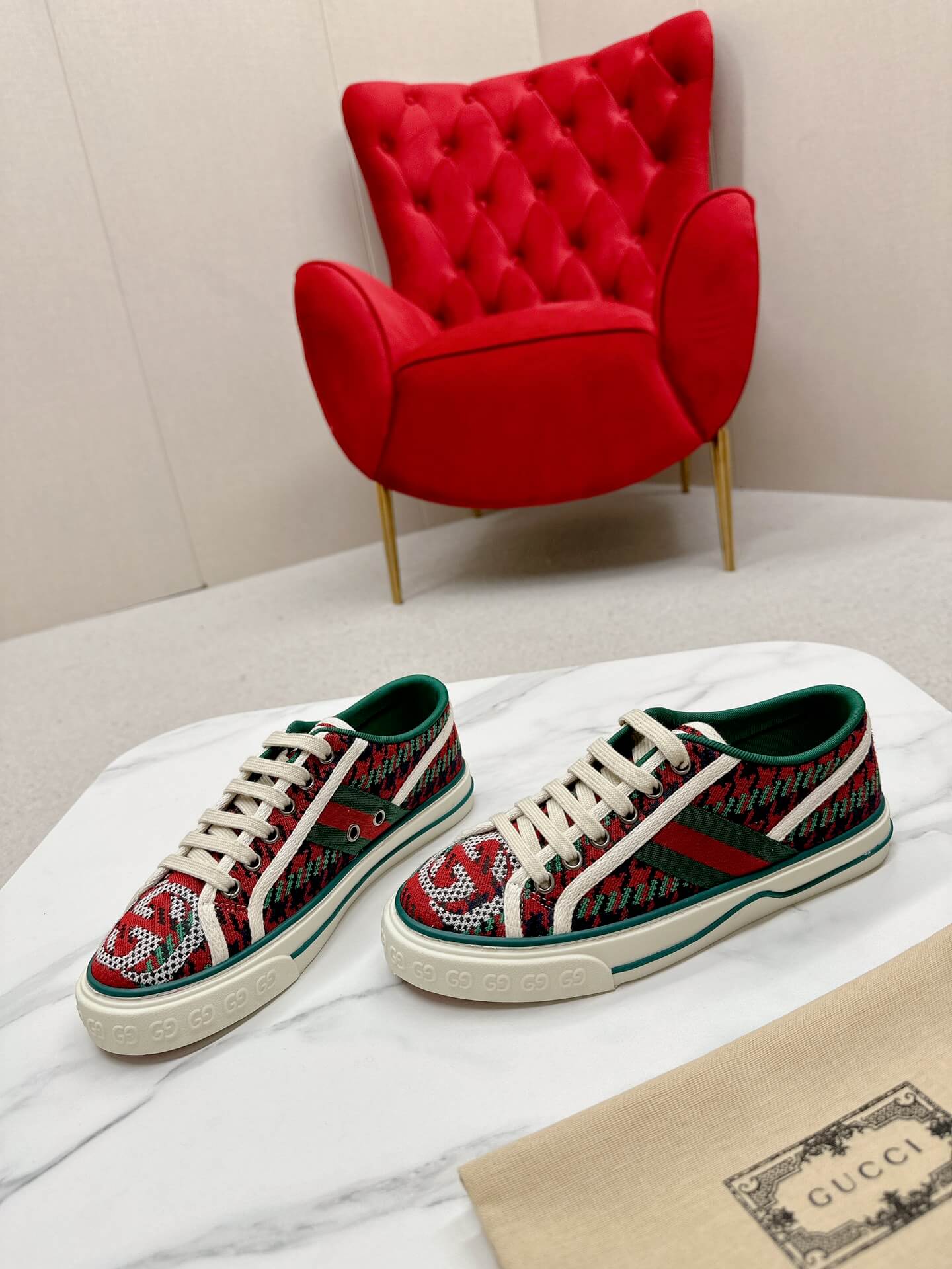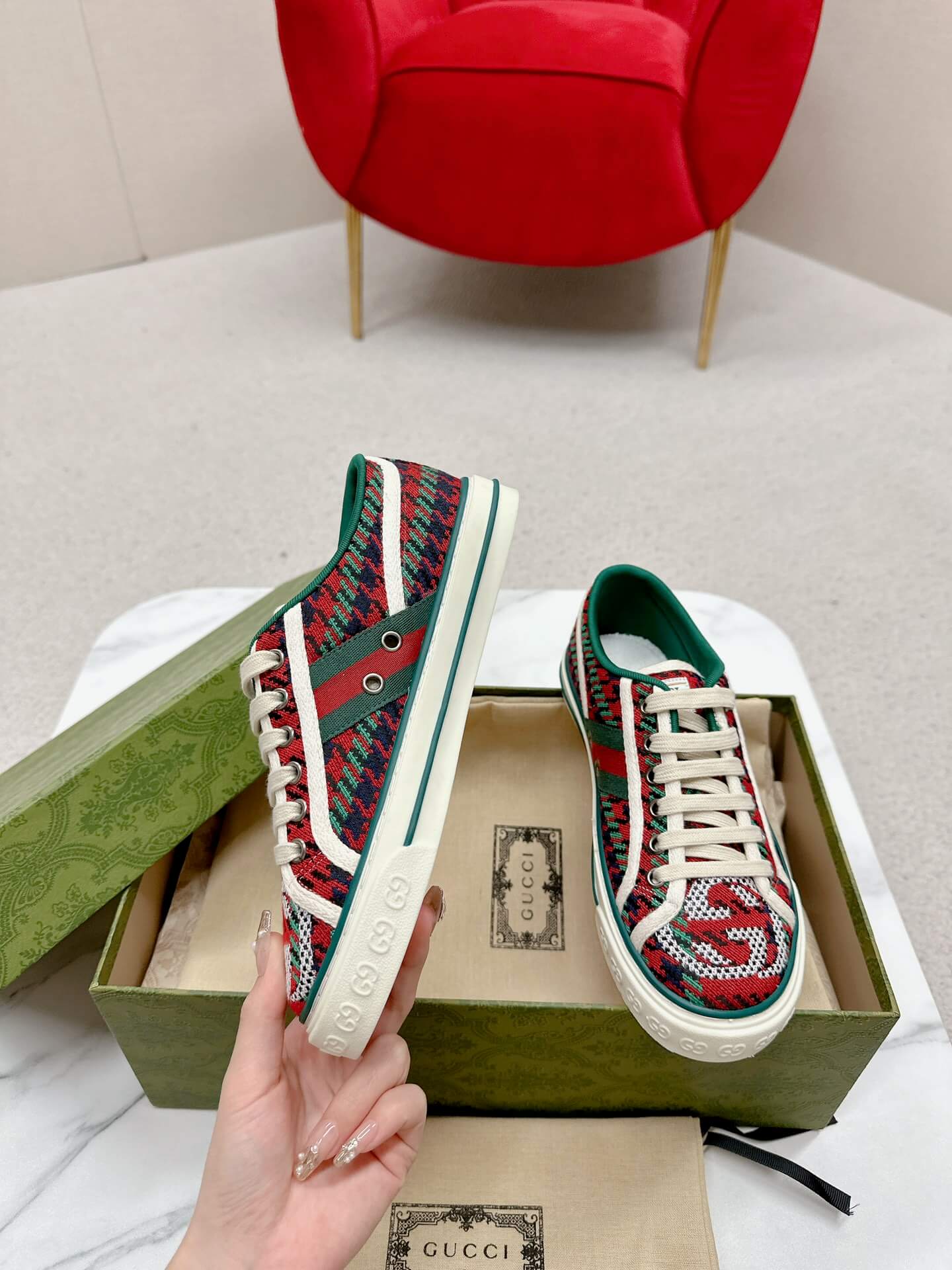 Add a bold statement to your sneaker collection with the Gucci Women’s Red & Green Houndstooth Wool Tennis 1977 Sneaker. Featuring a striking mix of heritage houndstooth and the brand’s signature web stripe, this design brings a playful yet refined charm to any outfit. The interlocking GG detailing enhances its iconic appeal, while the soft wool-blend fabric adds a cozy yet stylish texture. Paired with a cushioned rubber sole, these sneakers ensure both comfort and fashion-forward versatility, perfect for elevating casual ensembles or making a standout statement in streetwear.