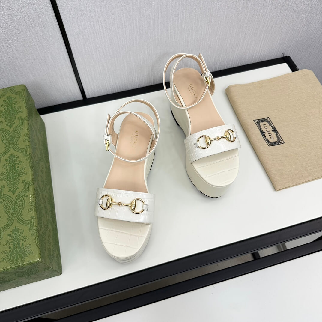 Grace in every step—these pristine white alligator skin platform sandals are a vision of modern luxury. Designed with an elevated silhouette, they feature Gucci’s signature gold-tone Horsebit hardware, bringing a touch of timeless sophistication. The adjustable ankle strap ensures a secure yet elegant fit, making them the perfect pair for anything from chic summer dresses to tailored evening looks.