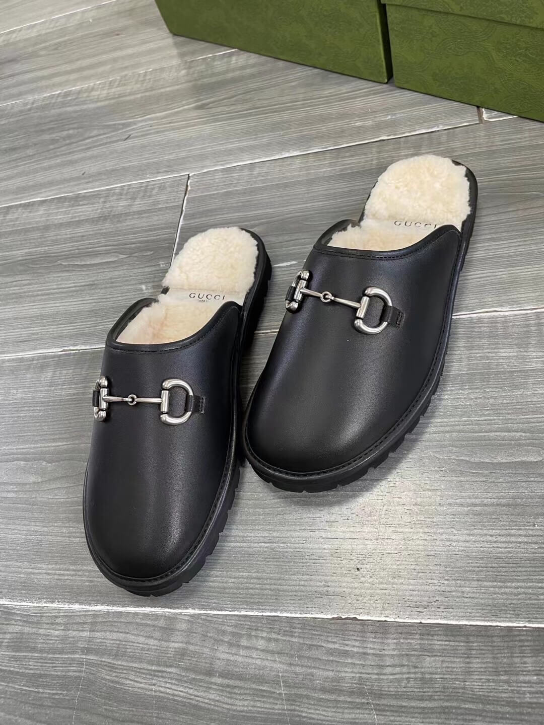Treat your feet to the quiet indulgence of pure, unadulterated luxury. These Gucci Women’s Leather Mules are rich in black and designed for serene comfort and timeless style at home. Crafted from the finest supple black leather and lined with sumptuously soft shearling, they offer an experience of refined relaxation with every step. The iconic Gucci horse-bit detail adds a subtle touch of enduring elegance, making these mules a sophisticated and versatile addition to your loungewear collection, whispering Italian luxury with every wear.
