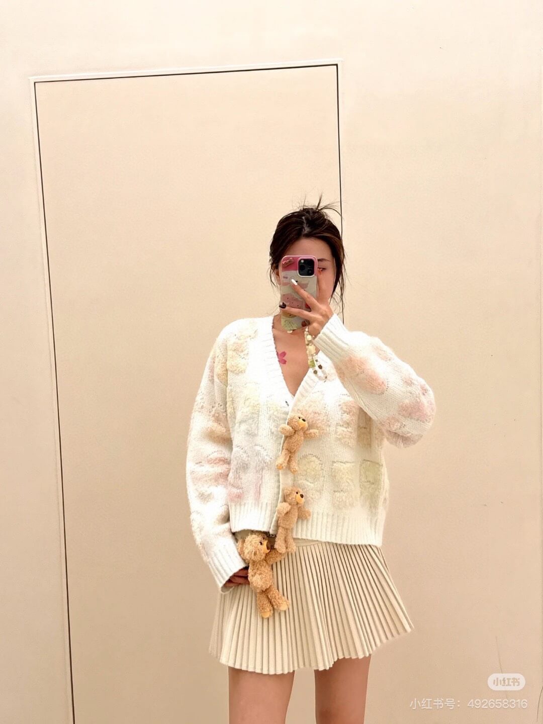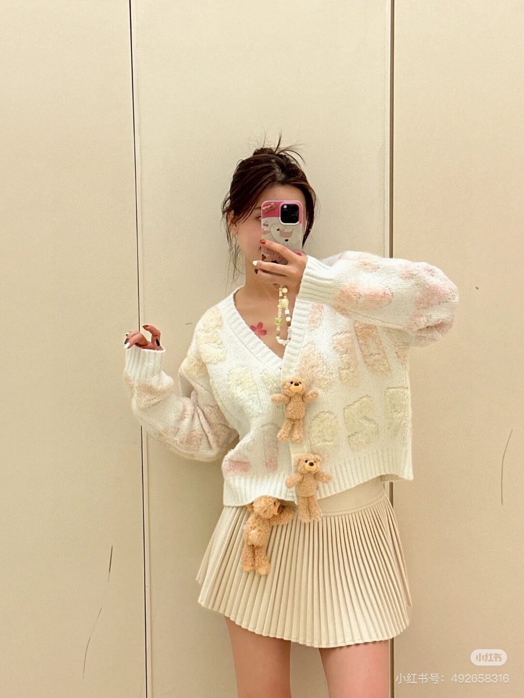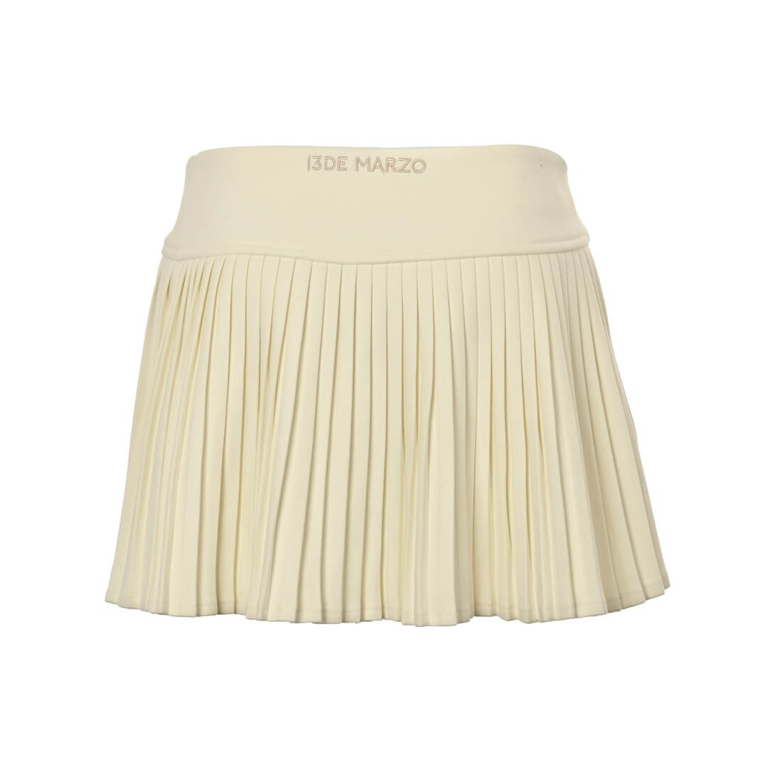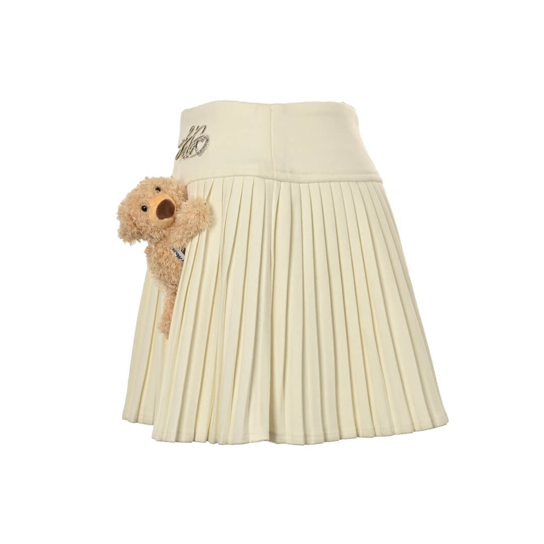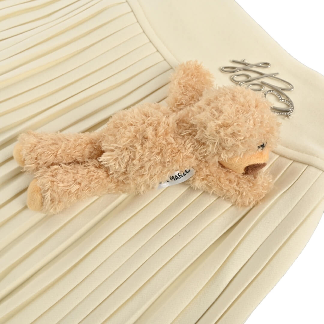 Showcase your unique style with this elegant ivory cassimere pleated mini skirt. Its meticulously crafted pleats create a graceful, flowing silhouette, while the charming plush teddy bear accent adds a playful touch of personality. Perfect for both sophisticated and casual occasions.