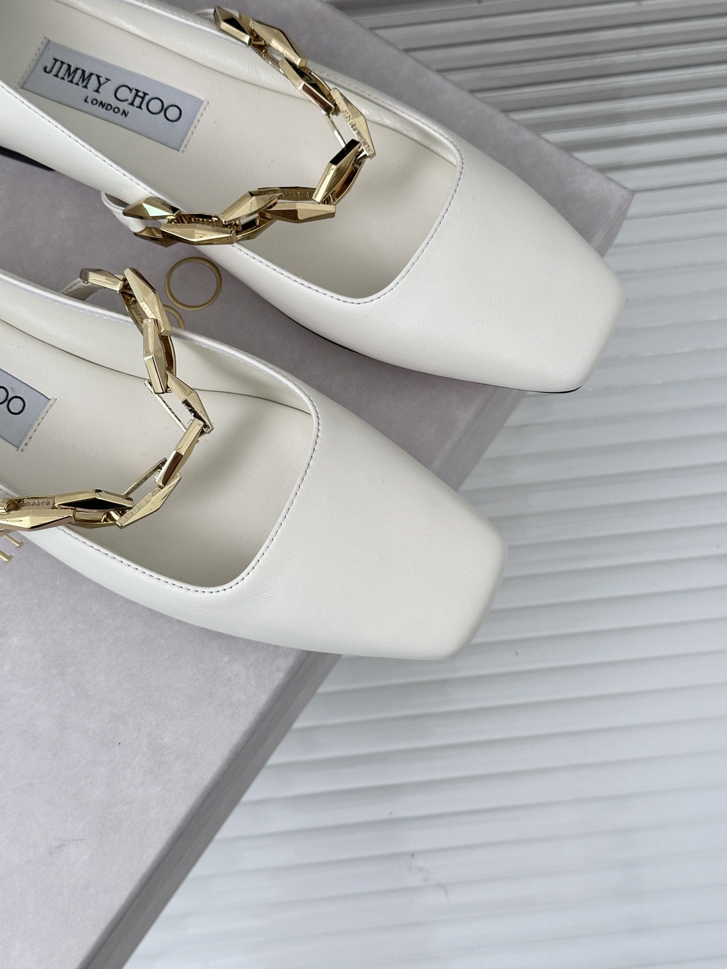 Step into refined minimalism with the Diamond Tilda Flat in White Nappa Leather, inspired by the modern luxury of Jimmy Choo. Crafted from supple white nappa leather, these flats feature a sleek silhouette accented by a subtle chain detail and a sculptural diamond-patterned sole. Lightweight and polished, they’re designed to bring comfort and contemporary edge to your everyday wardrobe.