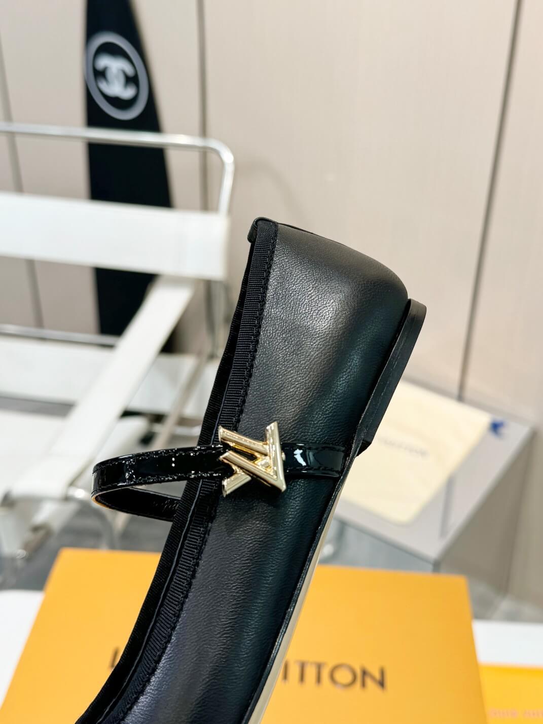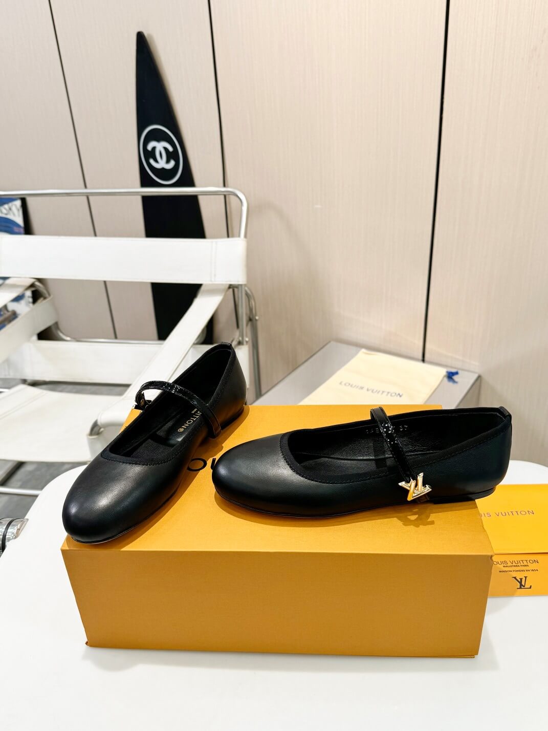 Step into timeless elegance with the Louis Vuitton Babies Ballerina in classic black. Crafted from smooth, premium black leather, this ballerina flat features a refined round-toe silhouette, complemented beautifully by a glossy patent strap adorned with Louis Vuitton’s iconic gold-tone LV emblem. Ideal for everyday chic or sophisticated occasions, it combines comfort with unmistakable luxury.