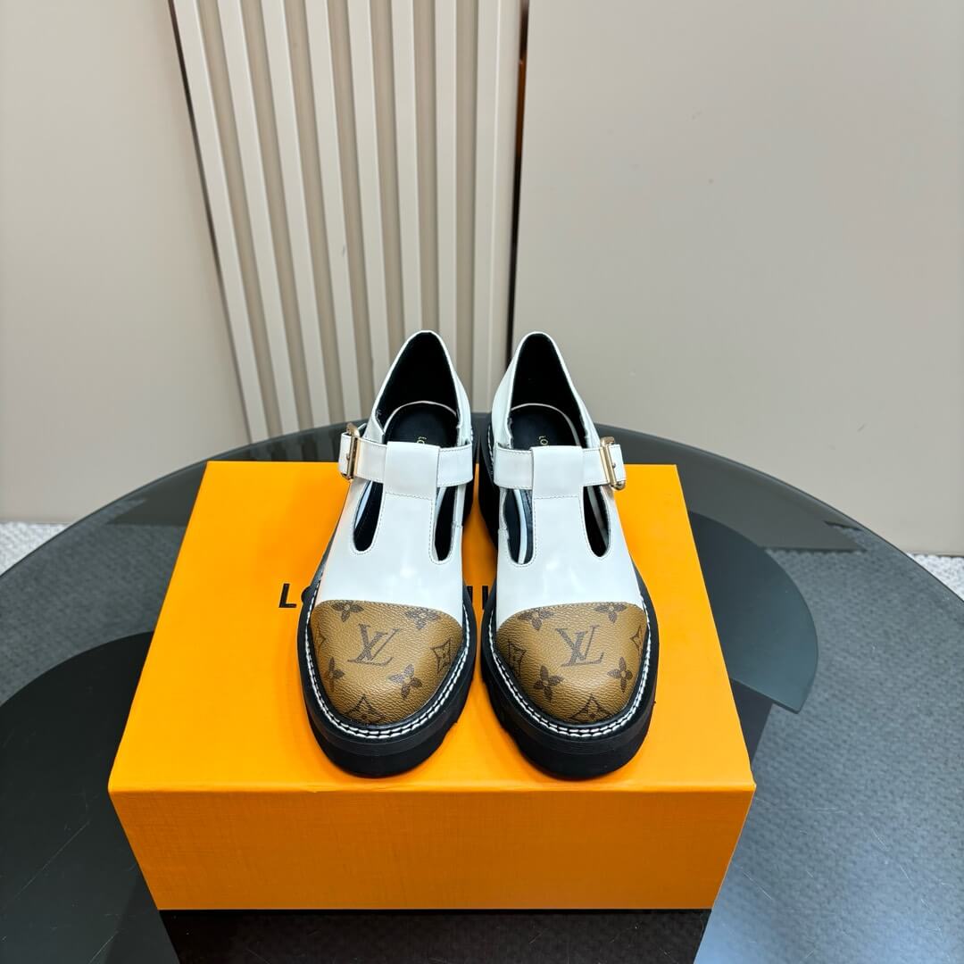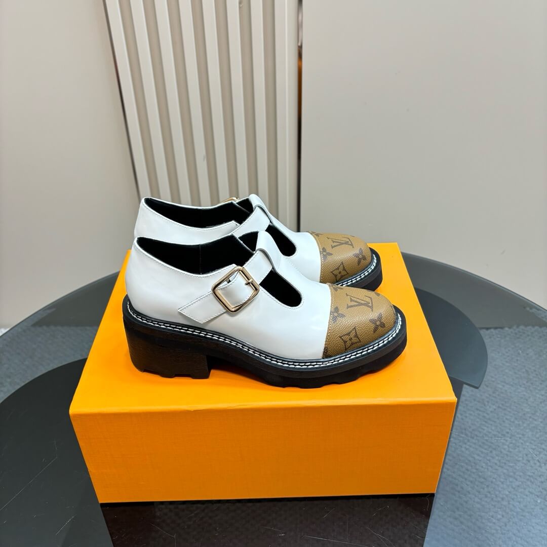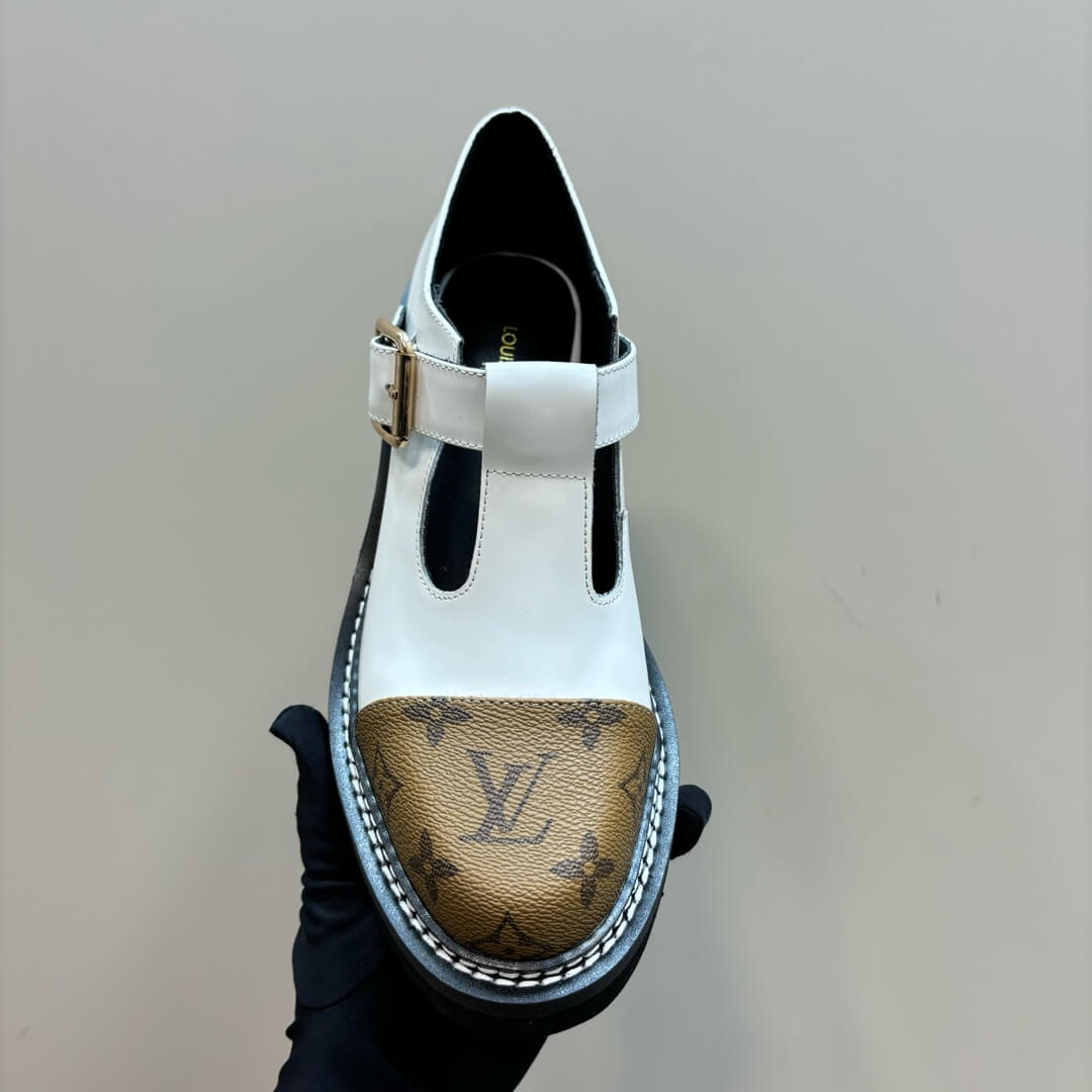 Step up your style game with the Louis Vuitton Beaubourg Platform Derby Shoes in striking white patent leather. These shoes are the perfect blend of timeless sophistication and bold contemporary flair. Featuring a monogram canvas toe cap and a chunky black platform sole, they redefine everyday footwear with a high-fashion twist. The gold buckle strap adds a luxe touch, while the T-strap design enhances the vintage-inspired charm. Comfortable yet statement-making, they’re ideal for adding an edge to casual and semi-formal outfits alike.