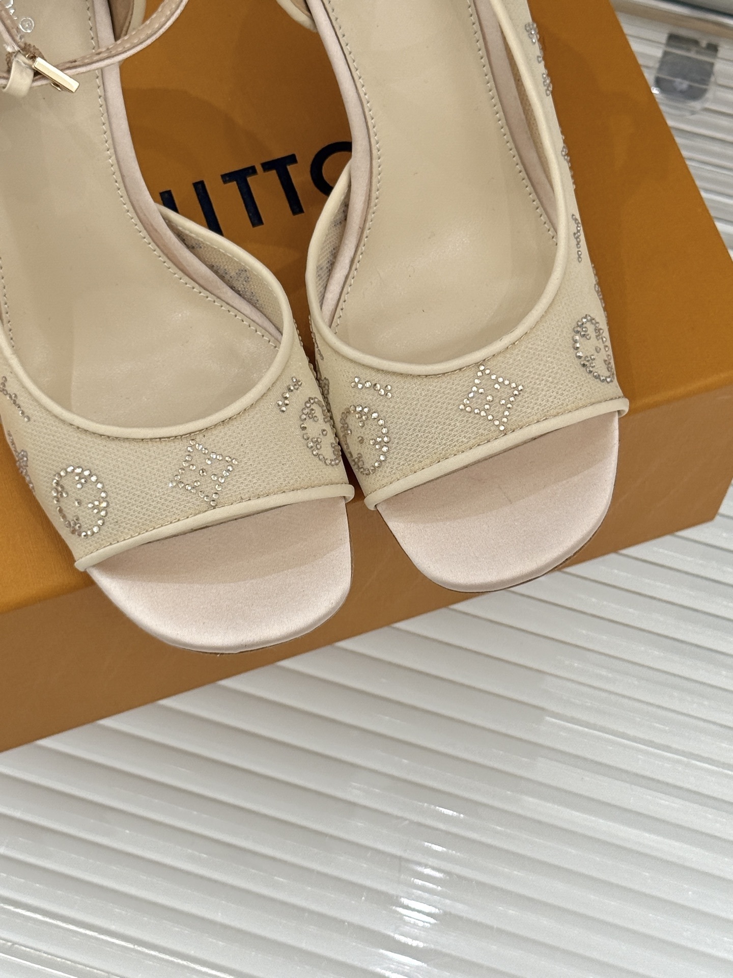 Features: Crystal LV Monogram pattern, open toe, ankle strap with buckle, elegant silhouette