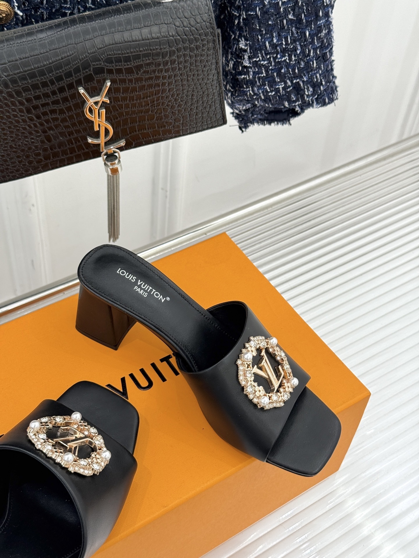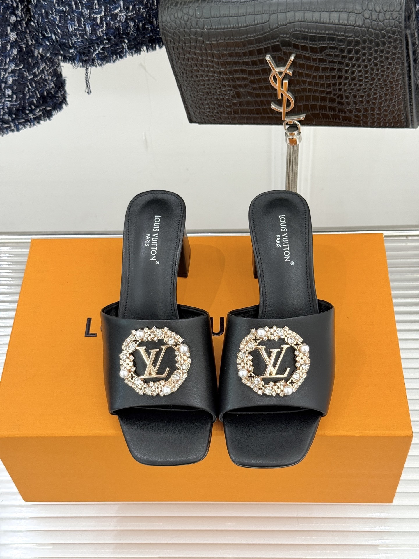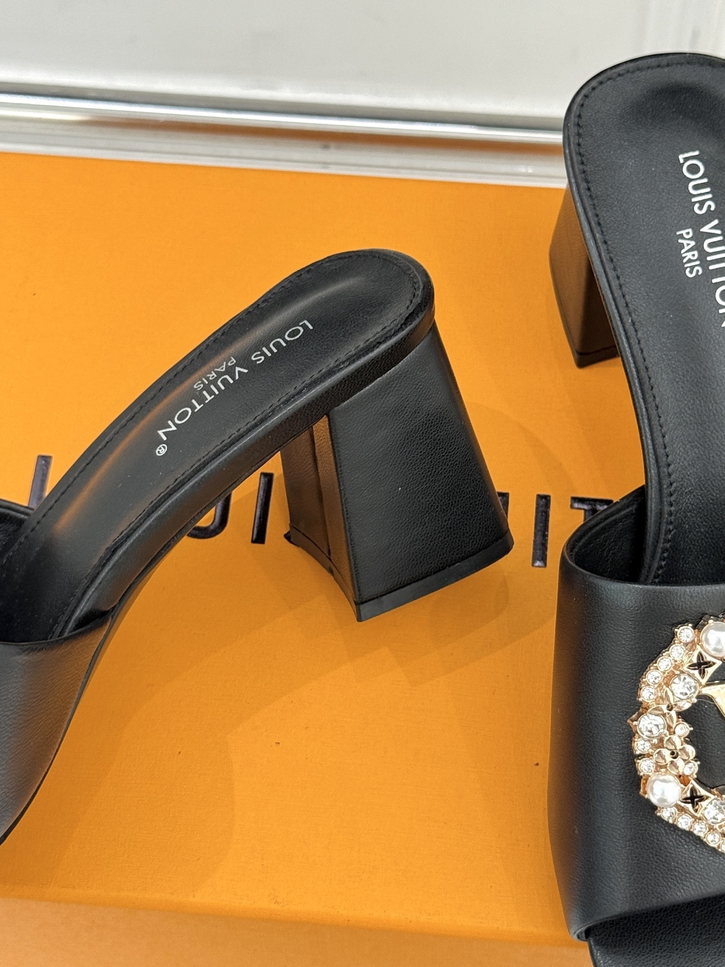 The wide strap is adorned with a gold-tone LV monogram medallion encircled by shimmering crystals and delicate pearl accents, creating a striking contrast against the deep black base. The sculpted mid block heel ensures stability and comfort, while the square open toe enhances the contemporary silhouette.