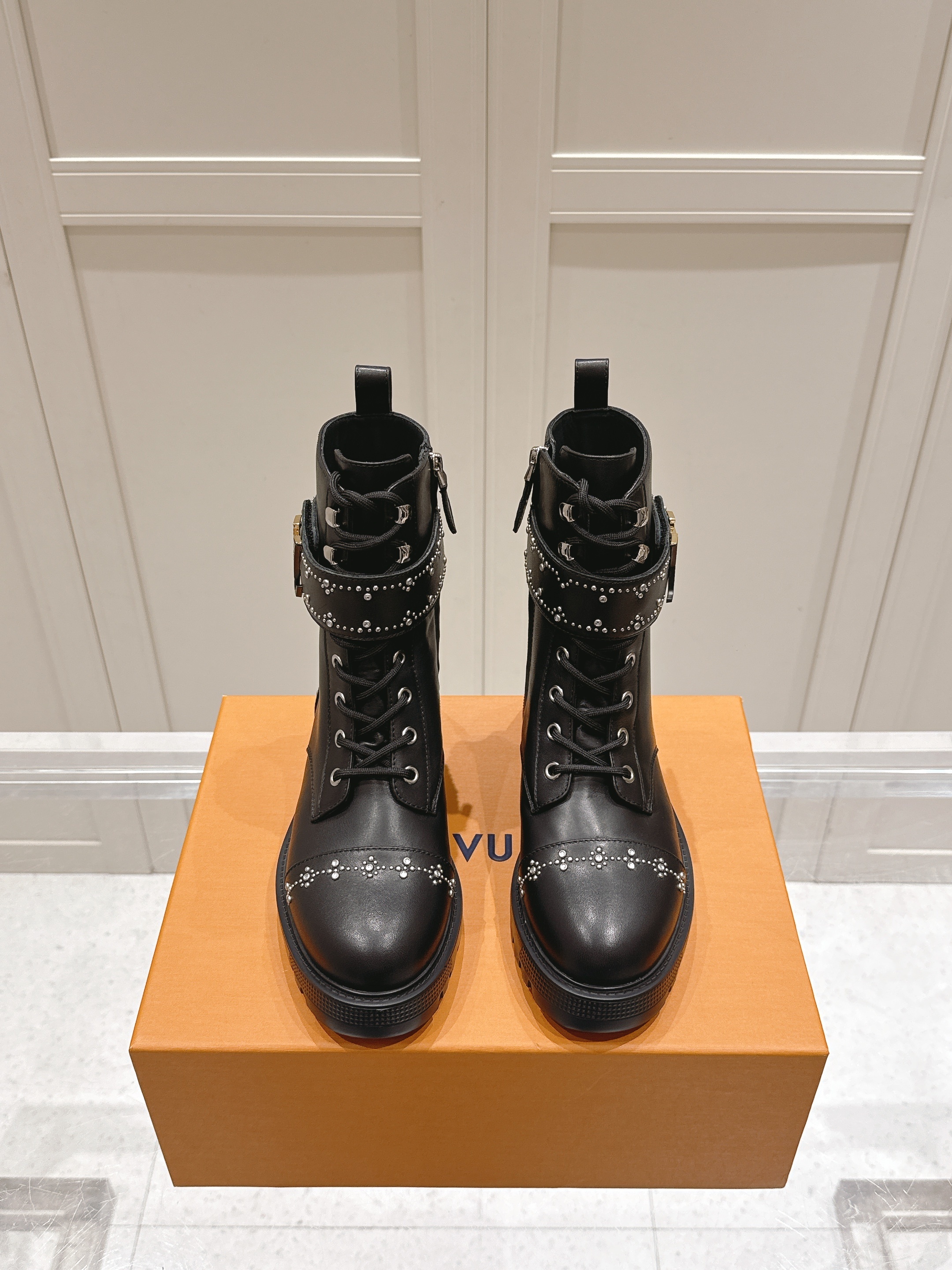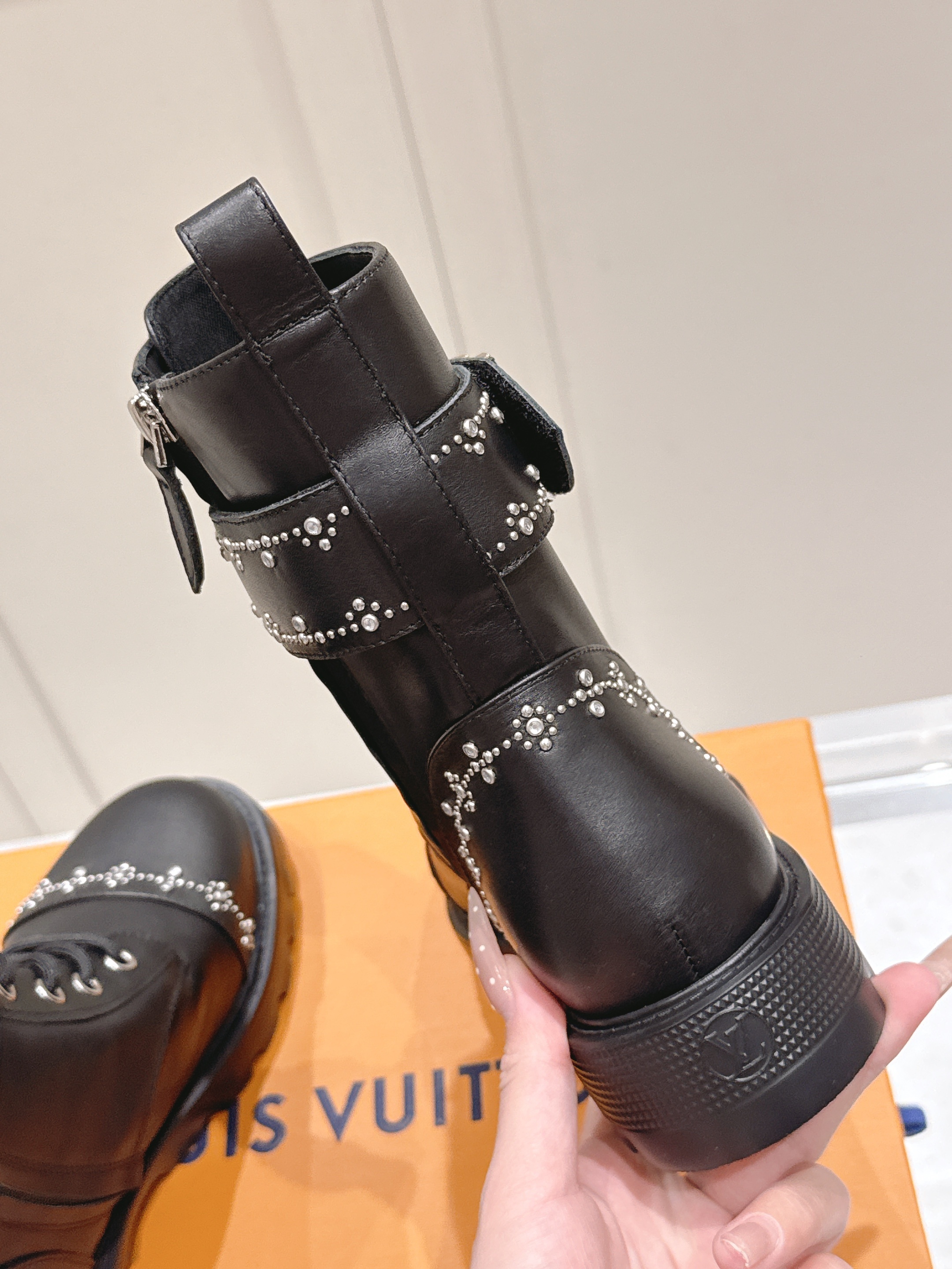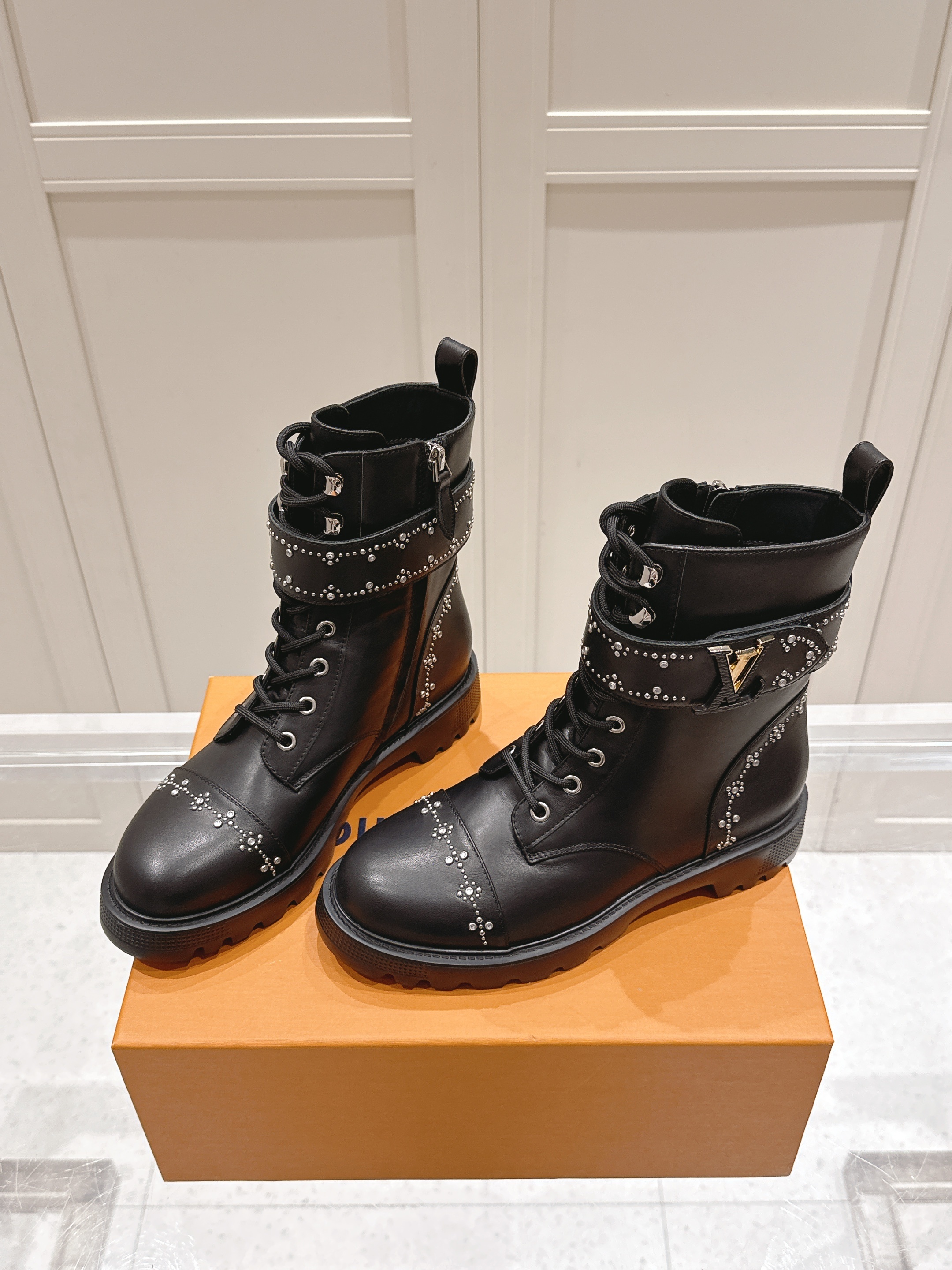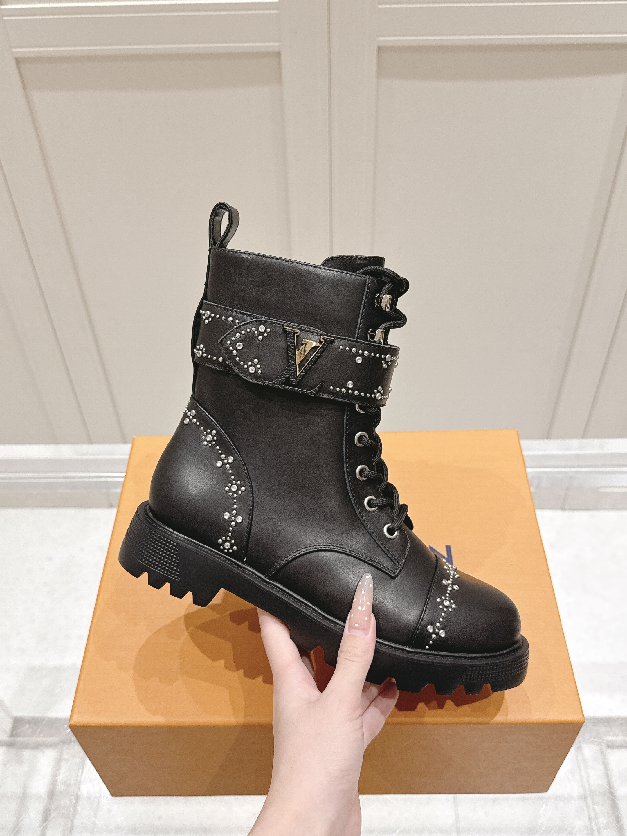 A standout element is the wide ankle strap adorned with shimmering studs and finished with a polished gold-tone LV emblem — adding both attitude and iconic flair. The lace-up front offers a classic combat aesthetic, while the rugged notched sole ensures durability and confident traction. Designed for style and practicality, these boots transition effortlessly from streetwear chic to elevated casual looks.