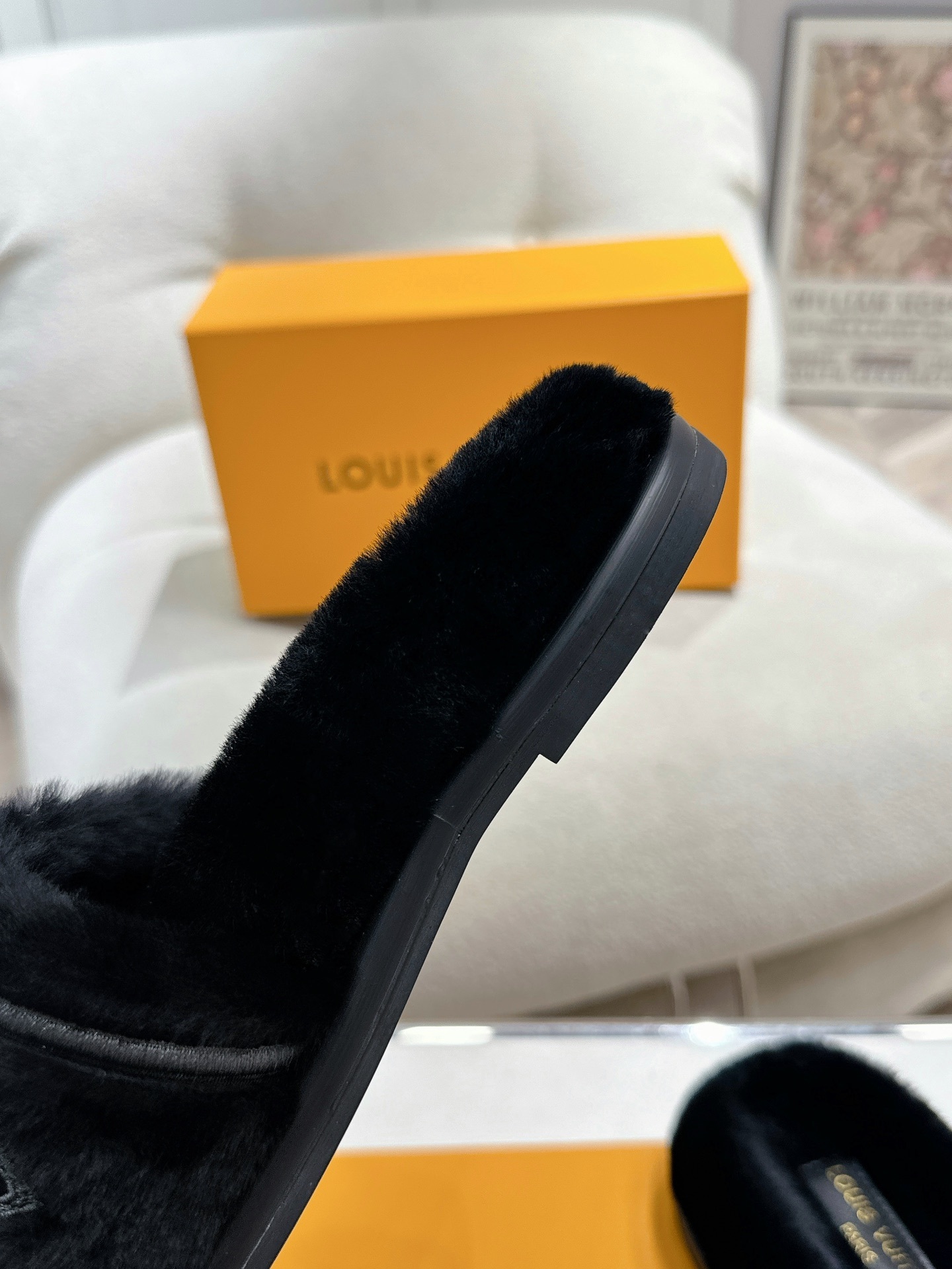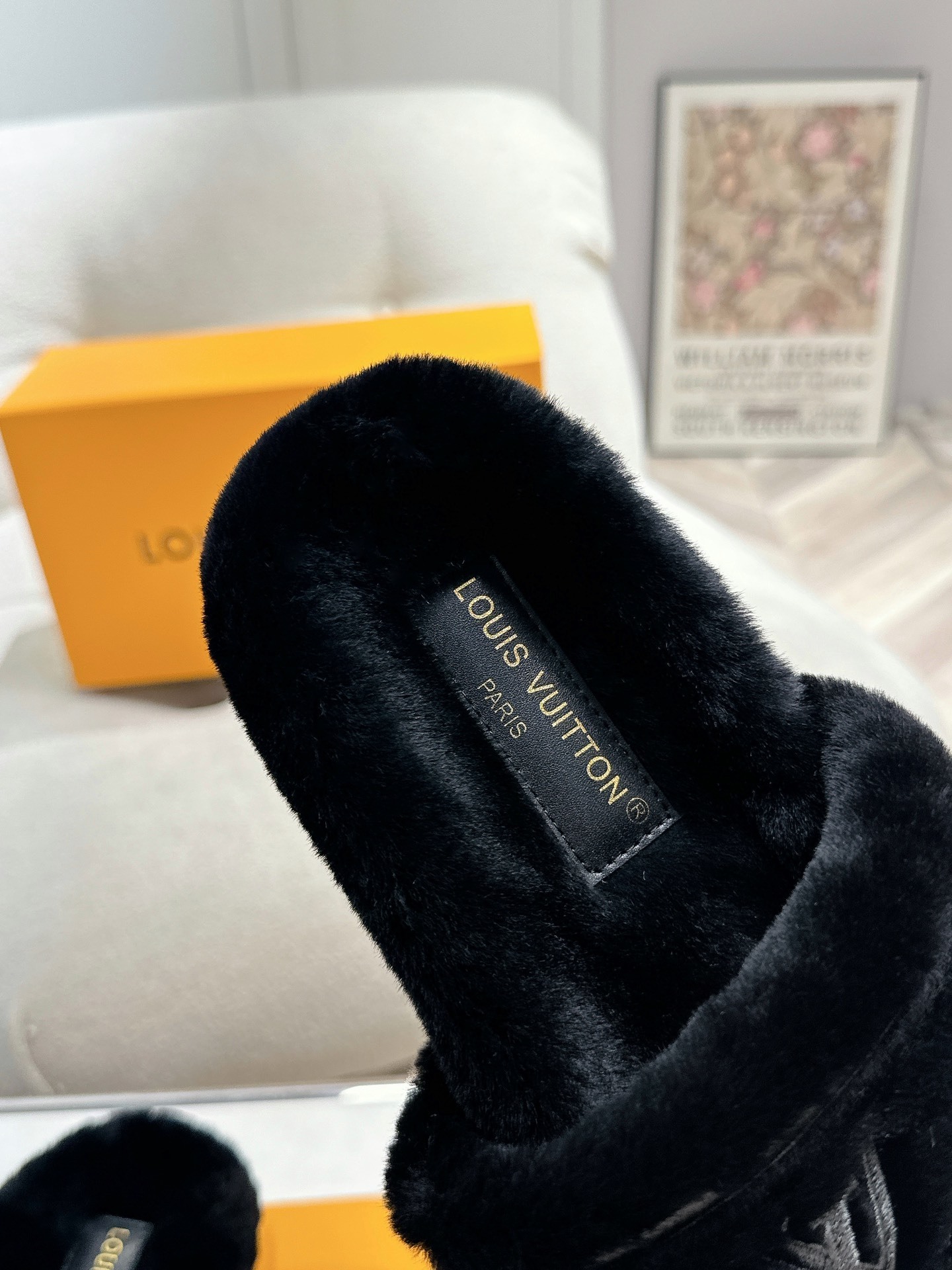 The Louis Vuitton LV Easy Mule With Fur Slippers in Black embodies refined comfort with a touch of timeless Parisian elegance. Crafted from ultra-soft shearling, these slip-on mules feature the signature LV Monogram embroidery across the strap for a sophisticated yet cozy look. The plush fur lining delivers unparalleled warmth and comfort, while the durable sole ensures effortless wear indoors or outdoors.